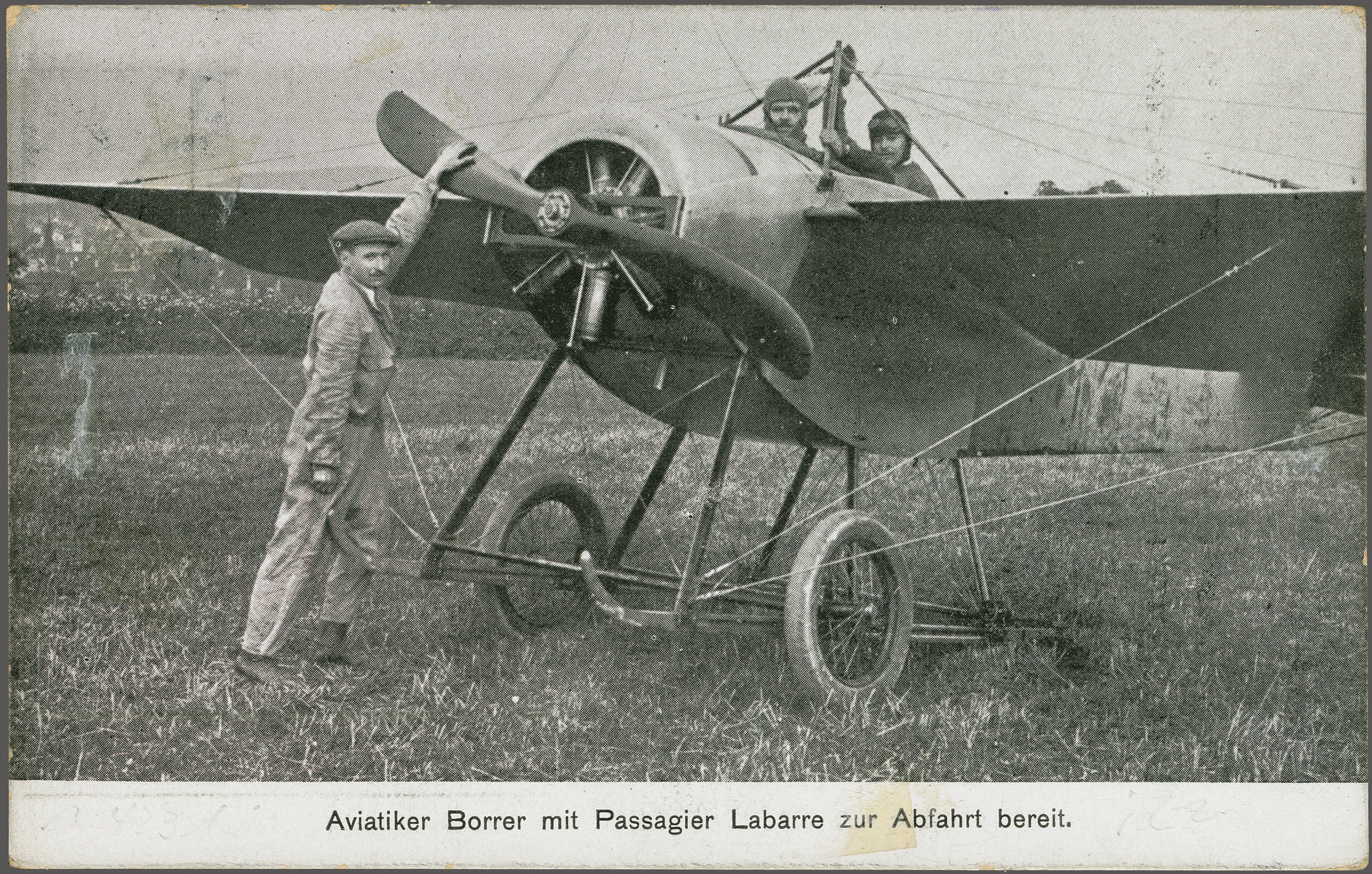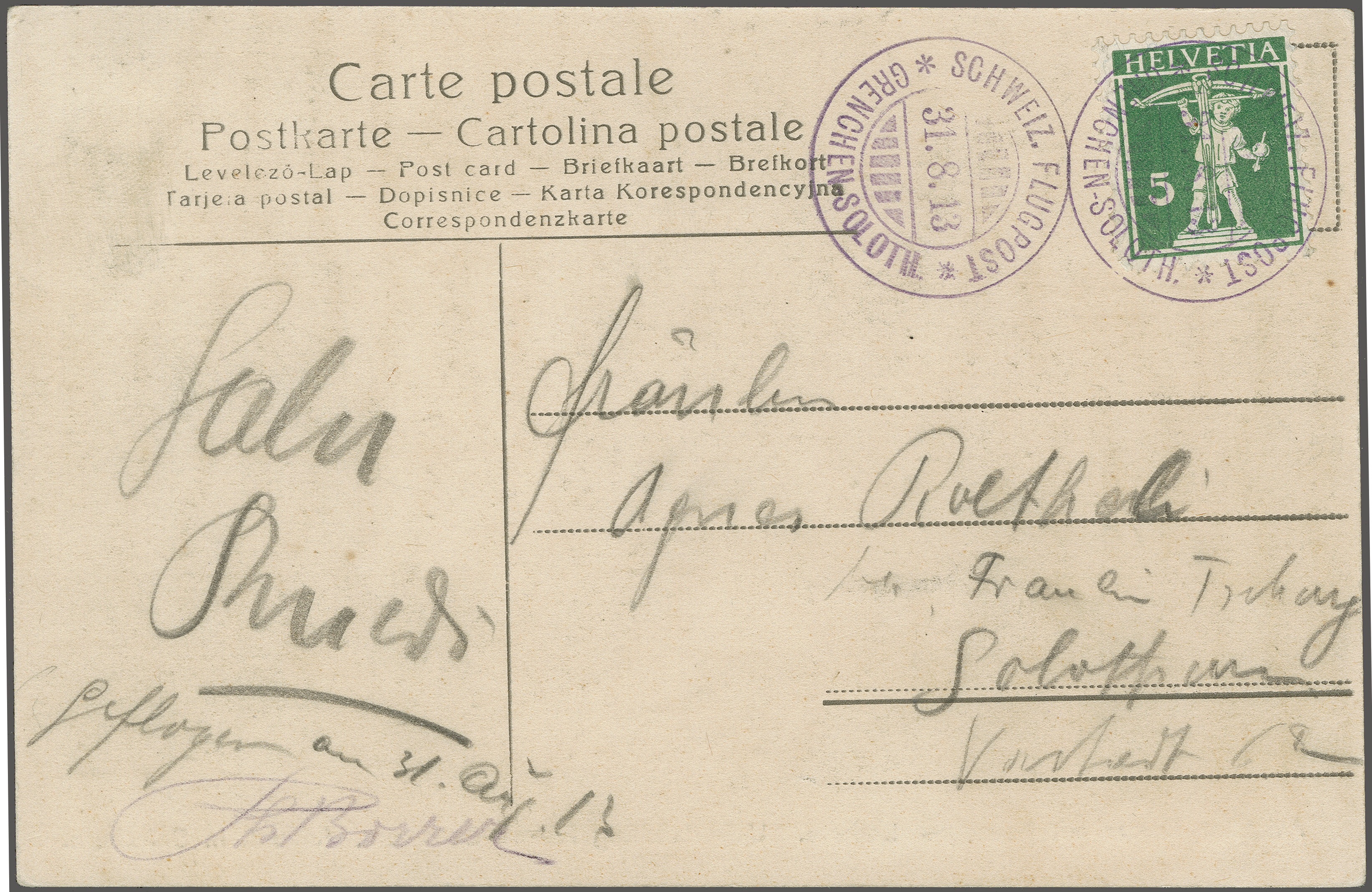 Flugtag Grenchen 1913 (31. Aug.): Tellknabe 5 Rp. grün (SBK 125/III), gut gez. und sauber entw. mit violettem SStp. "Schweiz. Flugpost / Grenchen-Solothurn", nebenges. wiederholt auf offizieller Karte Nr. 1 "Aviatiker Borrer