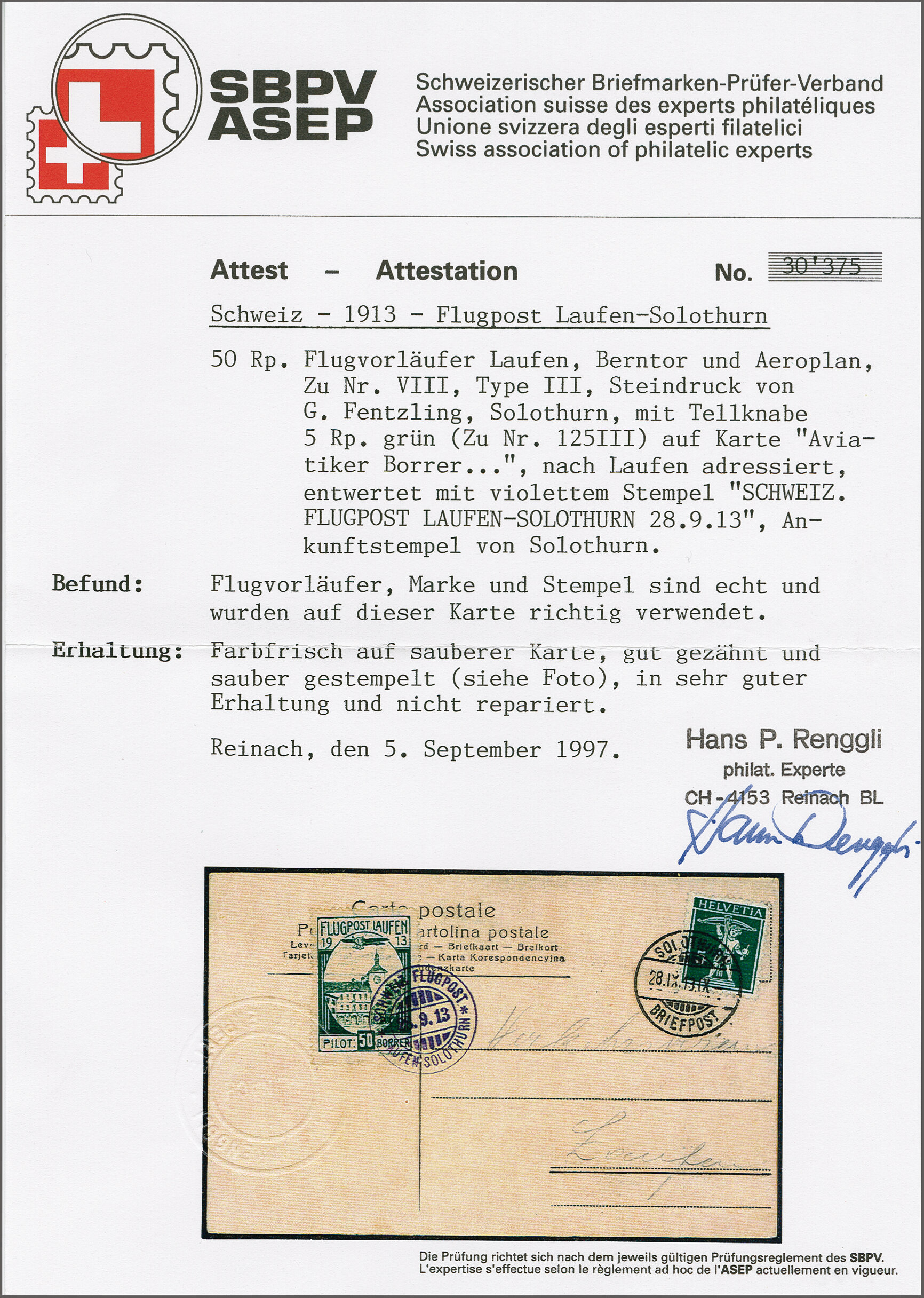 (SBK 125III), diese entw. mit AStp. c "Solothurn Briefpost 28.IX.13.IX" auf offizieller Karte Nr. 1 (etw. unfrisch) nach Laufen. Attest Renggli (1997). SLH=CHF 2'600 / SBK=CHF 2'900. (Image 1)