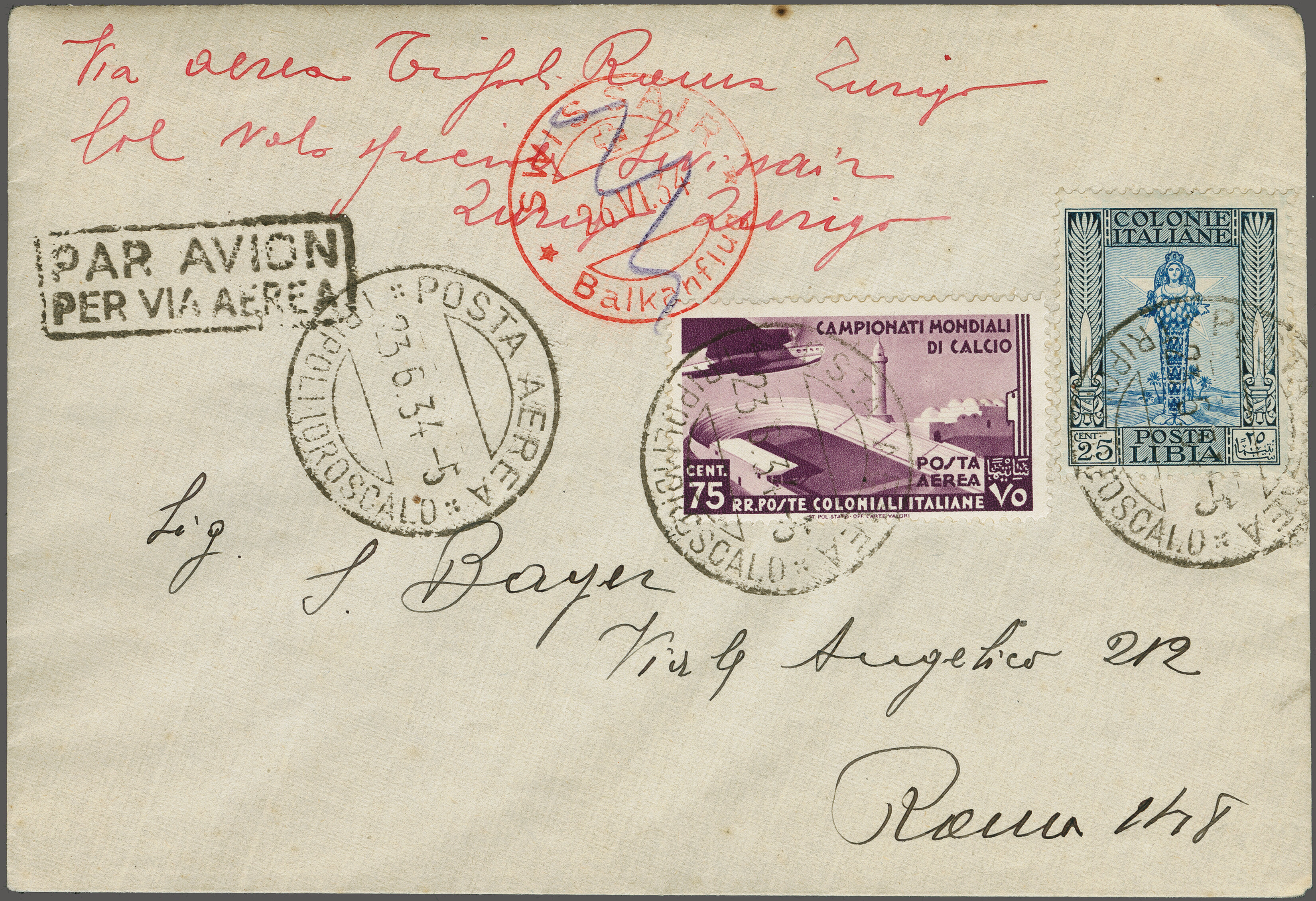 1934 (23. Juni): Balkanflug - Flugpostbrief von Tripoli nach Rom mit Leitvermerk "Via aerea Tripoli Roma Zurigo / col volo speciale Swissair Zurigo", Frankatur Libyen 25 c. blau und 75 c. Calcio entw. "POSTA AEREA /