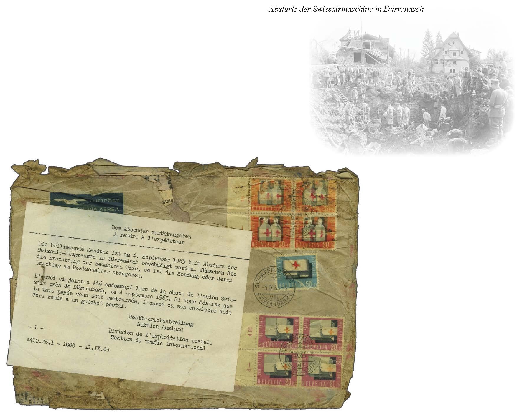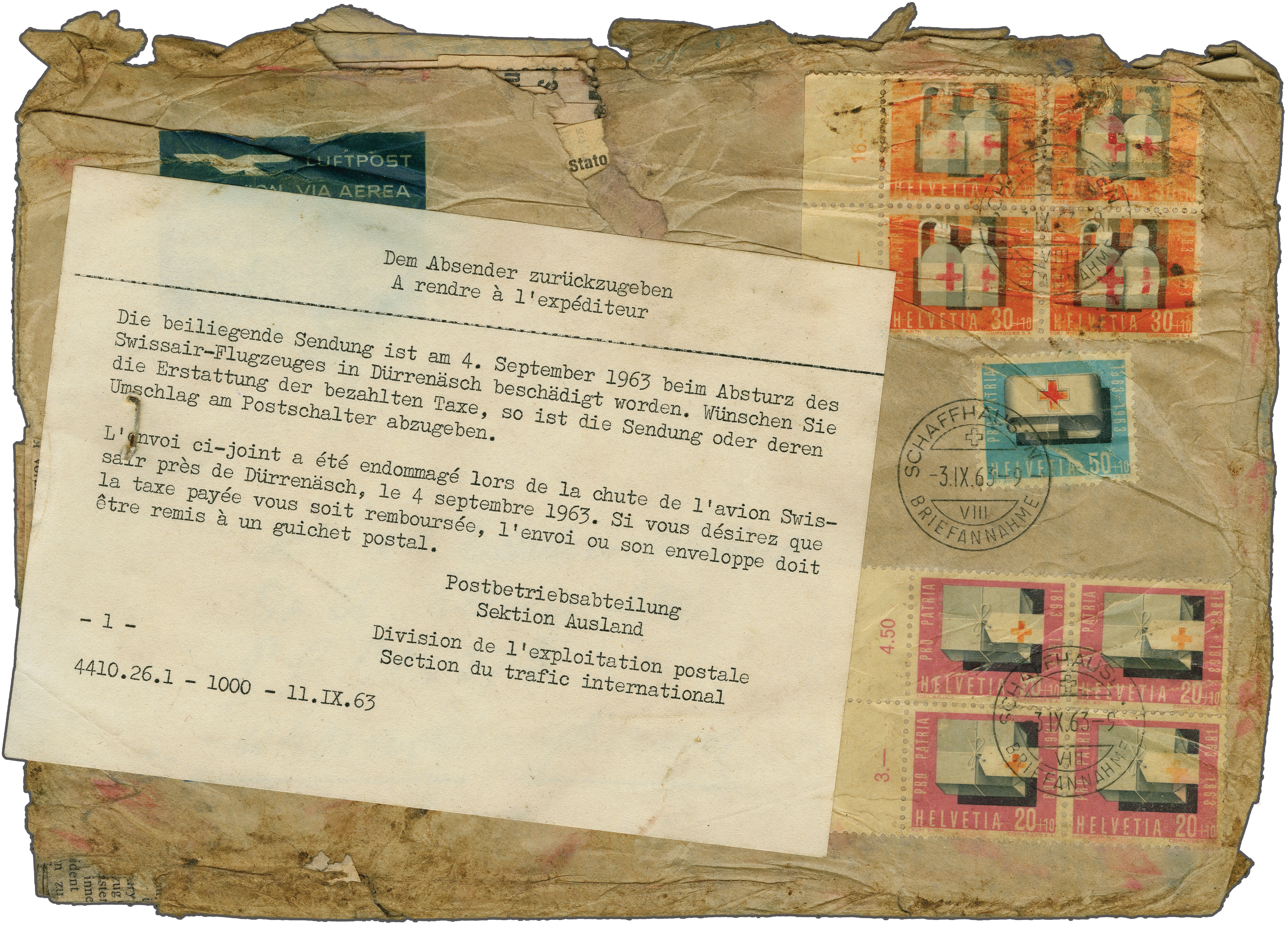 der Schweizerpost zurück an den Absender, gest. "Schaffhausen 1 14.IX.63". Unfallbrief mit Löschwasserschaden, jedoch mit vollst. Pro Patria Frankatur zu Fr. 2.50. Ein gut erhaltener und seltener Absturzbeleg SLH UF.A7.a = CHF 1'500. (Image 1)