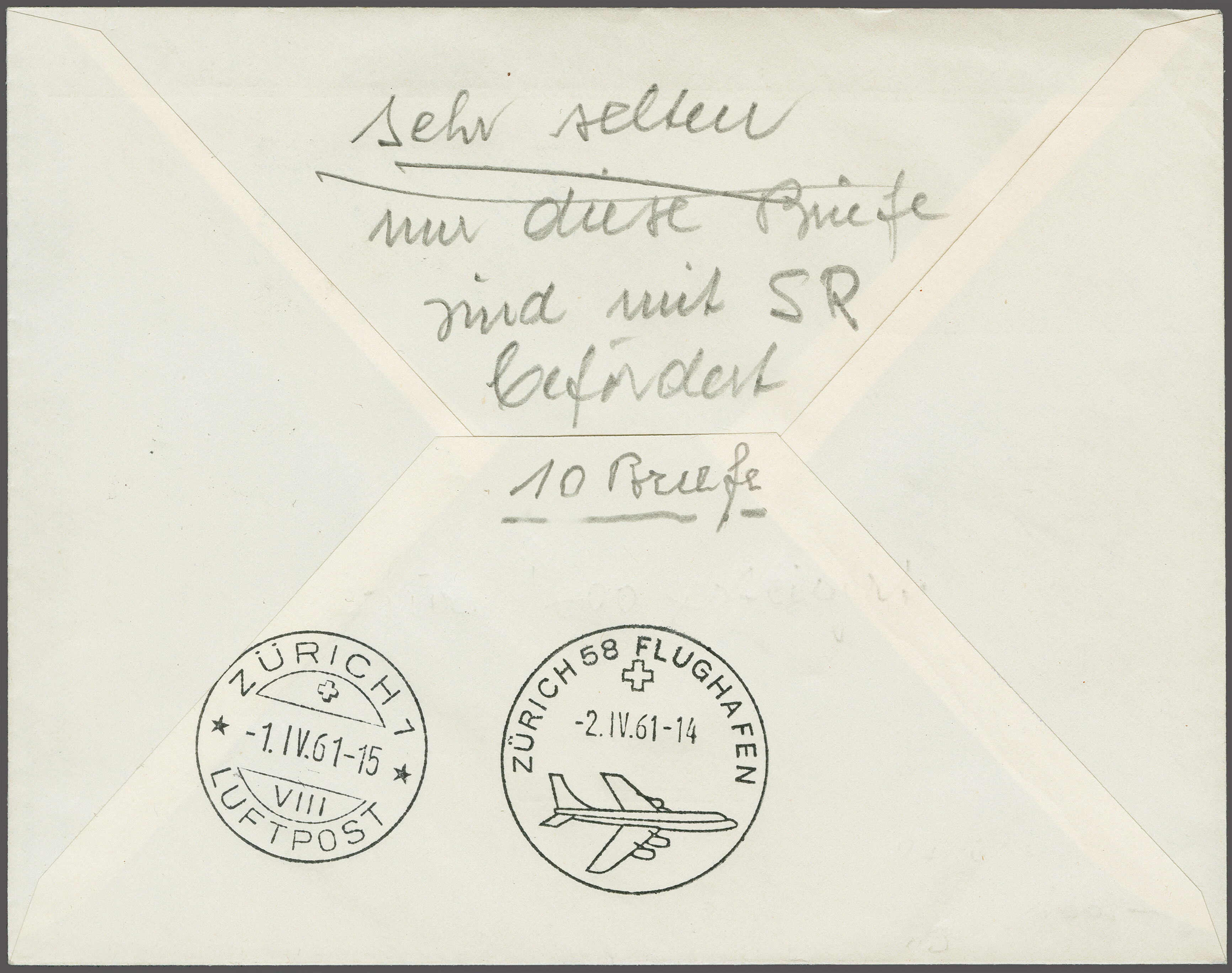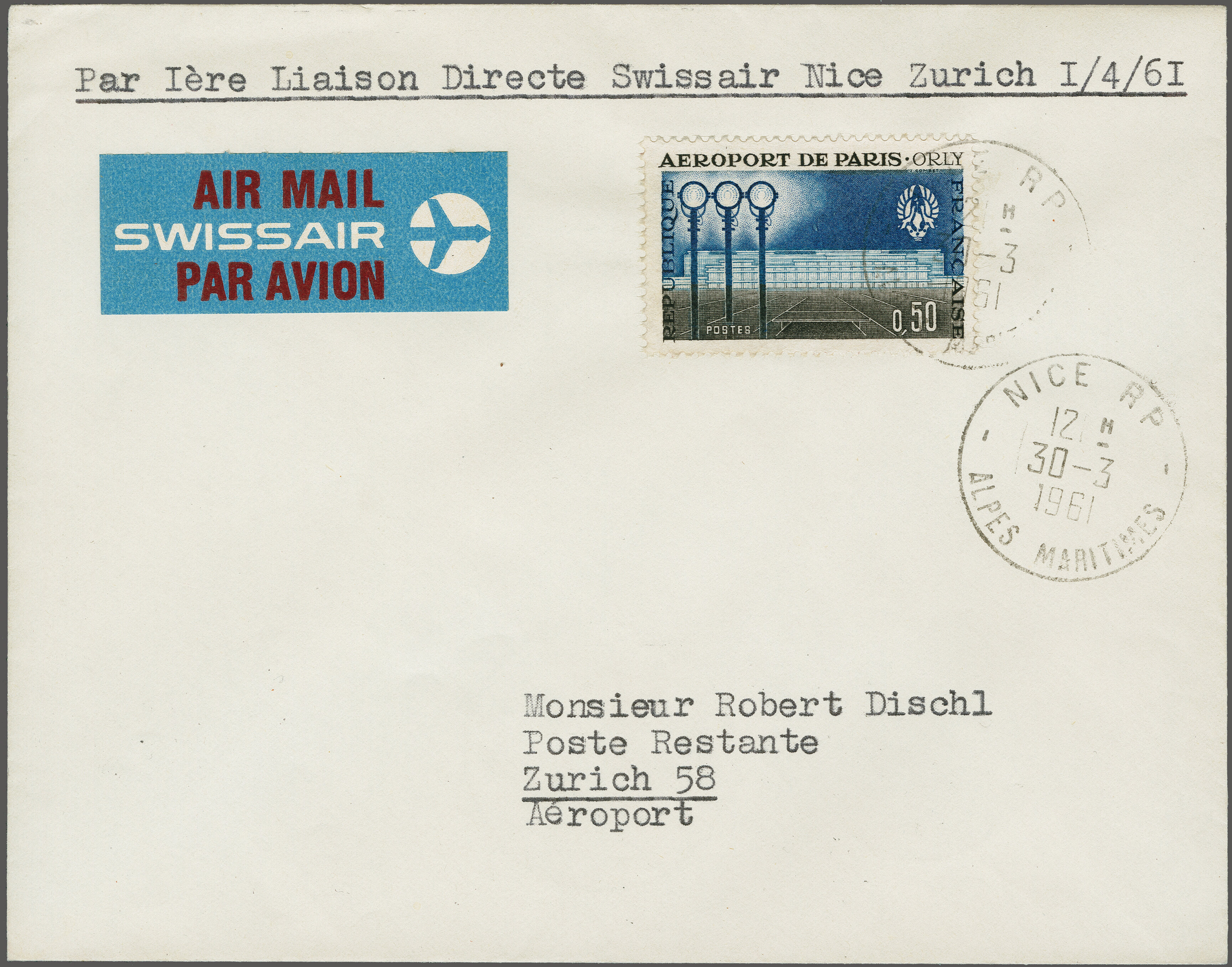 Erstflug Zürich- Nizza 1961 (1. April): Brief vom Rückflug Nizza - Zürich mit rücks. AStp. "Zürich 1 Luftpost 1.IV.61-15" sowie Zürcher Flughafenstp. "Zürich 58 2.IV.61-14". Sehr seltener Erstflugbeleg aus der bekannten Dischl
