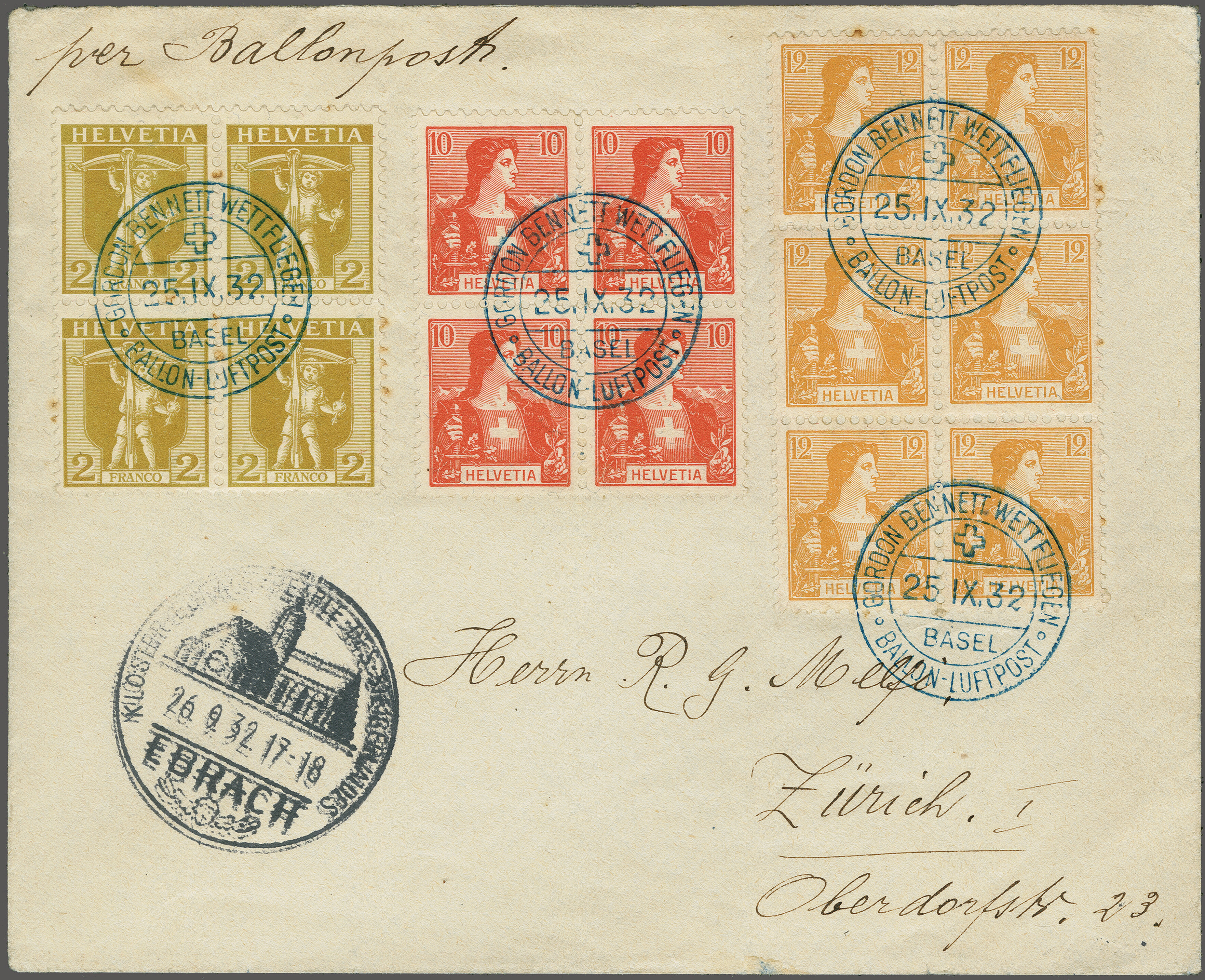 1932 (25. Sept.): Ballonpost Gordon-Bennett-Wettfahrt Basel-Ebrach: Brief frankiert mit Tellknabe im Rahmen 2 Rp. oliv (SBK 102) und Helvetiabrustbild I, 10 Rp. rot (SBK 104), je im Viererblock sowie Helvetiabrustbild I, 12