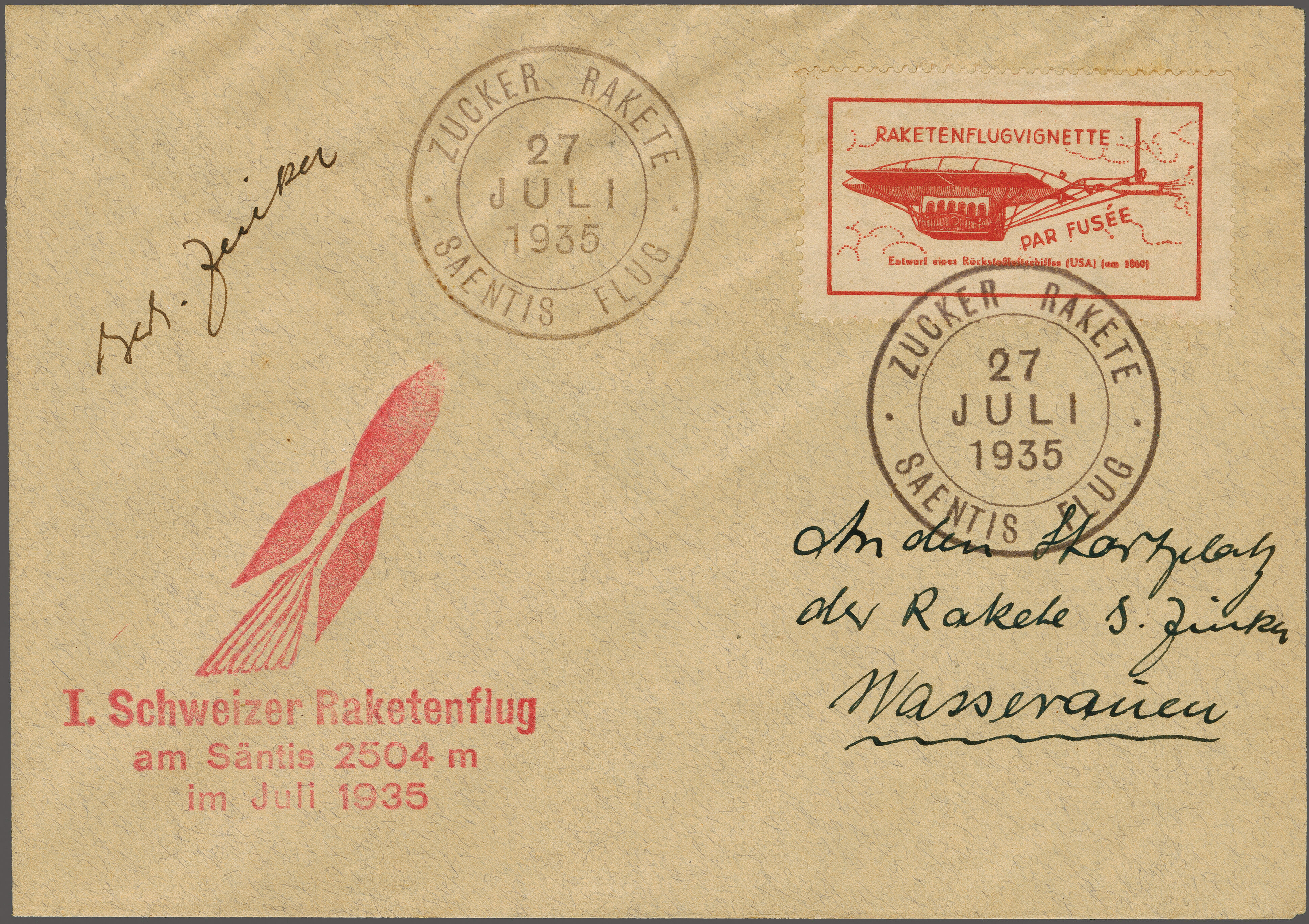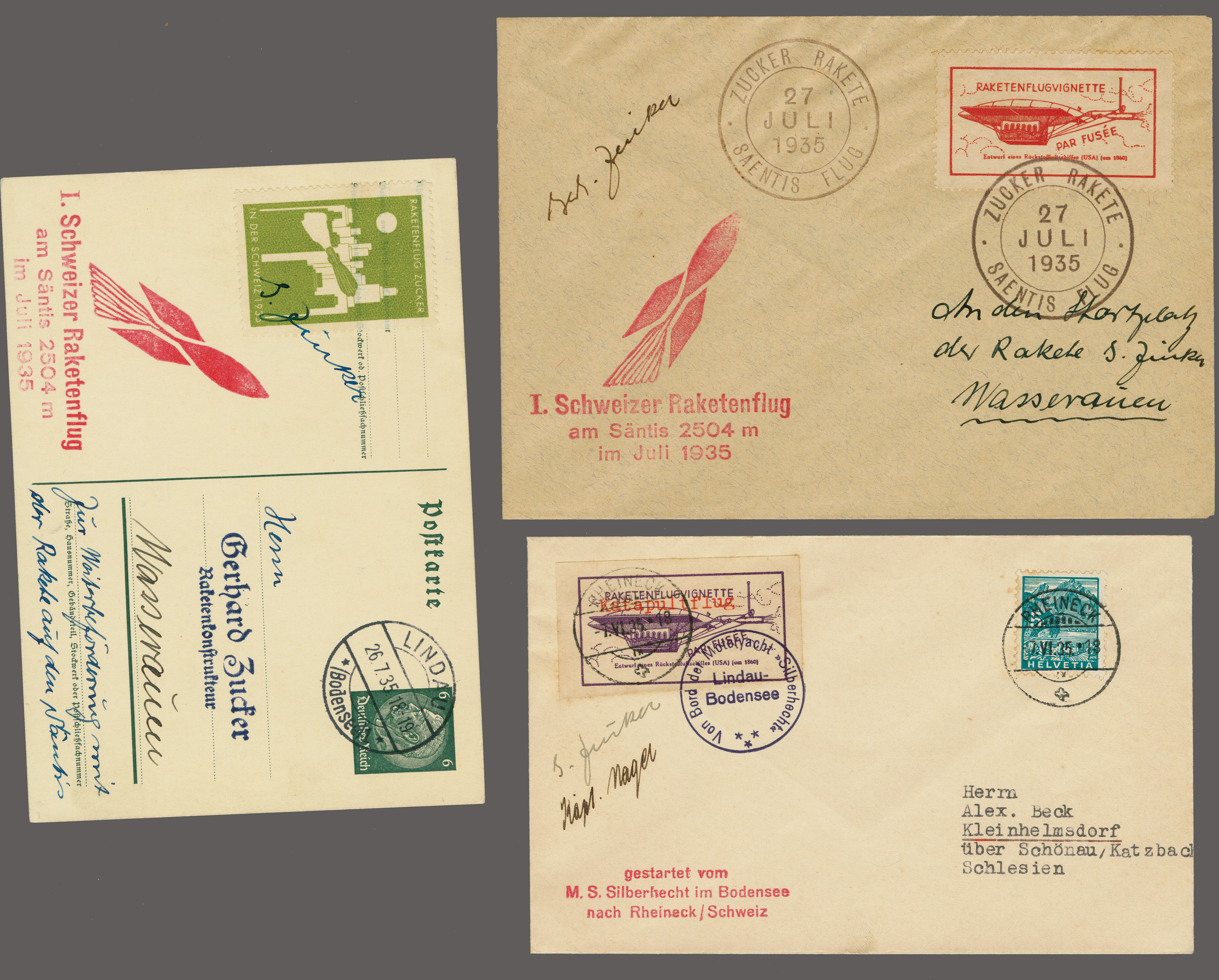 1935: Raketenflug-Versuche G. Zucker in der Schweiz (Silberhecht, Nachtflug, Säntis): Lot 3 versch. Briefe/Karten mit Vign. aus SF 35.2-4, gezähnt und ungezähnt, je in tadelloser Erhlatung. SLH = CHF 1'850. (Image 1)