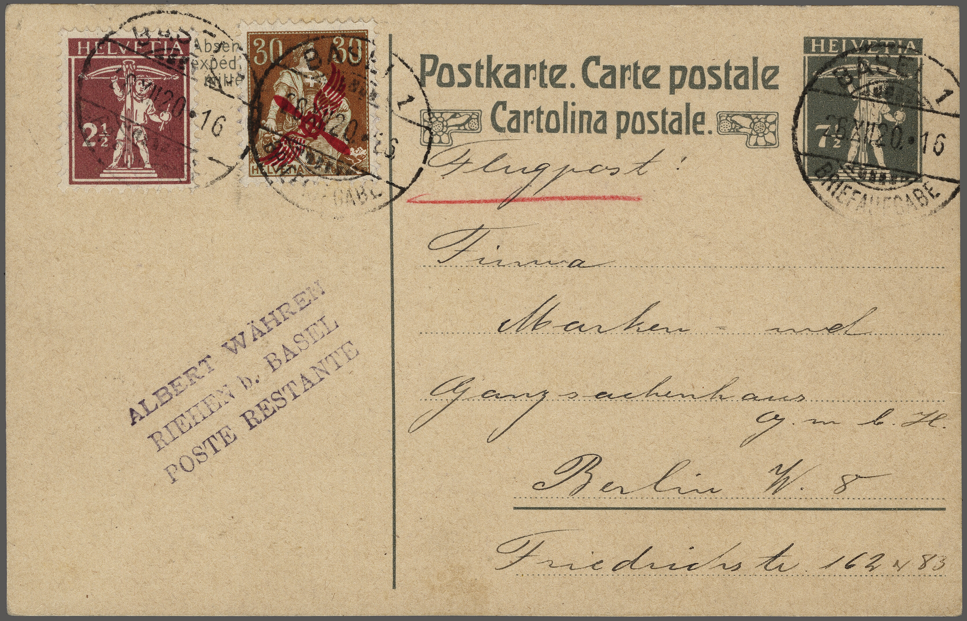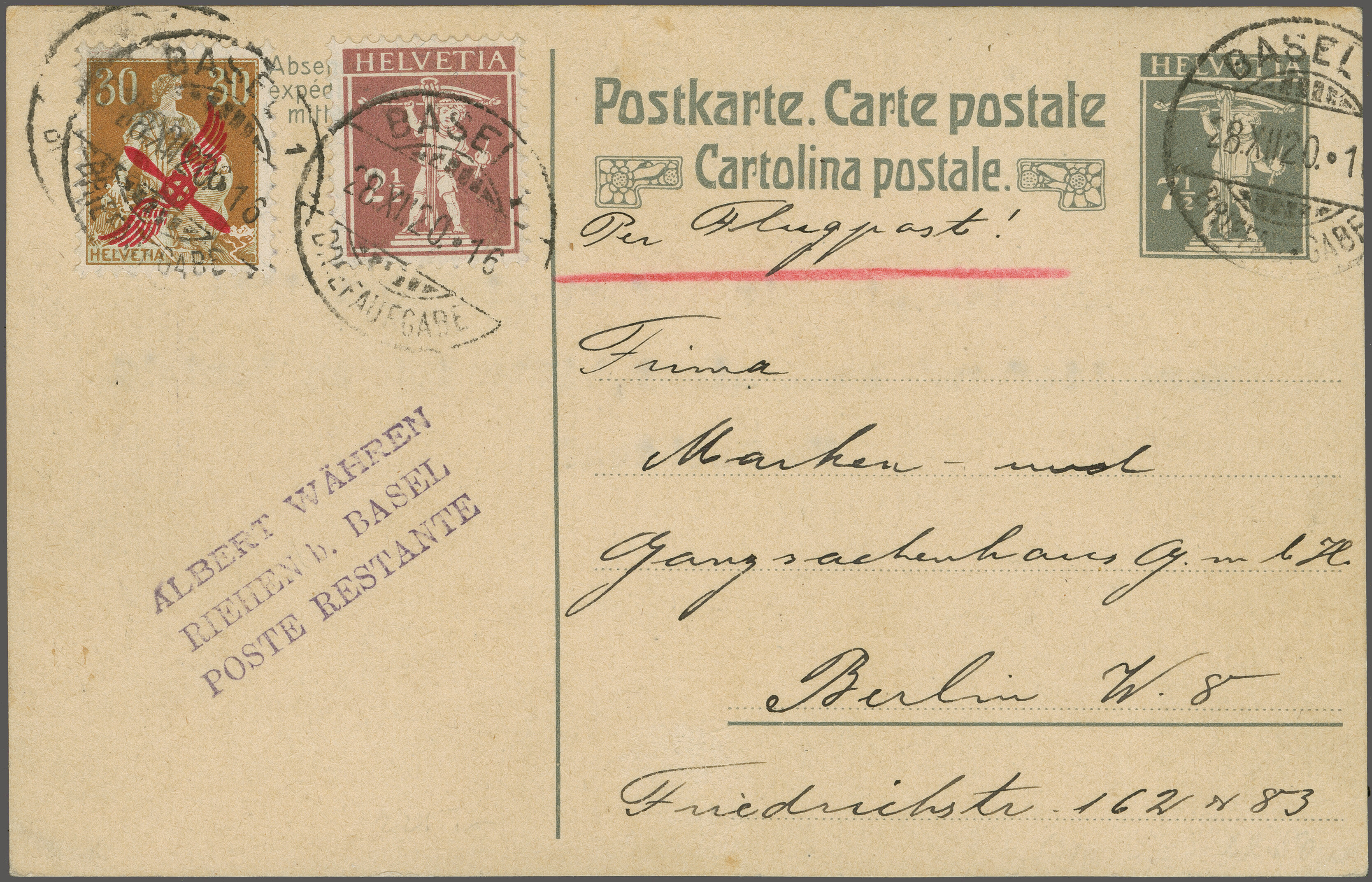 "Basel 1 Briefaufgabe 28.XII.20-16" mit handschriftl. Vermerk "Flugpost!" nach Berlin adressiert. Ursprünglich zum BALUG-Flug nch Frankfurt aufgeliefer, wie allzu oft infolge Ausfalls des nur fünf Tage später definitiv eingestellten Betriebes aber