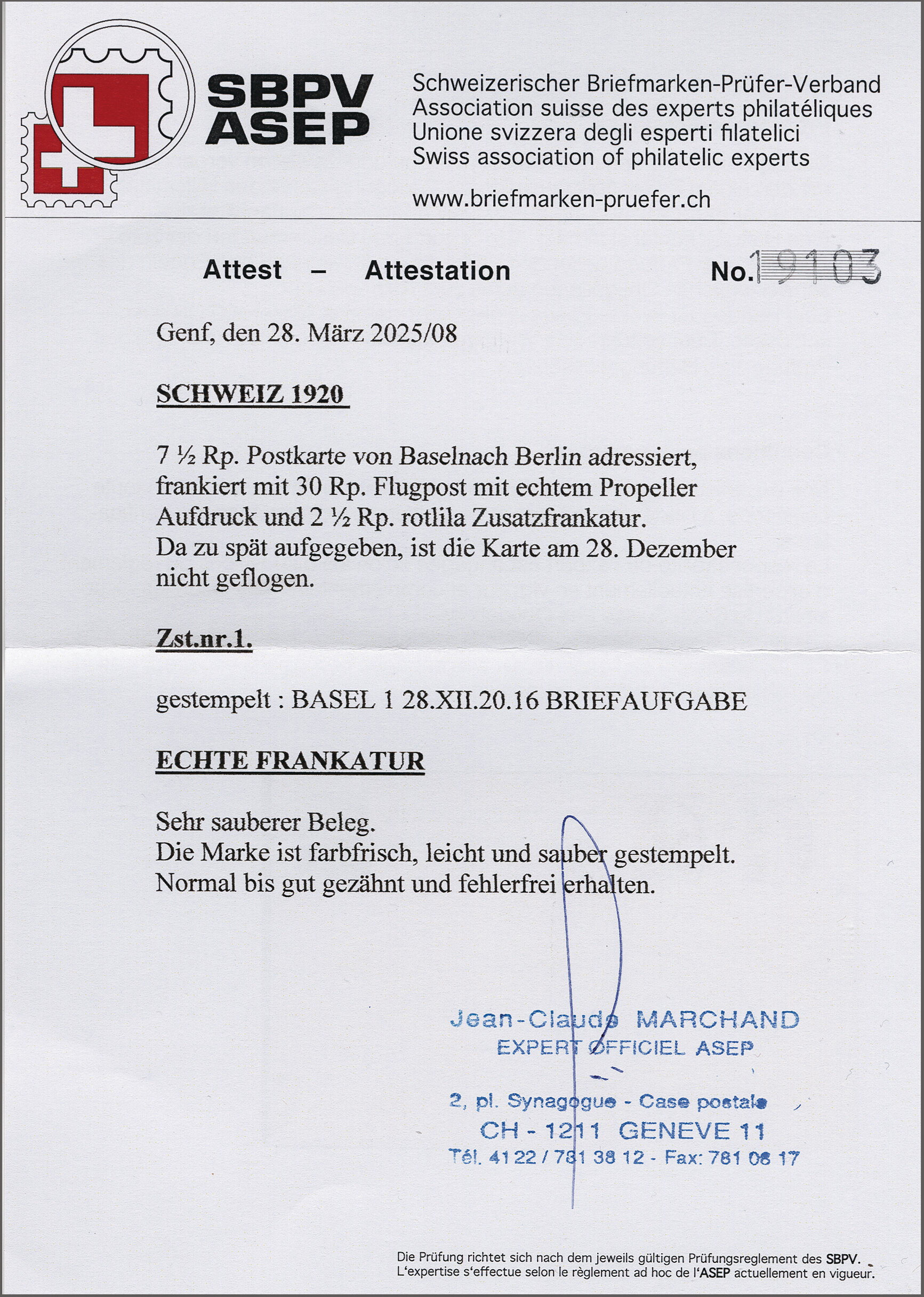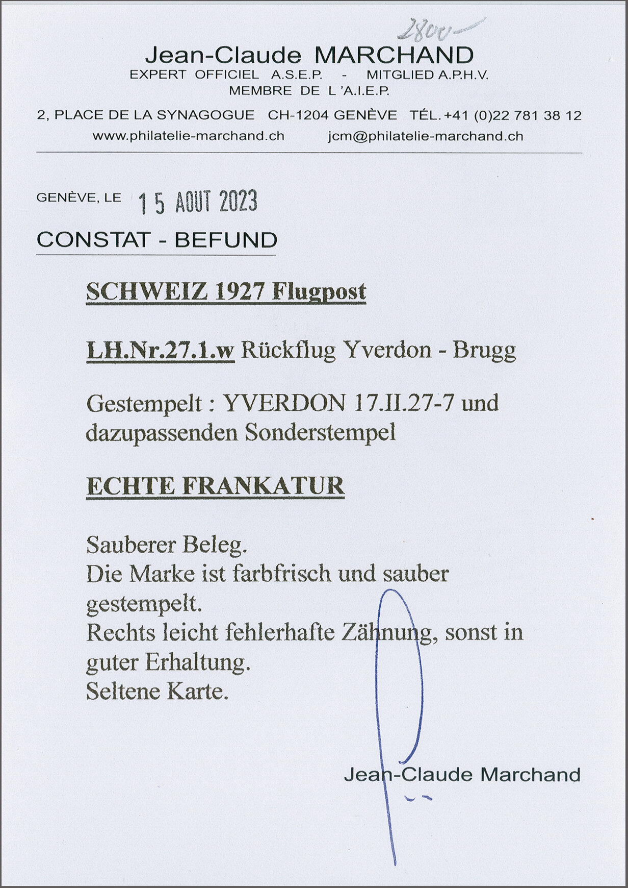 mit portogerechter Frankatur Flugpost 25 Rp. entw. "YVERDON 17.II.27" nach Olten. Befund Marchand (2023) SLH = CHF 2'800. (Image 1)