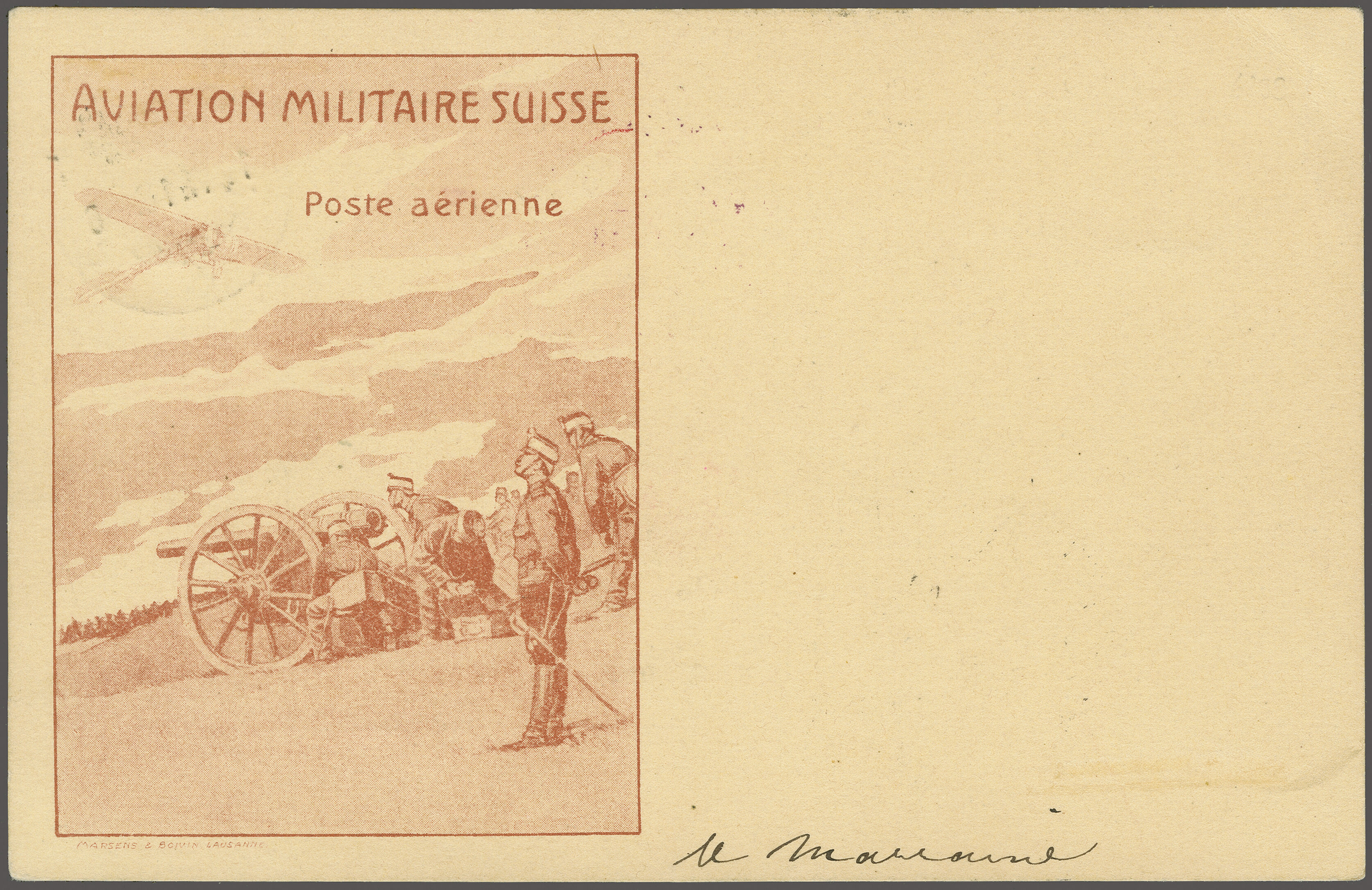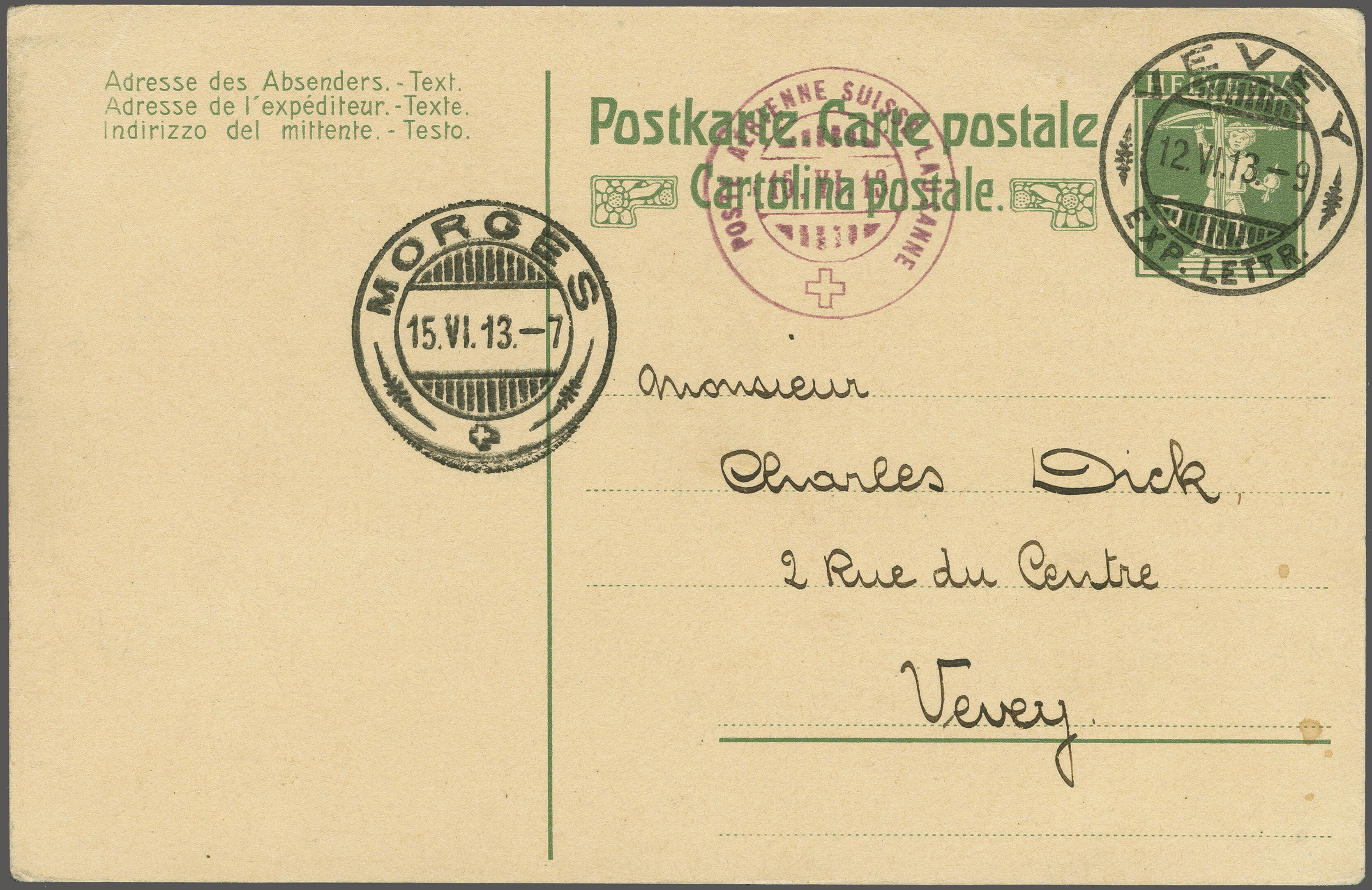 Flugtag Lausanne, Aufgabe Vevey 1913 (15. Juni): Offizielle Karte "Aviation Militaire Suisse" mit beigef. violettem KStp., mit Aufgabestp. "Vevey Exp. Lettr. 12.VI.13-9" und AStp. "Morges 15.VI.13-7" nach Vevey adressiert.