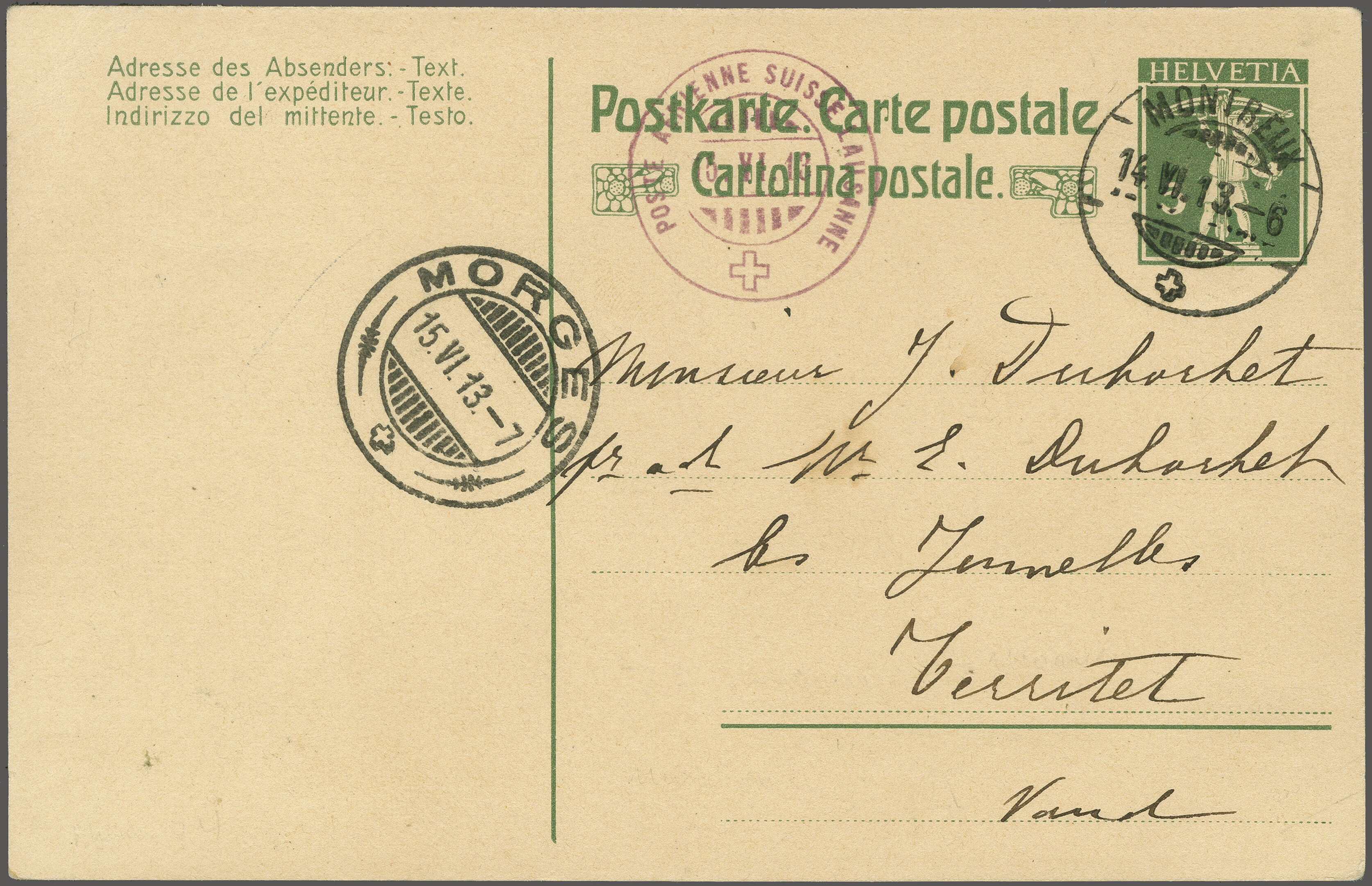 Flugtag Lausanne, Aufgabe Montreux 1913 (5. Juni): Offizielle Karte "Aviation Militaire Suisse" mit beigef. violettem KStp., mit Ausgabestp. "Montreux 14.VI.13-6" und AStp. "Morges 15.VI.13-7" nach Territet adressiert.