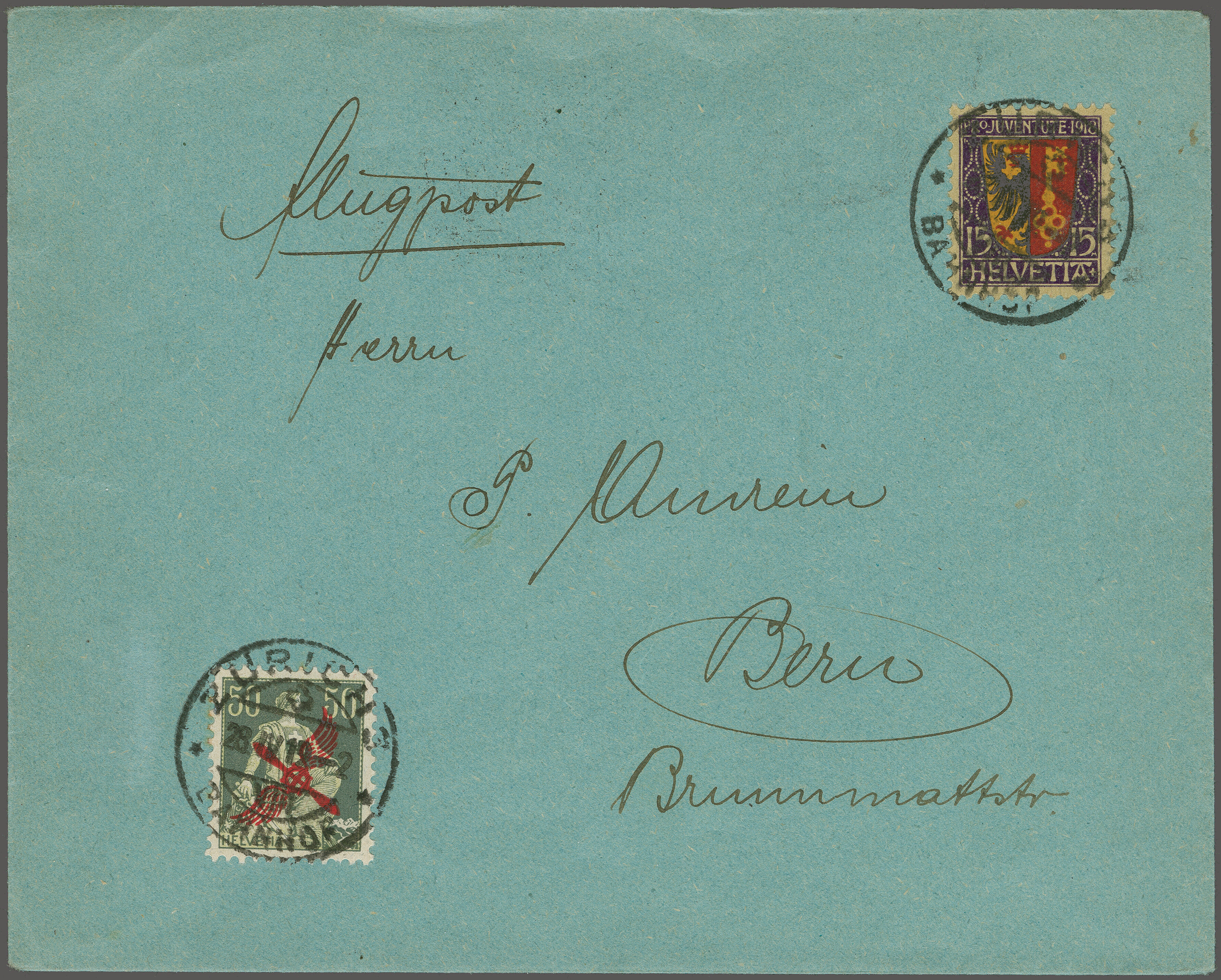 1919 (30. April): Erstlug Zürich - Bern: Brief ab "Zürich 3 Bahnhof 28.IV.19-2" frankiert mit Flügelrad- und Propelleraufdruck 50 Rp. (SBK F2) und Pro Juventute 1918, 15 Rp. "Genf" (SBK J11) nach Bern. Rücks. AStp. "Schweizer
