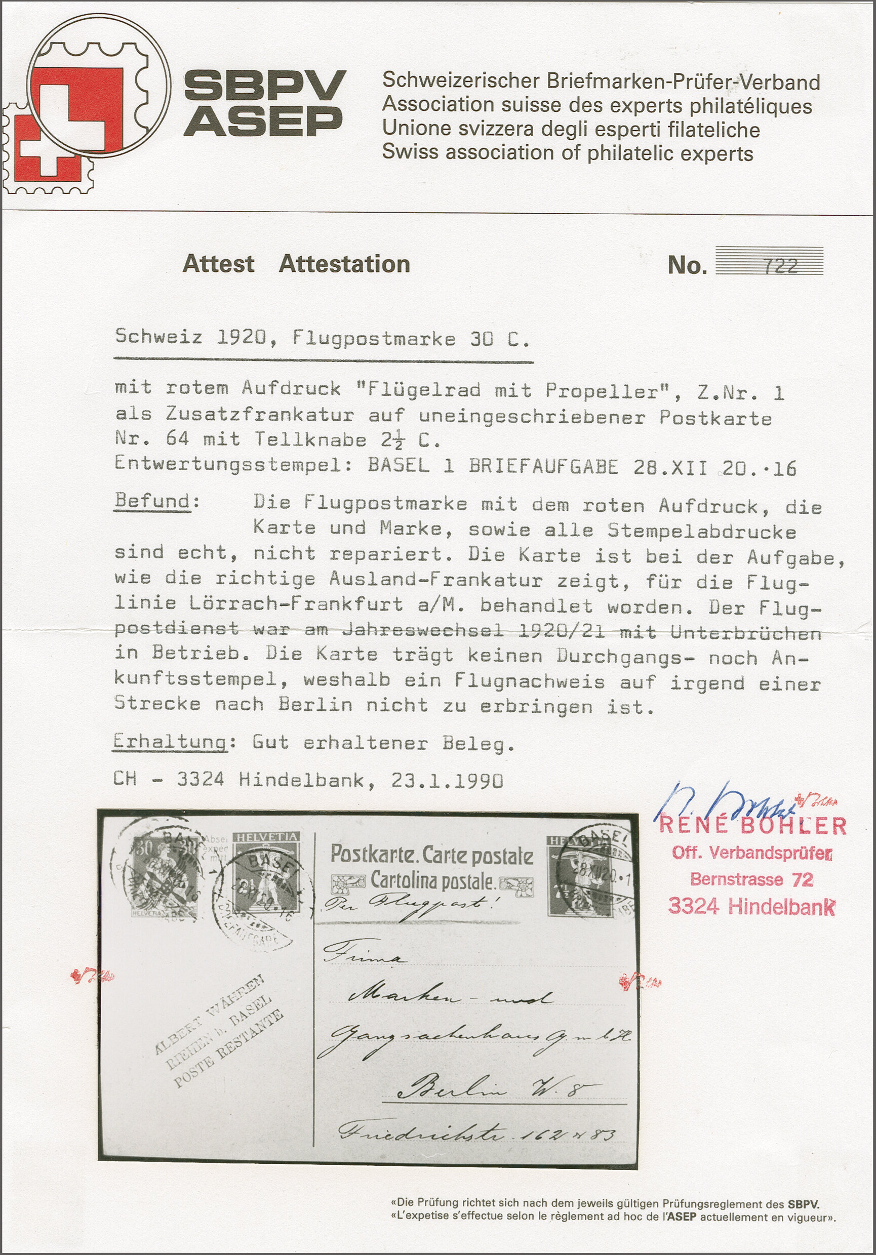 BALUG-Linie Frankfurt - Mannheim - Karlsruhe - Lörrach (Basel): 7½ Rp.-Ganzsachenpostkarte mit Zusatzfrankatur Tellknabe 2½ Rp. bräunlichlila (SBK 136) und Flugpost "Flügelrad- und Propelleraufdruck" 30 Rp. (SBK F1) ab "Basel