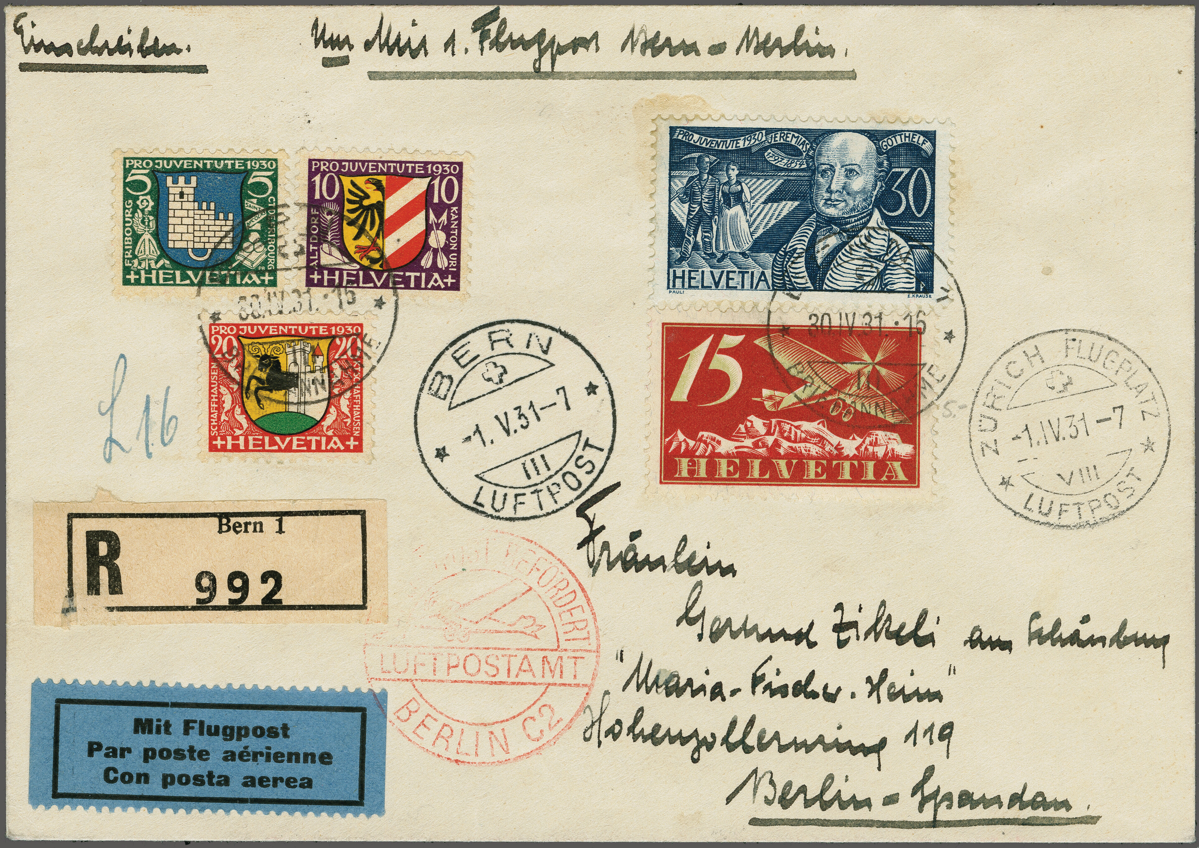 Swissair/Lufthansa Bern-Zürich-Stuttgart-Halle/Leipzig-Berlin 1931 (1. Mai): Eingeschreibener Brief ab "Bern 1 Briefannahme 30.IV.31-16" frankiert mit kpl. Satz Pro Juventute 1930 5-30 Rp. und Luftpost "Symoblische
