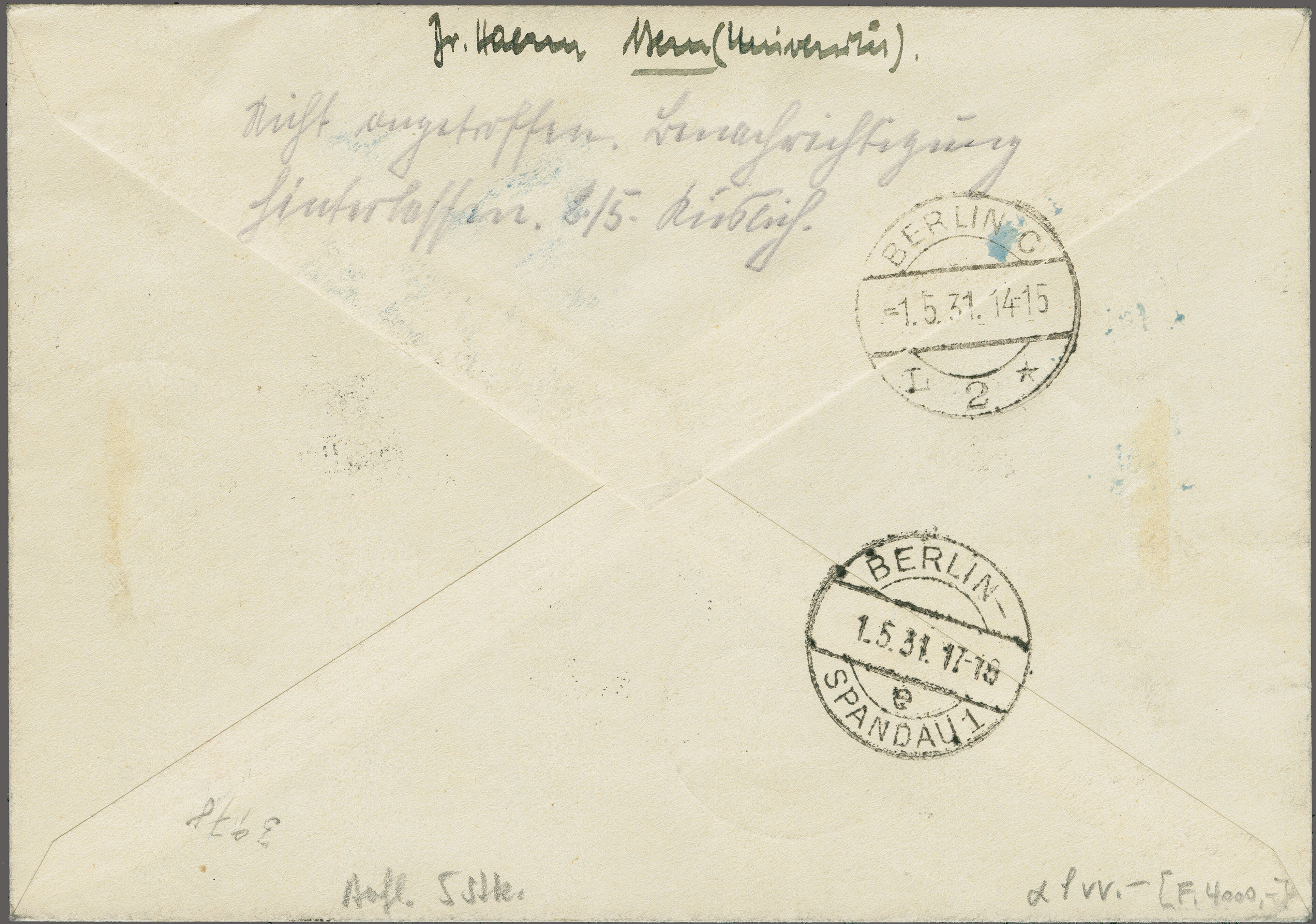 hinterlassen 2./5." sowie Stp. "Berlin Spandau 1 1.5.31 17-18" vom zweiten Zustellversuch. Ein sehr seltener Erstflug, befS ca. 5. SLH=CHF 4'000. (Image
