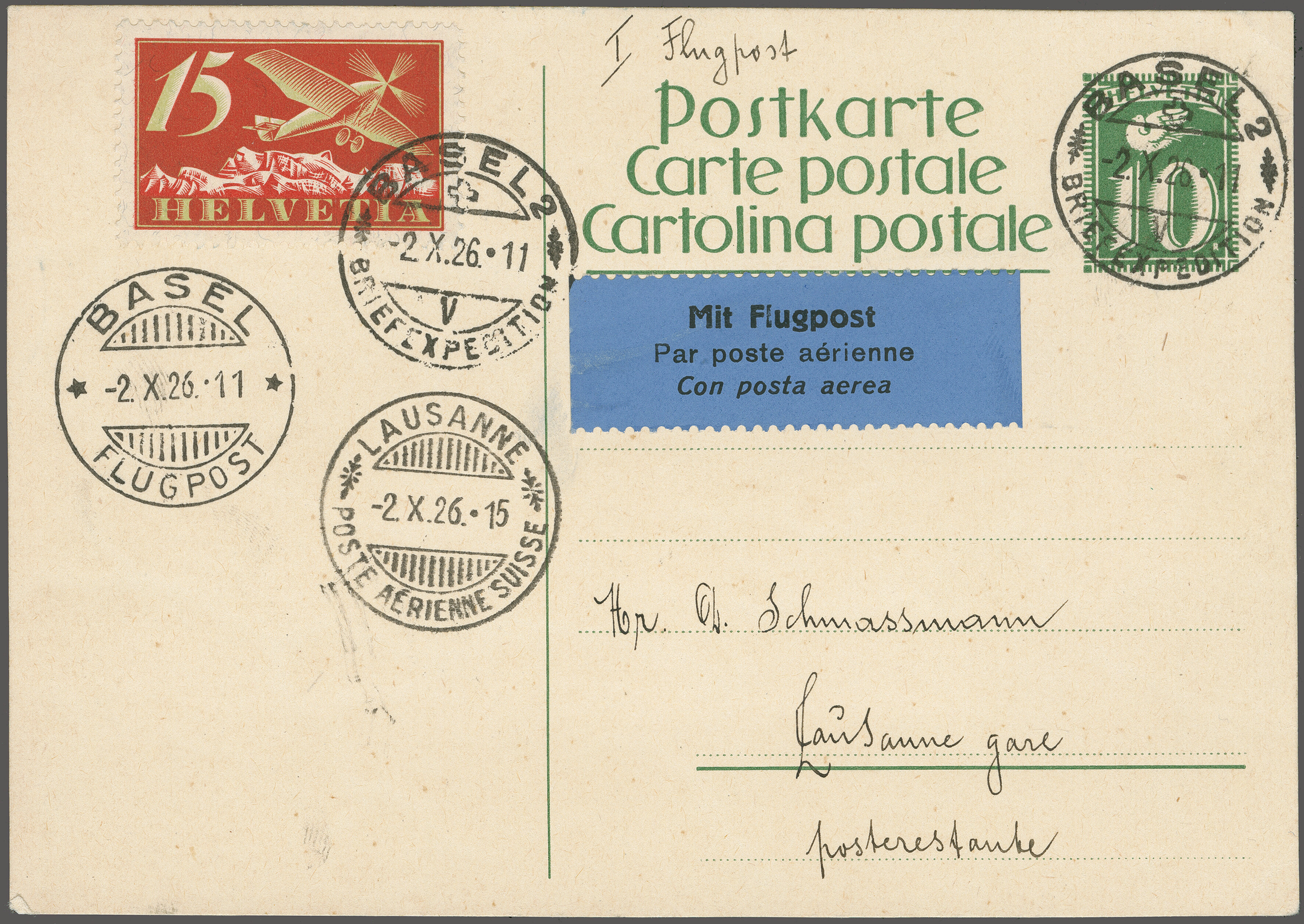 Balair Flug Basel - Lausanne 1926 (2. Okt.): 10 Rp. Ganzsachenpostkarte mit portogerechter Zusatzfrankatur Luftpost "Symbolische Darstellungen" 15 Rp. ab "Basel 2 Briefexpedition 2.X.26-11" mit Aufgabestp. "Basel Flugpost