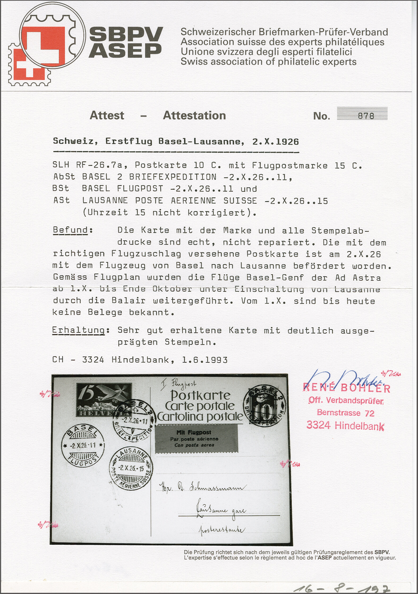 2.X.26-11" sowie vorders. AStp. "Lausanne Poste Aérienne Suisse -2.X.26-15", postlagernd an die Poststelle Lausanne Gare adressiert. Eine ansprechende Karte dieses äusserst seltenen Fluges; Attest Bohler (1993). befS 8. SLH=CHF 8'000. (Image 1)