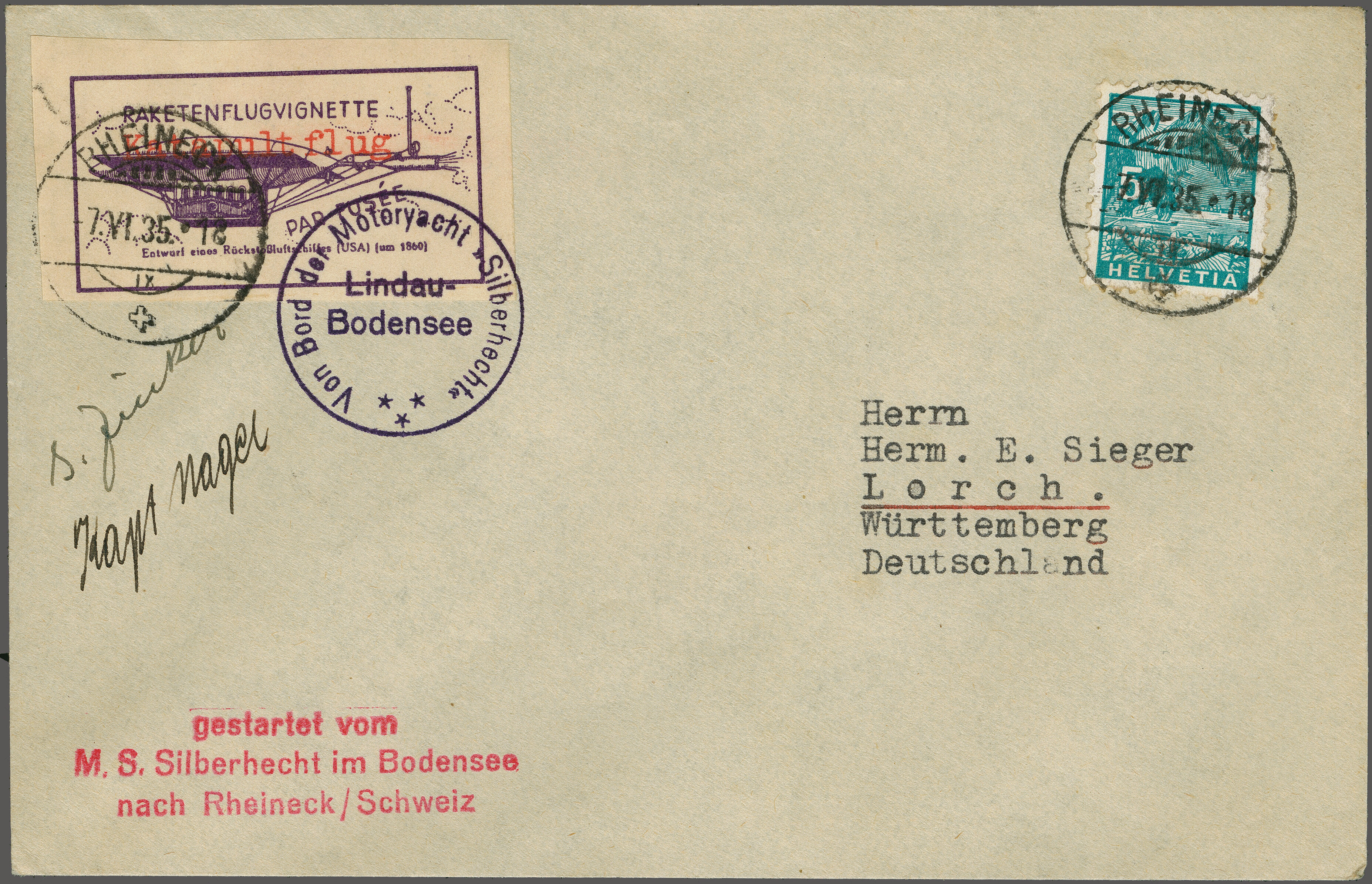 1935 (7. Juni): Raketen-Versuchsflug von Bord der MS "Silberhecht" auf dem Bodensee, Brief frankiert mit 5 Rp., bei Postaufgabe gest. "Rheineck 7.VI.35-18", sowie einer ungezähnten Vignette mit Aufdruck 'Katapultflug', sauber