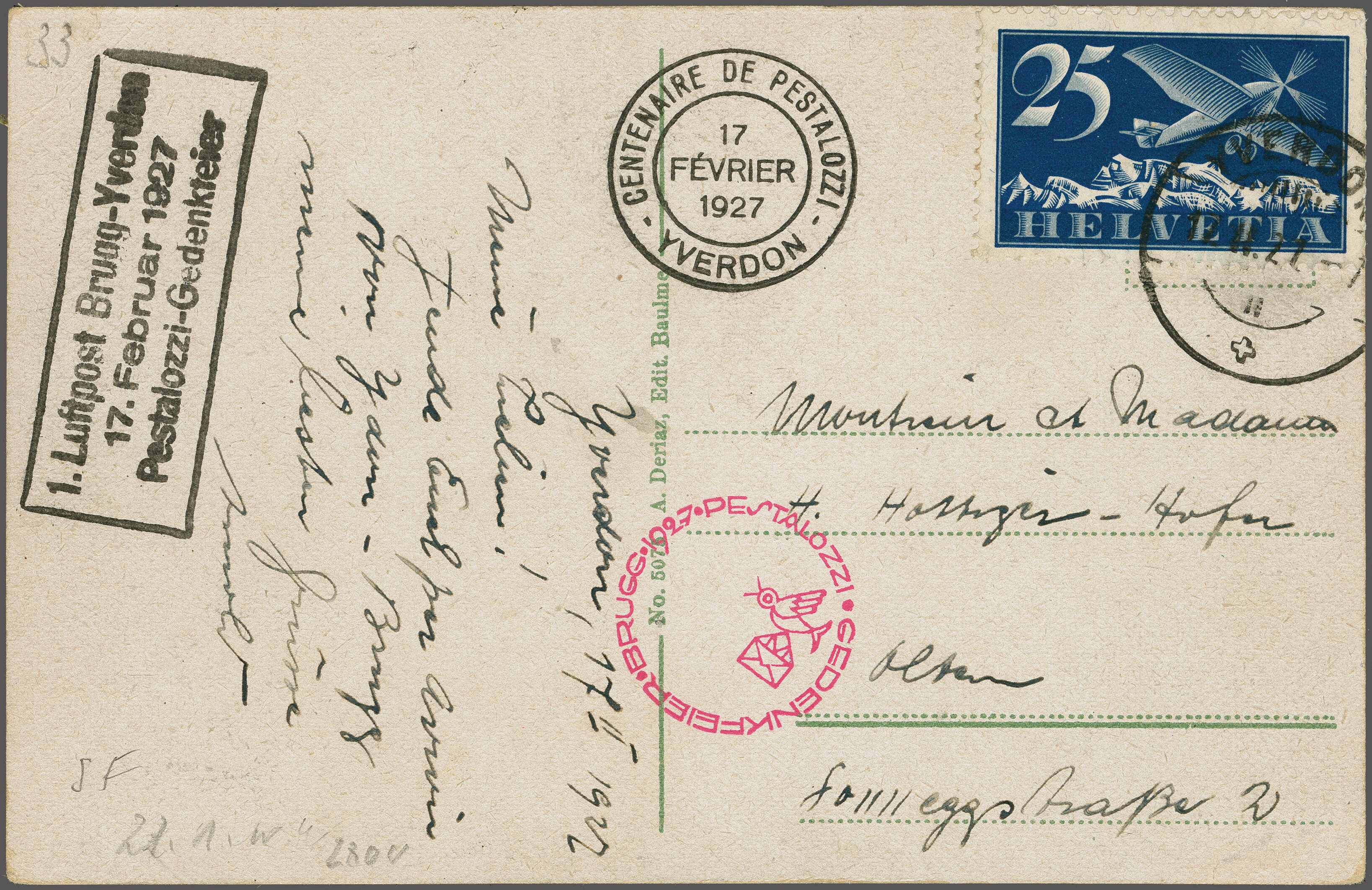 1927 (17. Feb.): Pestalozzi Gedenkfeier Luftpost Yverdon - Brugg 'CENTENAIRE DE PESTALOZZI / YVERDON' mit Handstp. "1. Luftpost Brugg - Yverdon 17. Februar 1927 / Pestalozzi-Gedenkfeier" auf entsprechender Bildpostkarte, Brief