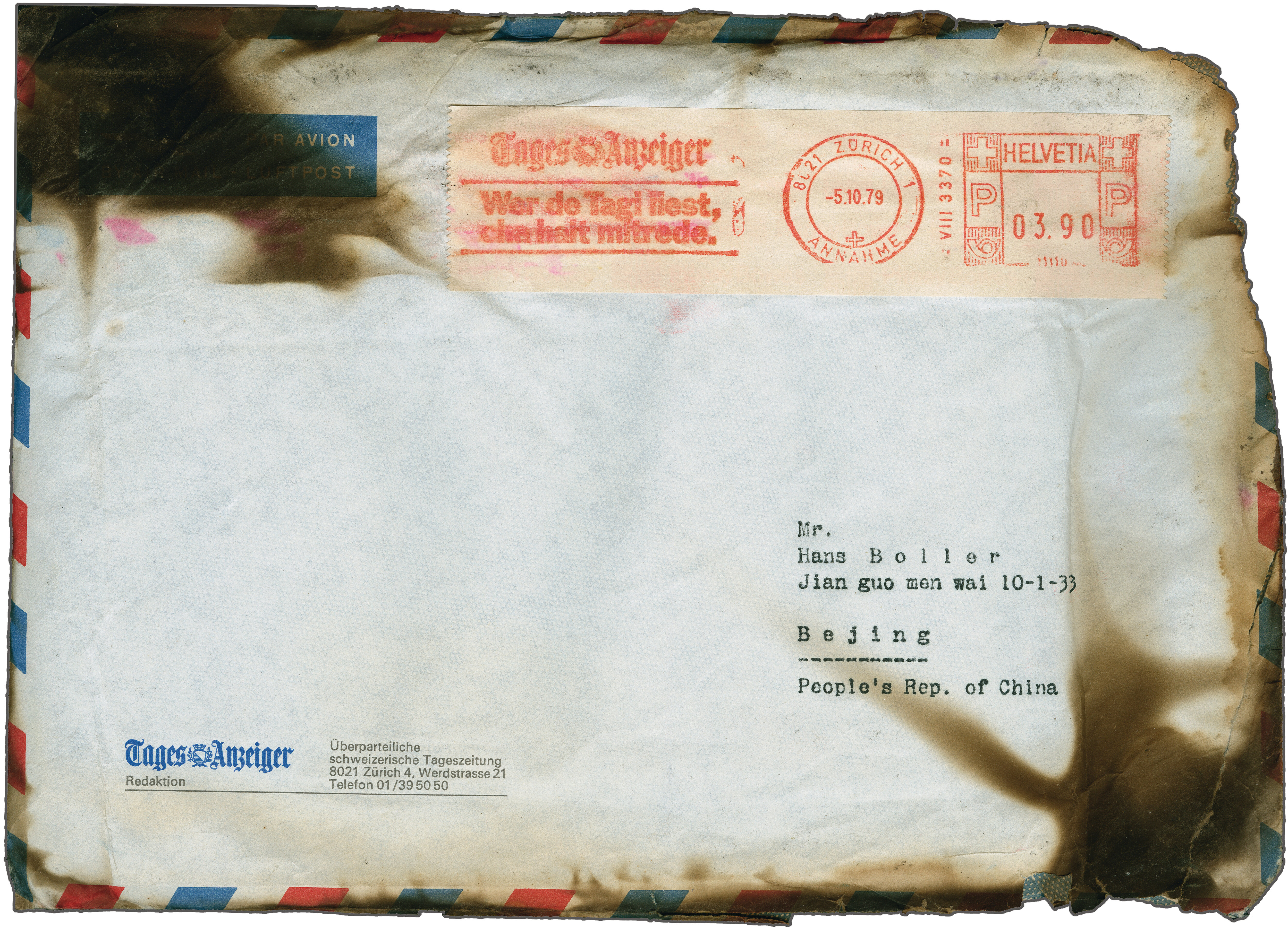 1979 (7. Okt.): Mehrfachgewichtiger Brief ab Zürich frankiert zu Fr. 3.90 mit Franco-Zettel des Tagesanzeigers adressiert an Redaktor Hans Boller in Peking und Infolge des Absturzes zusammen mit Begleitschreiben der Post in