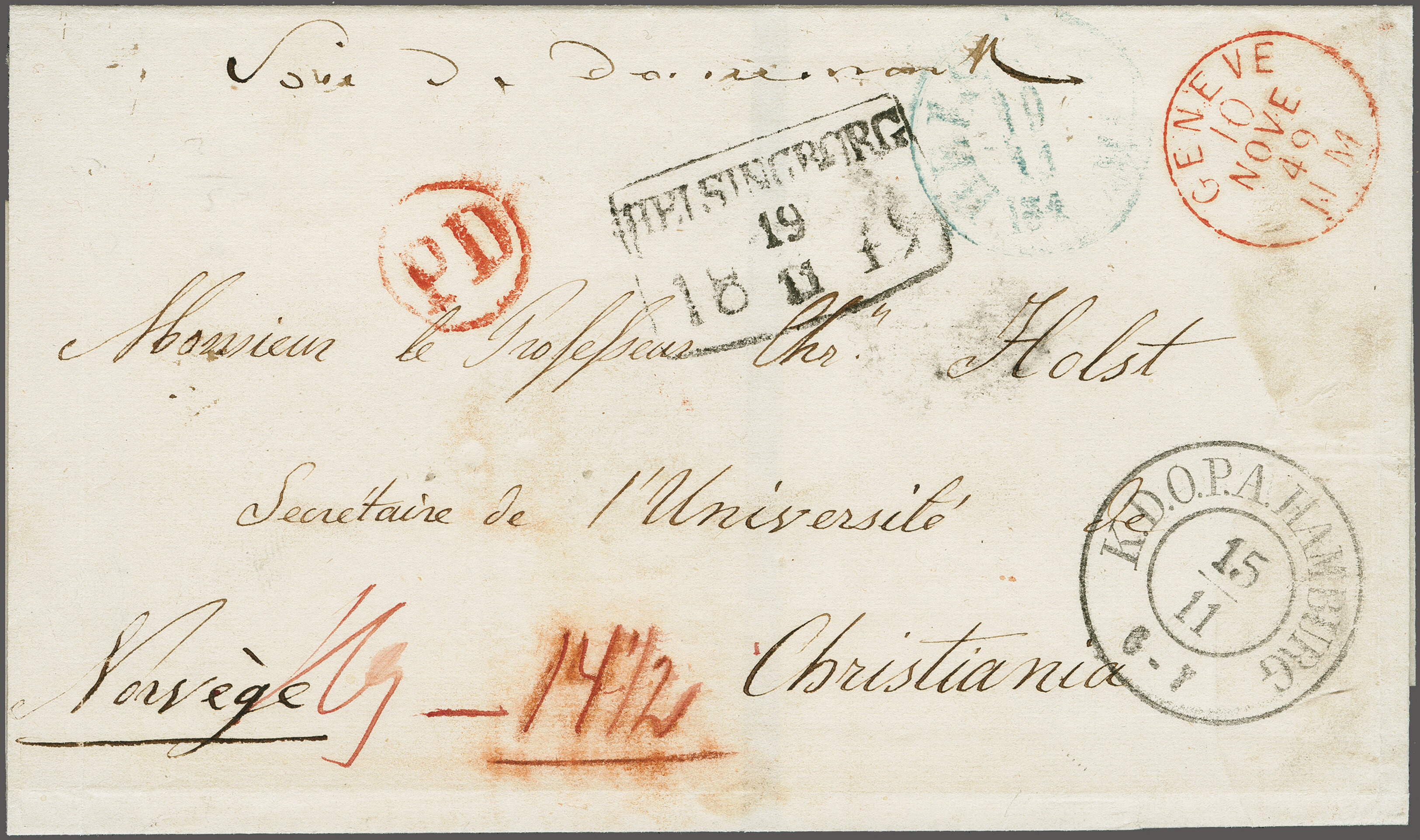 1849 (10. Nov.): Vollständig vorausbezahlter Faltbrief von Genf nach Christiania (Norwegen) mit handschriftlichem Leitvermerk "Voie de Danemark", Einkreisstp. "GENÈVE 10 NOVE. 49 11M" sowie "PD" im Kreis, beide in rot. Rücks.