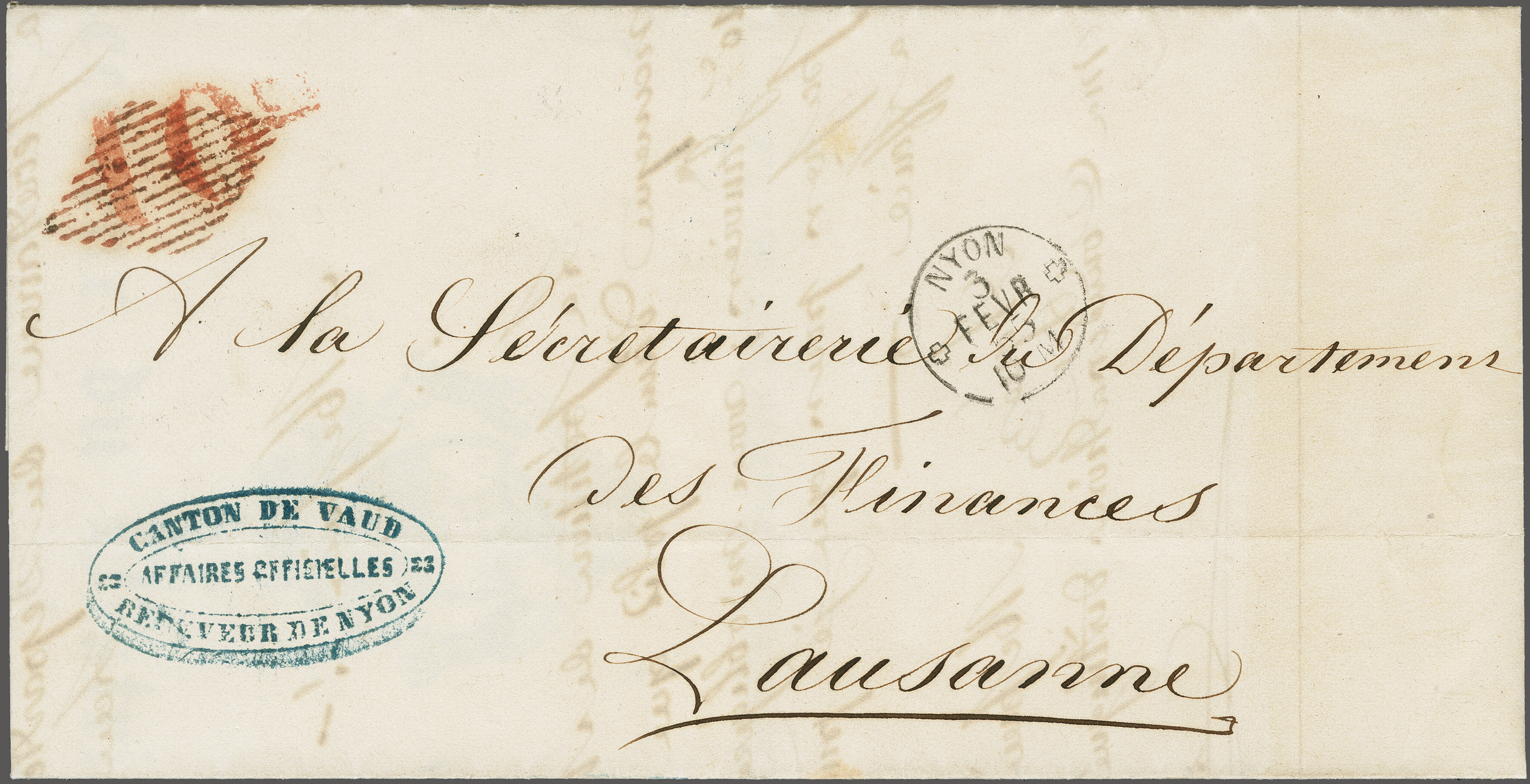 1855 (3. Feb.): Portofreier Amtsbrief des Einziehers des Bezirks Nyon mit Einkreisstp. "NYON 3. FEVR. 55 10M" an das kantonale Finanzdepartement in Lausanne. Trotz des klar abgeschlagenen vorderseitigen Amtsstempels "CANTON DE
