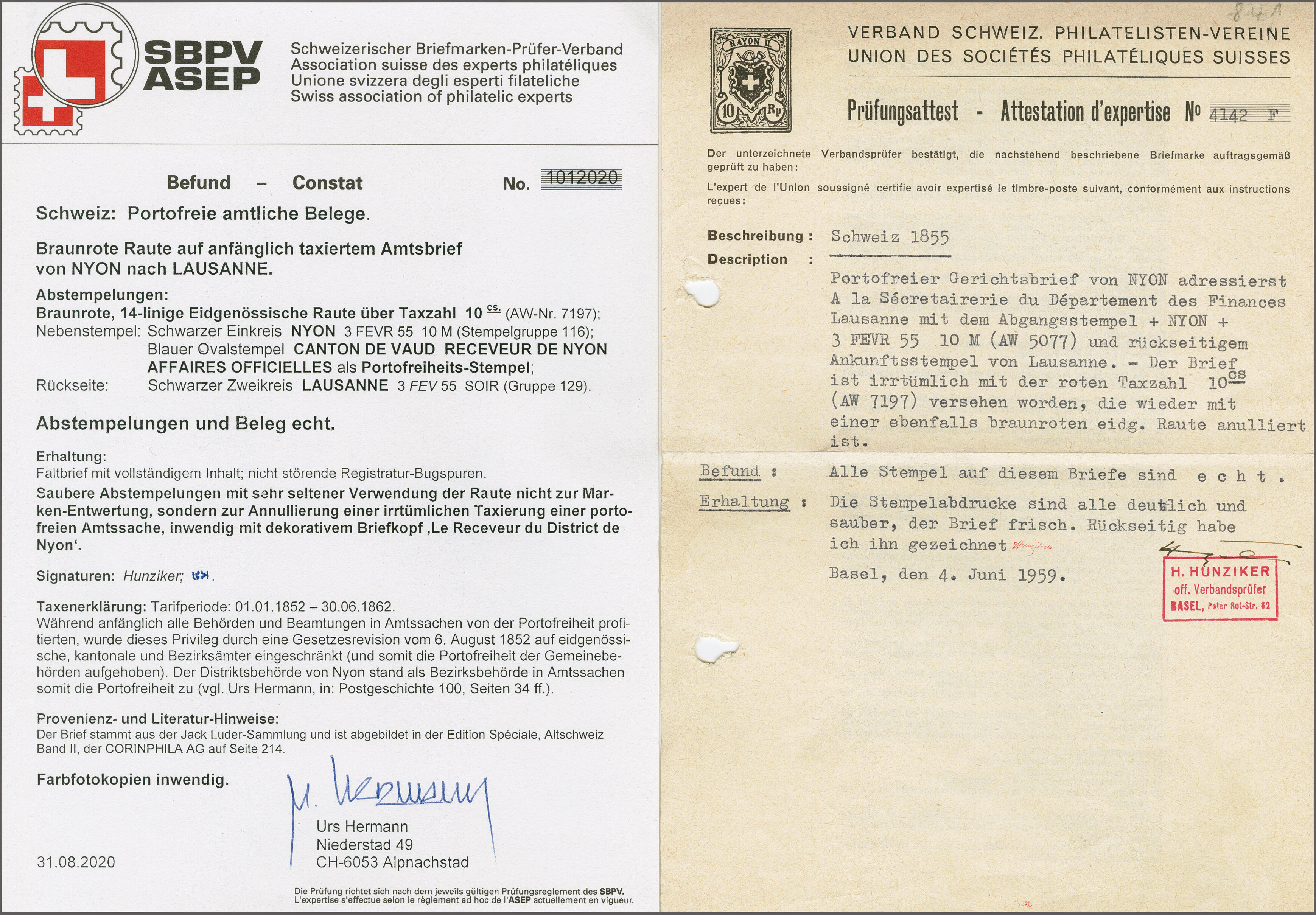 anulliert. Eine seltene und aufsehenerregende Verwendung der eidgenössischen Raute auf archivfrischem Brief; Atteste Hunziker (1959) und Hermann (2020). Provenienz: Sammlung Jack Luder, 273. Corinphila-Auktion, Zürich 12. Juni 2021, Los 8242. (Image 1)
