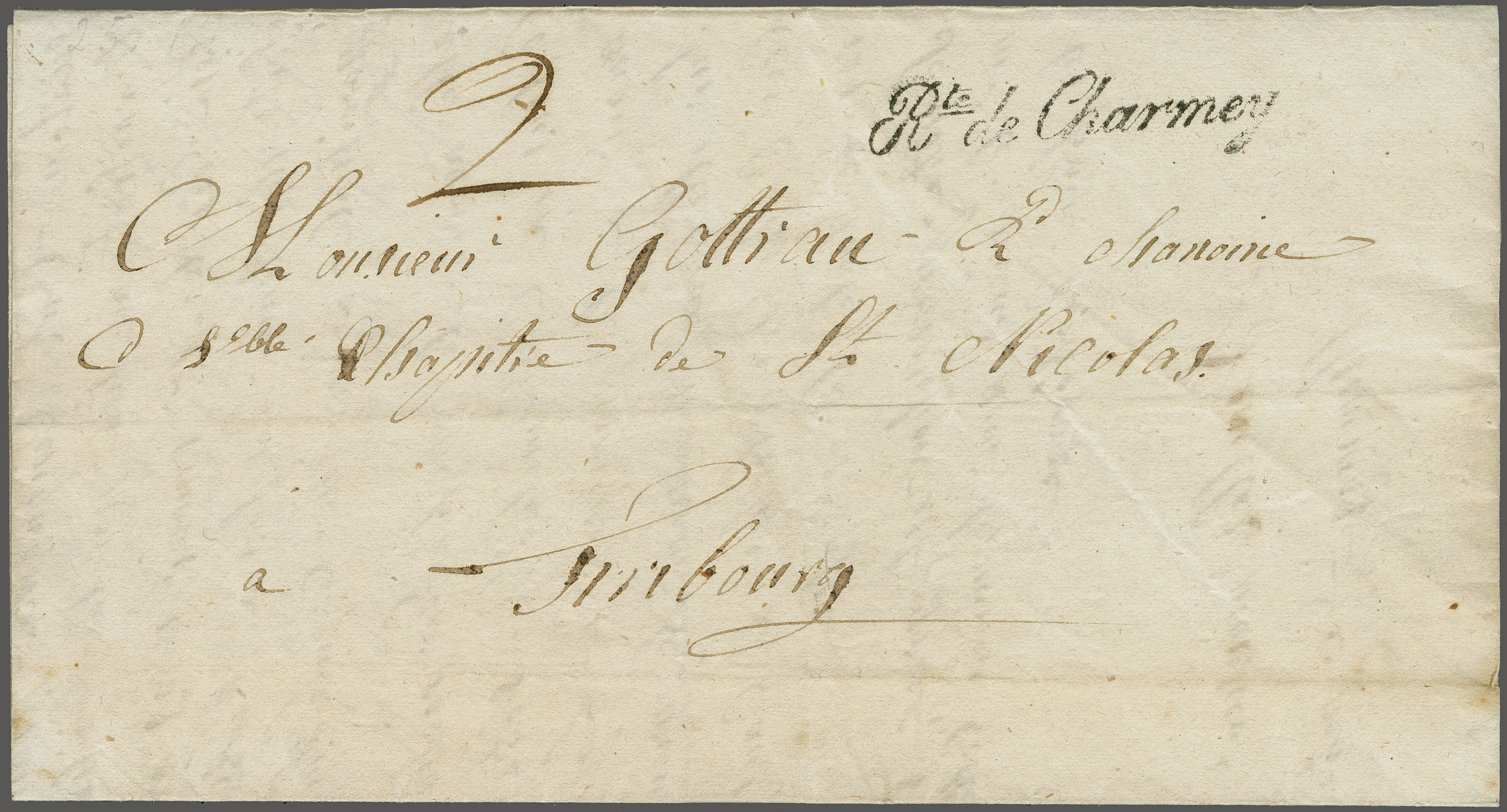 1838 (25. Nov.): "Rte de Charmey", Kursivstp. in schwarz auf vollständigem Faltbrief von Châtel-sur-Montsalvens an den Domherren Gottrau des Kollegiatsstifts St. Niklaus in Freiburg. Vorders. taxiert mit "2" Kreuzern in