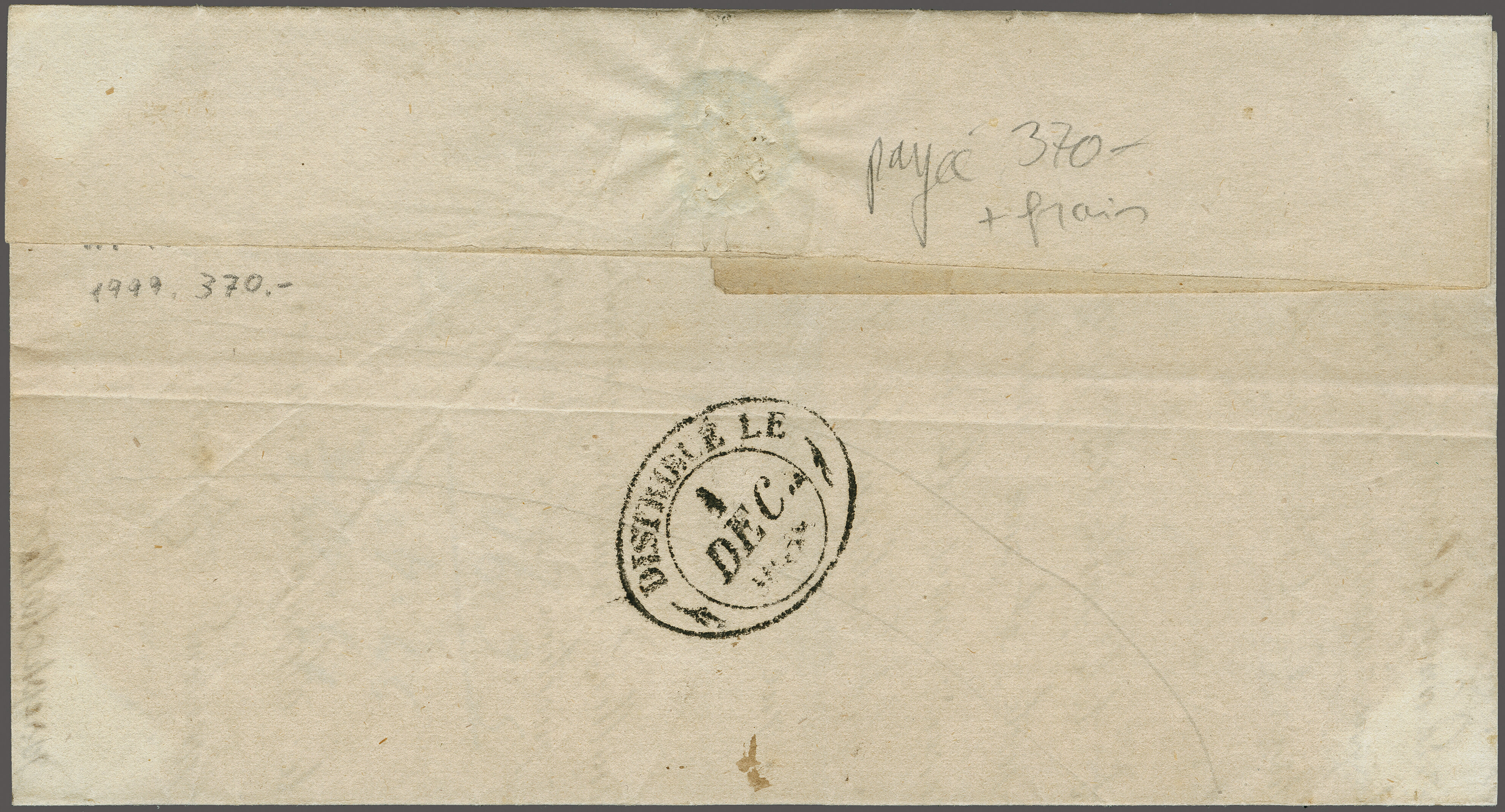 Marine-Paketboot nach Oran, die vorder. ausgewiesene Meerestaxe von "4" Décimes mit Blick auf den Vermerk "franco" wieder gestrichen. Eine seltene Destination in der Übergangszeit von der kantonalen zur eidg. Post. Anmerkung: Mit dem erschütternd zu