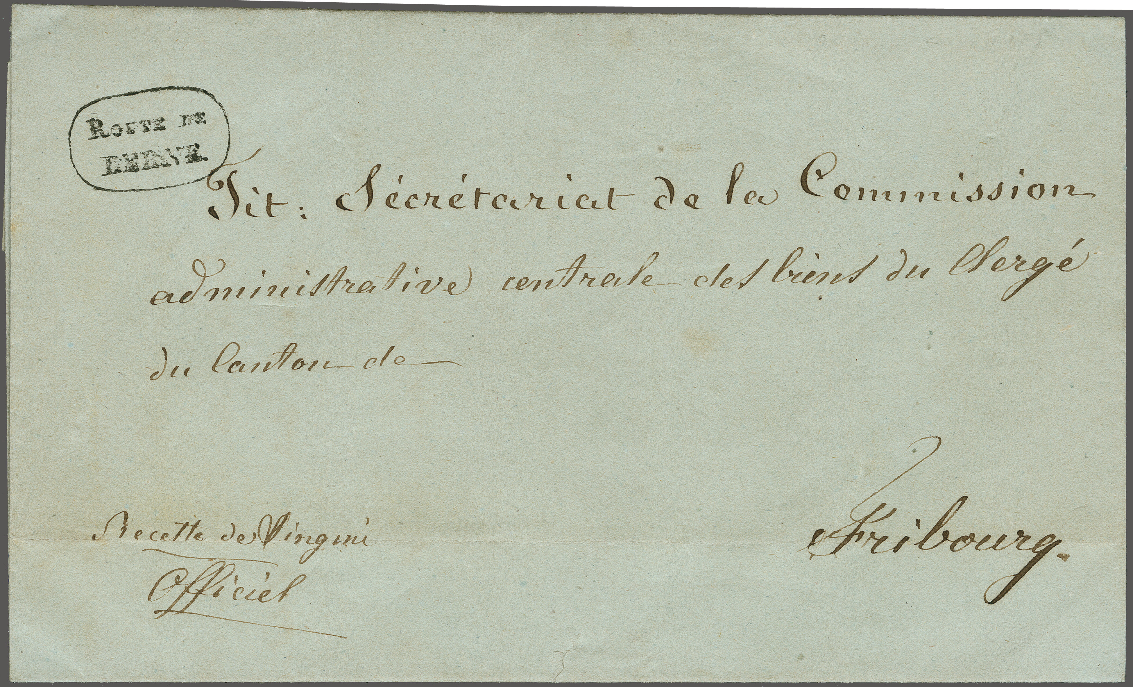 Sekretariat der "Commission adiministrative centrale des biens du Clergé" in Freiburg adressiert. Ein interessanter Senseländer Brief mit diesem seltenen Postroutenstempel des Postkurses Neuenegg-Wünnewil-Schmitten-Mariahilf-Freiburg. Gasser: