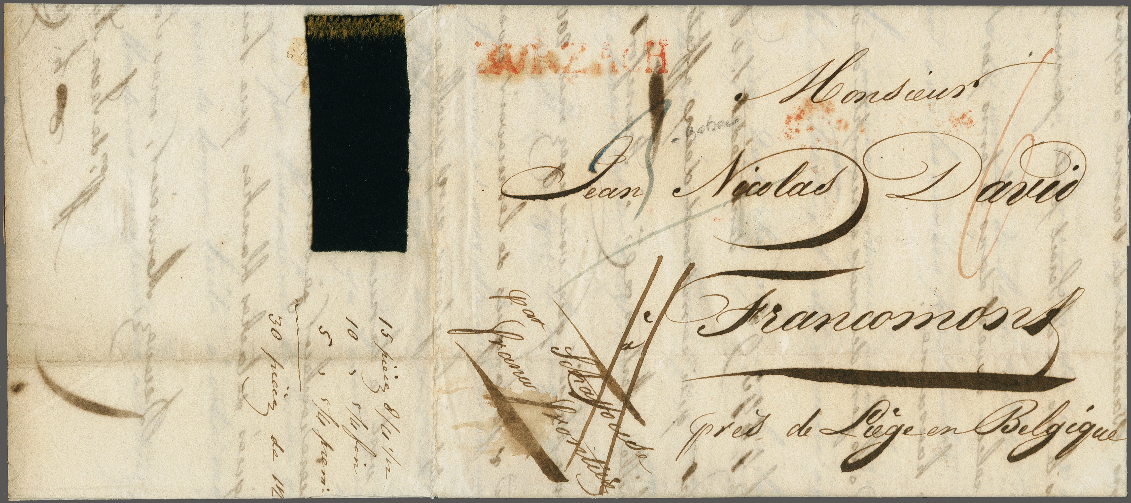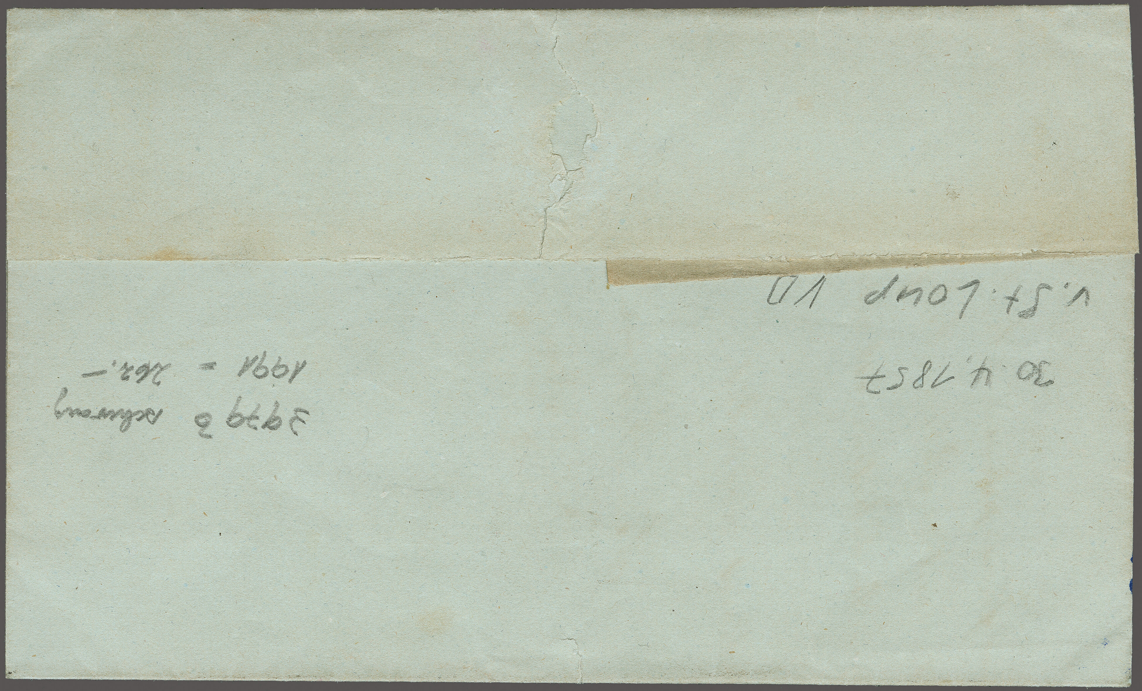 blauer Tintentaxierung '3' für Thurn & Taxis sowie '6' (Groschen) an Preussen, bezw. '11' an die Niederlande. Rückseitig schwacher Abschlag des L2 Schreibschriftstp. "Duitschland Over / Henri-Chapelle" Van der Linden 1001. Siehe Schäfer Handbuch