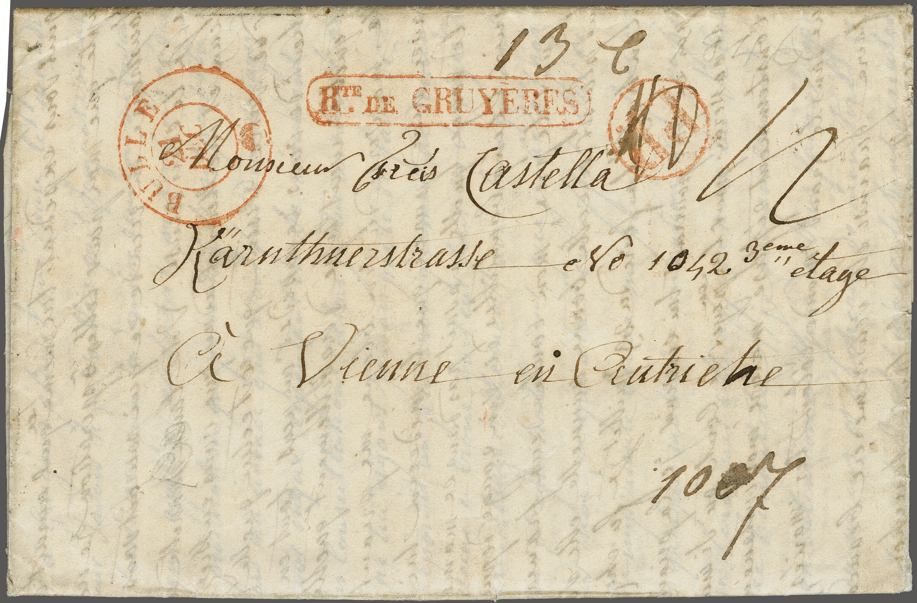 1846 (16. Dez.): "R.TE DE GRUYÈRES", oval gefasster Stabstp. in rot mit beigefügtem kleinem Zweikreisstempel "BULLE 21 DEC" und "P.P." im Kreis, beide ebenfalls in rot, auf vollständigem, fünfseitigem Faltbrief datiert "Lessoc