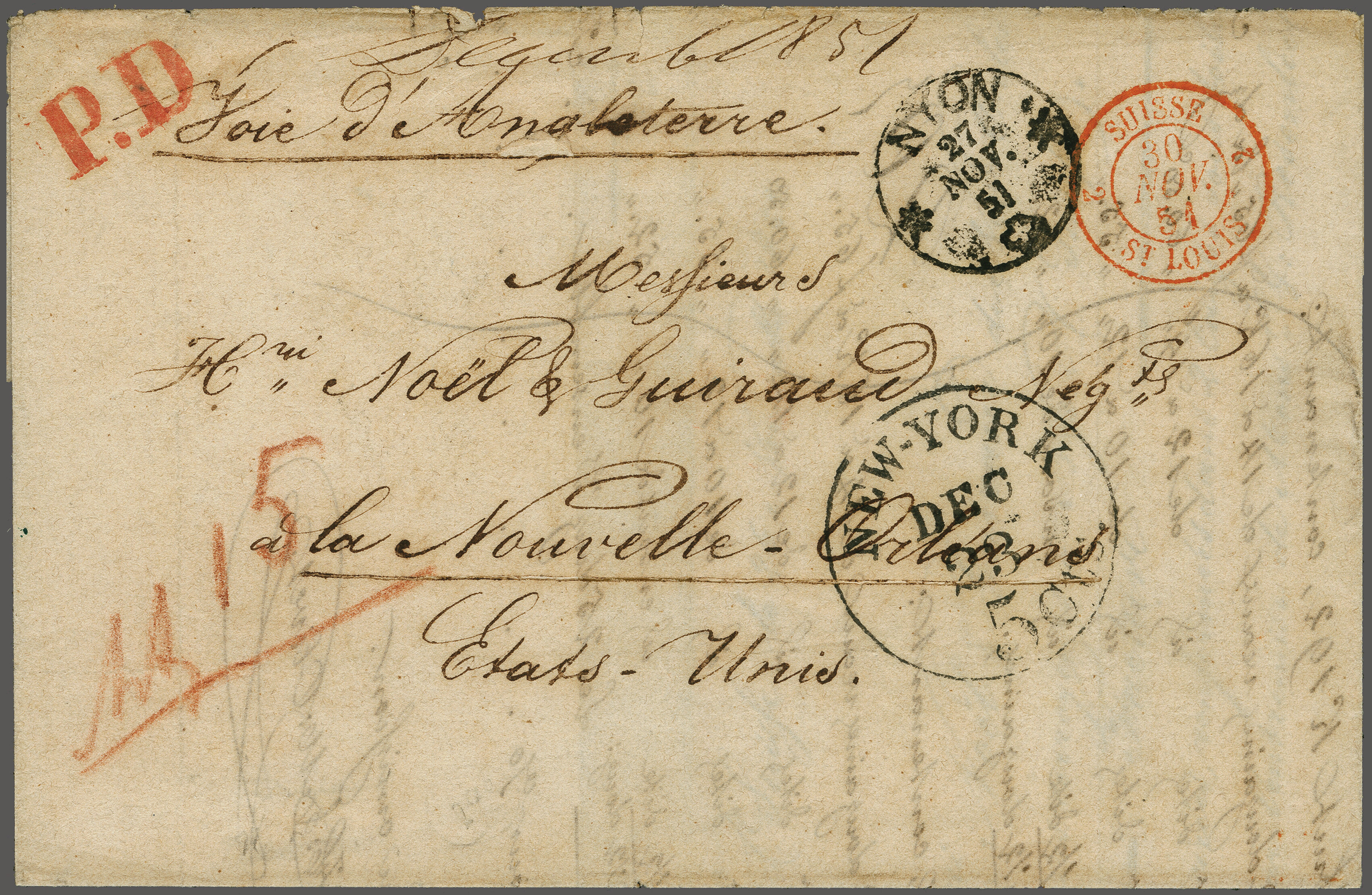 1851 (27. Nov.): Frankobrief der zweiten Gewichtsstufe (rücks. Rötelnotiz "2") von Nyon nach New Orleans, Lousiana (USA) mit vorders. Aufgabe-Einkreisstp. "NYON 27 NOV. 51" in schwarz und beigefügtem "P.D." in rot sowie