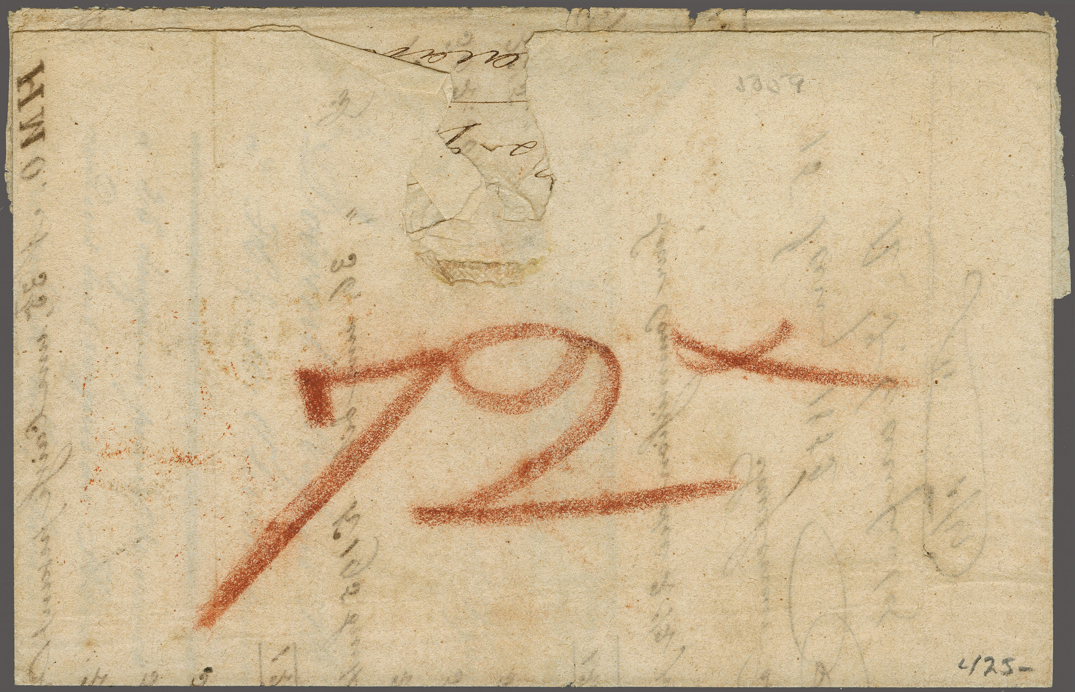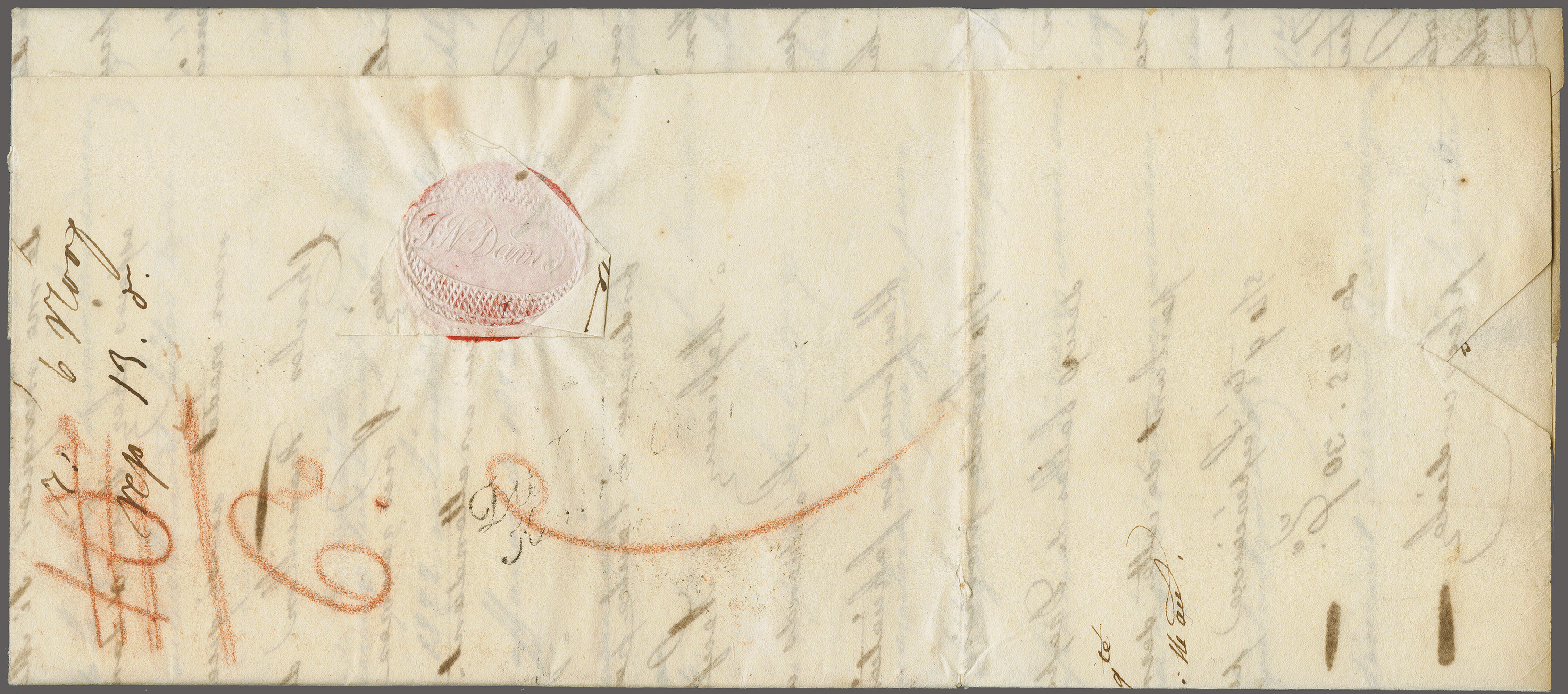 wurde der Brief mit französischem Dampfer von Calais nach Dover und dann per britischem Paketboot von Southhampton via St. Thomas nach Puerto Rico spediert, wo er der spanischen Post übergeben wurde. Diese erhob für den Transport von der Hafenstadt