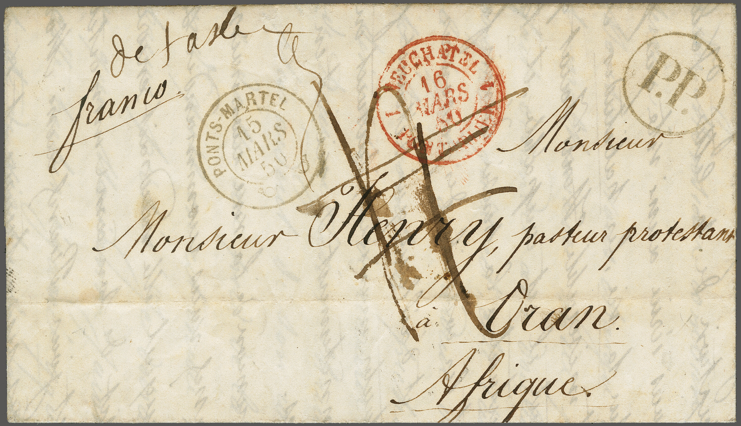 1850 (15. März): Frankobrief von Les Ponts-de-Martel nach Oran (Algerien) mit vorders. kleinem Aufgabe-Zweikreisstp. "PONTS-MARTEL 14 MARS 50" und beigefügtem "P.P." im Kreis (AW 313) sowie rückseitig mit Rötel notierter,