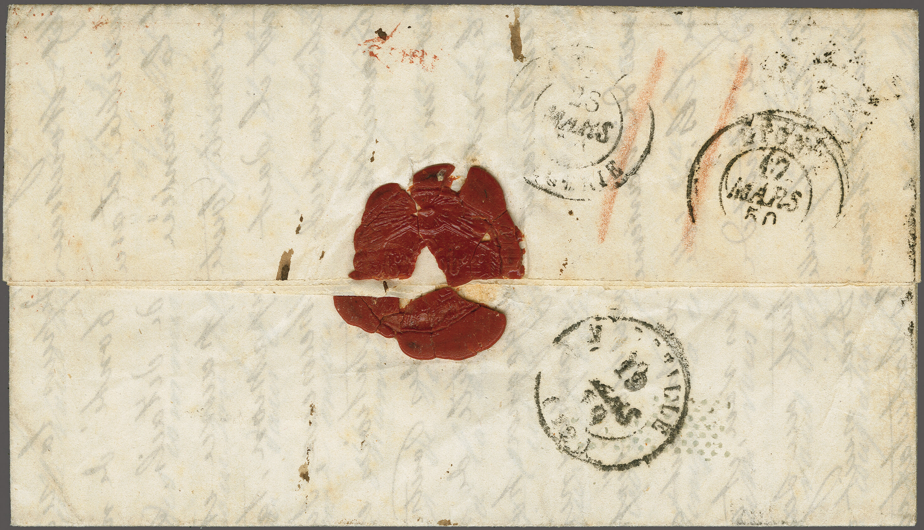 vorausbezahlter Taxe von "11" Kreuzern gemäss Postvertrag zwischen Genf und Frankreich vom 9. Dezember 1848. Vorders. Eingangsstp. "NEUCHTEL / PONTARLIER 16. MARS 50" in rot, befördert via Marseille (rücks. Transitstp. vom 19. März) und von dort mit