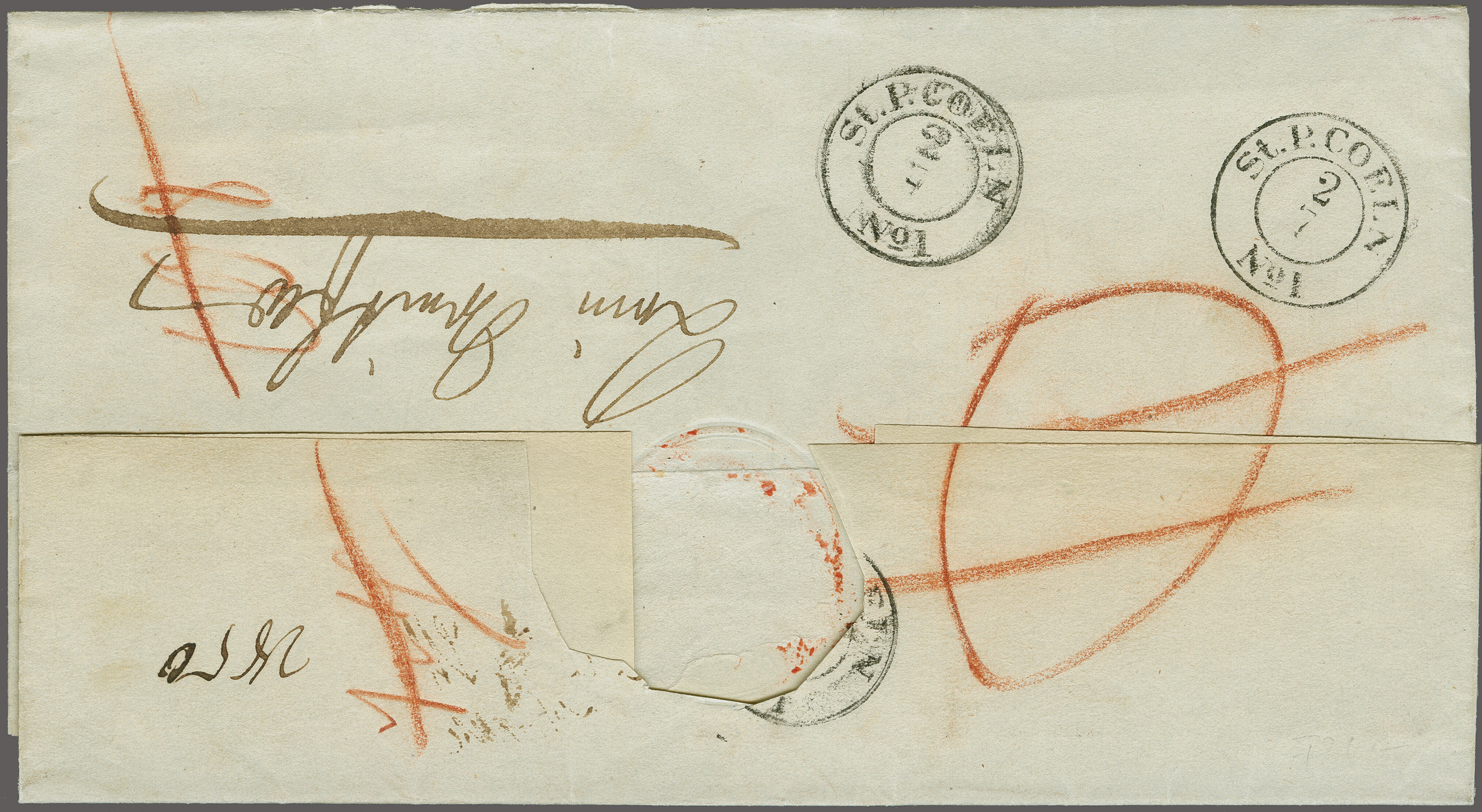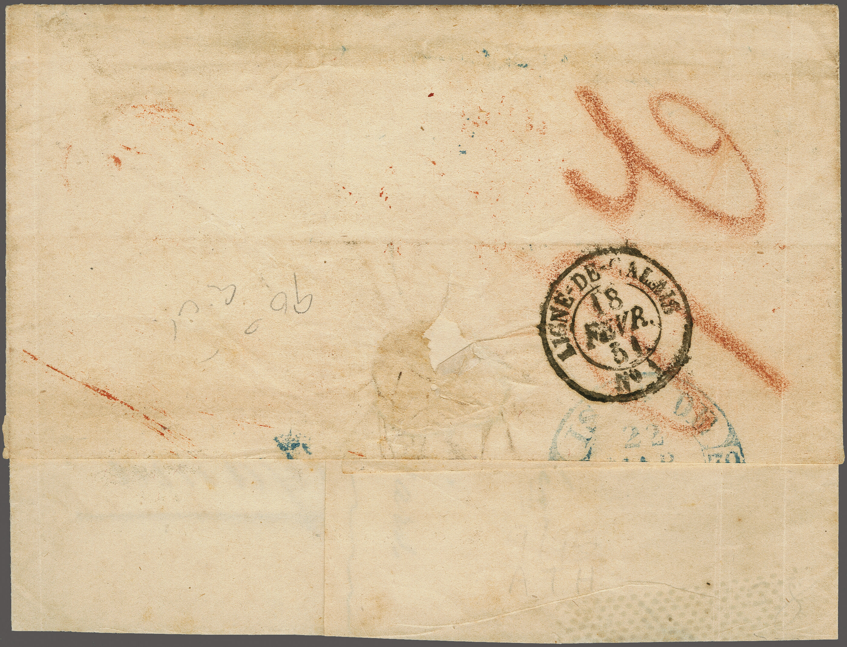 Leitvermerk "Par les Paquebots anglais". Vorders. franz. Eingangsstp. "SUISSE / FERNEY 18 FEVR. 51" und brit. "Tombstone"-Transitstp. "B / PAID / 19FEB19 / 1851" sowie rücks. Transitstp. "LIGNE-DE-CALAIS 18 FEVR. 51 / No. 1" und Teil eines blauen