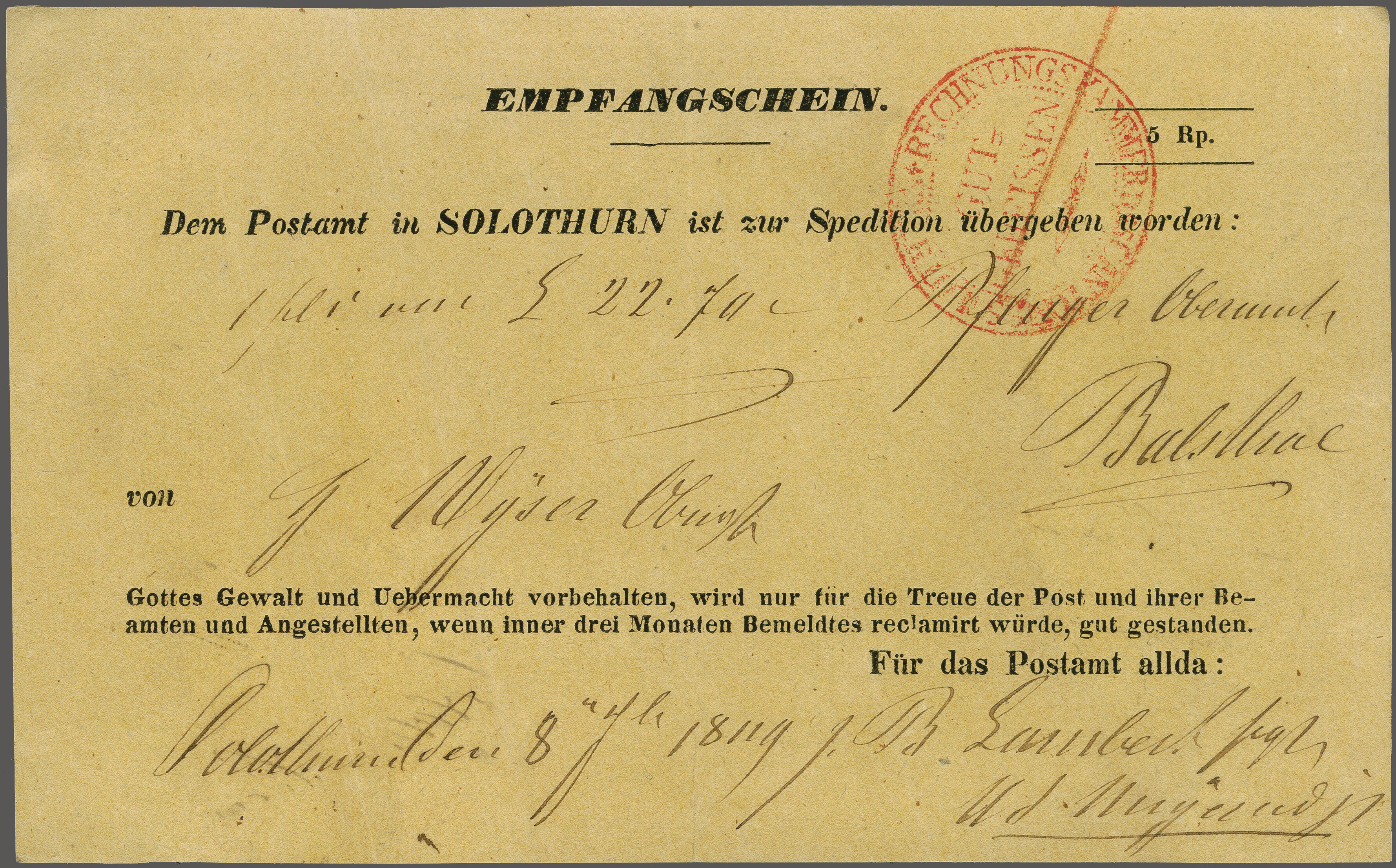 1849 (8. Juli): Empfangsschein von Solothurn nach Balsthal für den Erhalt eines 'Pli' (Wertcouvert) im Wert von Fr. 22.70, die dafür zu entrichtende Taxe war 5 Rp. mit beigef. Bestätigungsstp. 'GUT=GEHEISSEN CANTON SOLOTHURN'