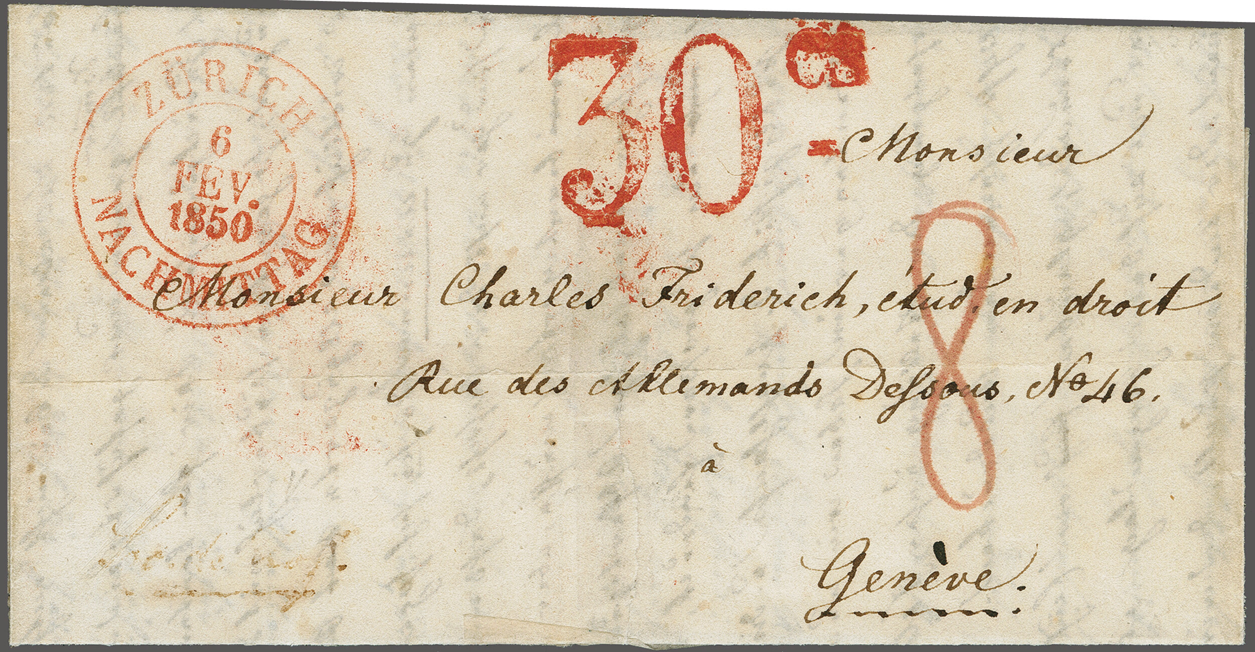 1850 (6. Feb.): Faltbrief von Zürich nach Genf mit rotem Doppelkreis Aufgabestp. "Zürich Nachmittag 6 Fev. 1850", bei Ankunft in Genf mit '30cs' (AW Nr. 569) taxiert und rücks. AStp. von Genf. Das 30 Cs. Porto für einen