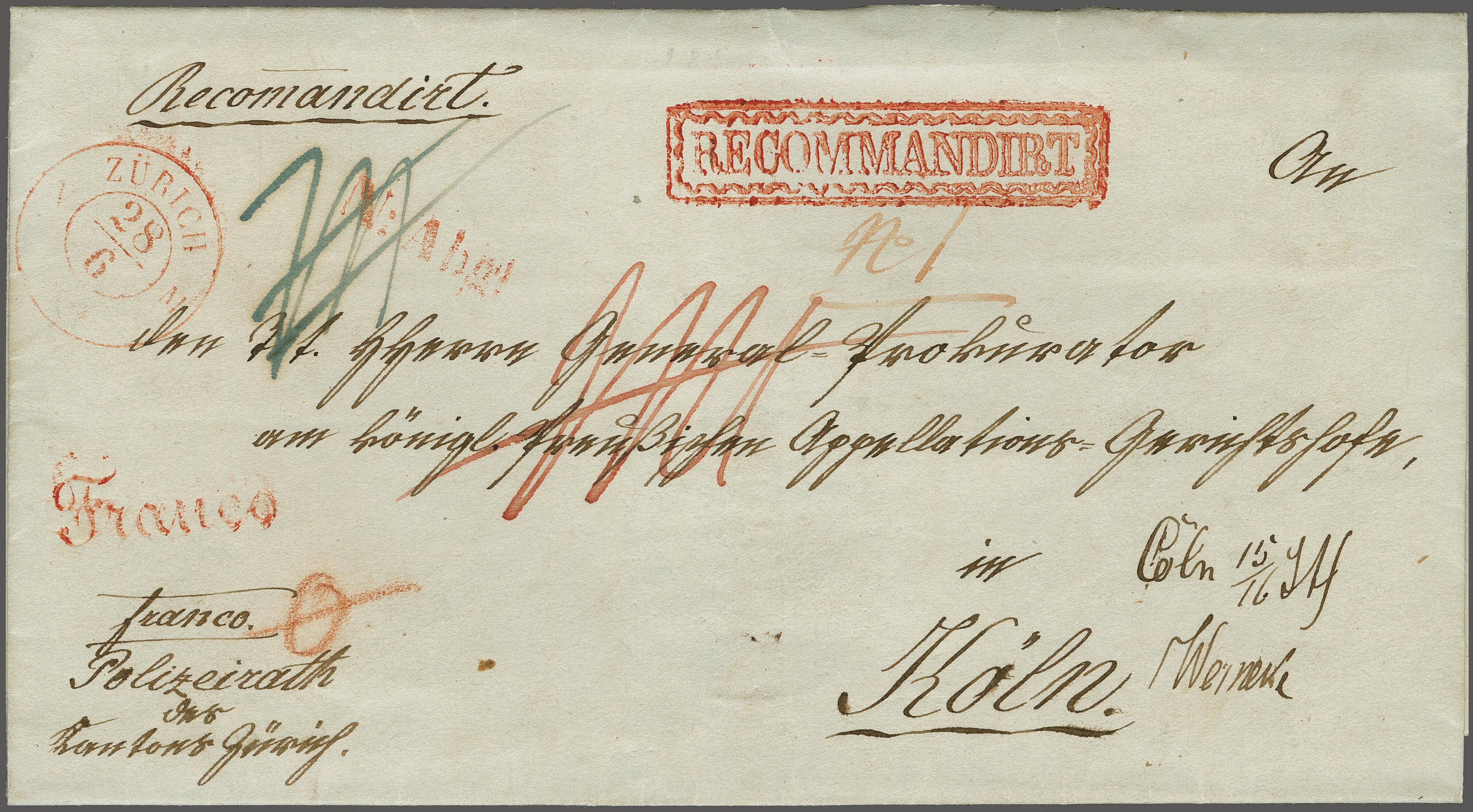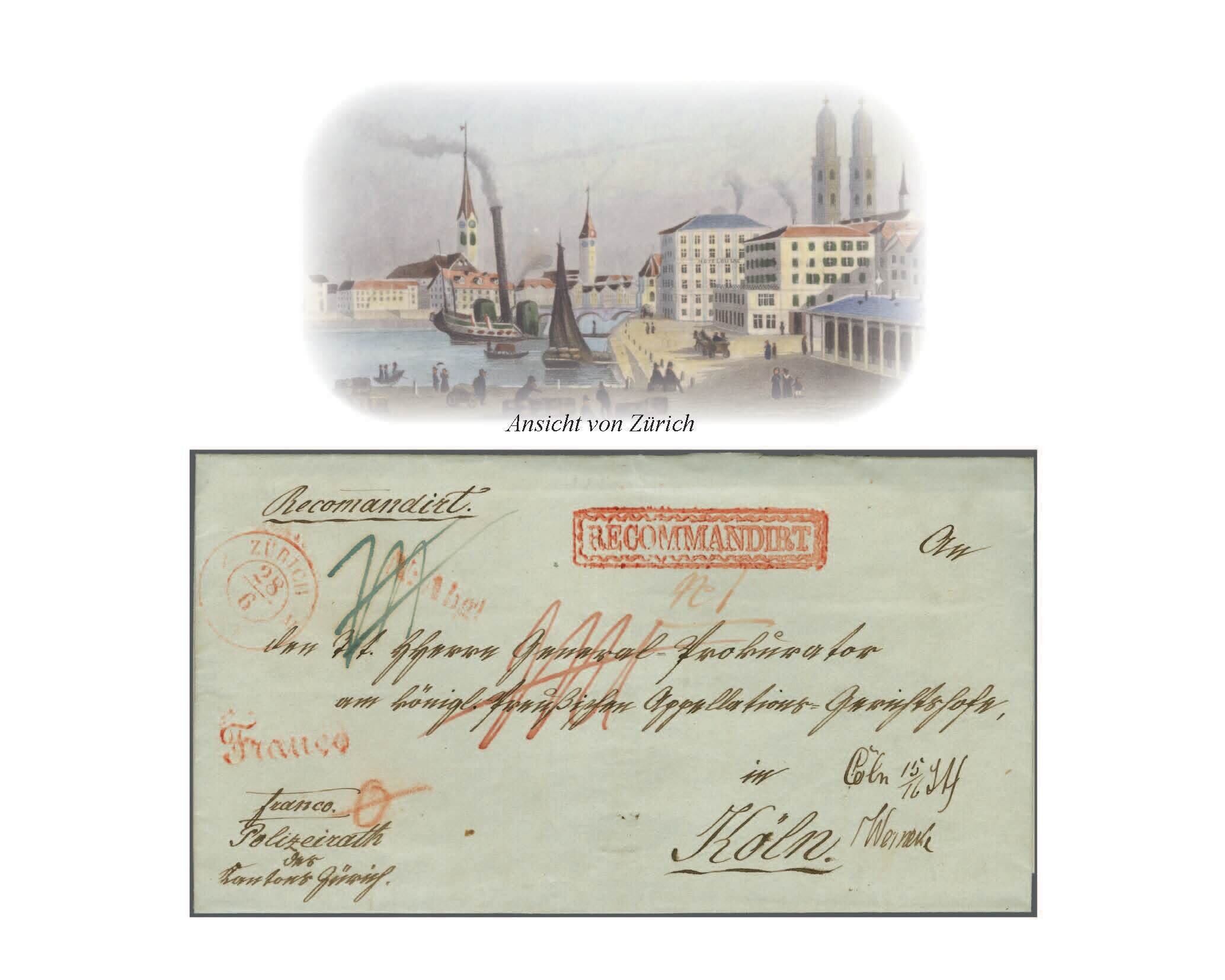 Zürich 1846 (28. Juni): Faltbriefhülle für einen Rekobrief vom 'Polizeirath Kanton Zürich' an den General-Prokurator des Königl. Preuss. Appellations-Gerichts in Köln mit Abgangsstp. "Zürich 28/6", Schreibschriftstp. 'Franco'