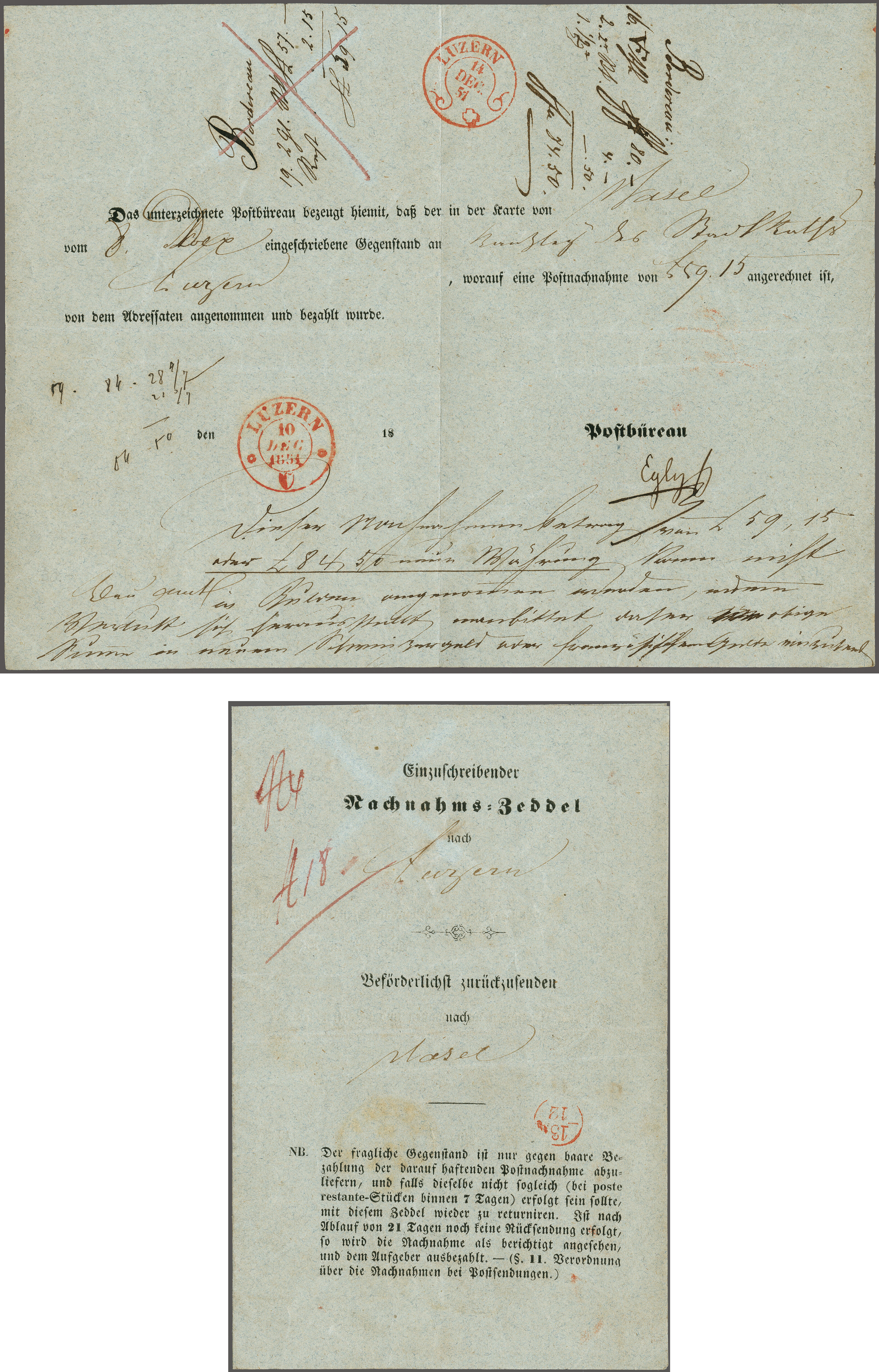 1851 (8. Dez.): 'Nachnahms=Zeddel' (Nachnahmeschein) für eingeschriebene Sendung zu Fr. 59.15 (alte Franken) von Basel nach "LUZERN 10 DEC. 1851" mit zusätzl. Schnallenstp. "LUZERN 14.DEC. 51" zurück nach Basel. Gem.