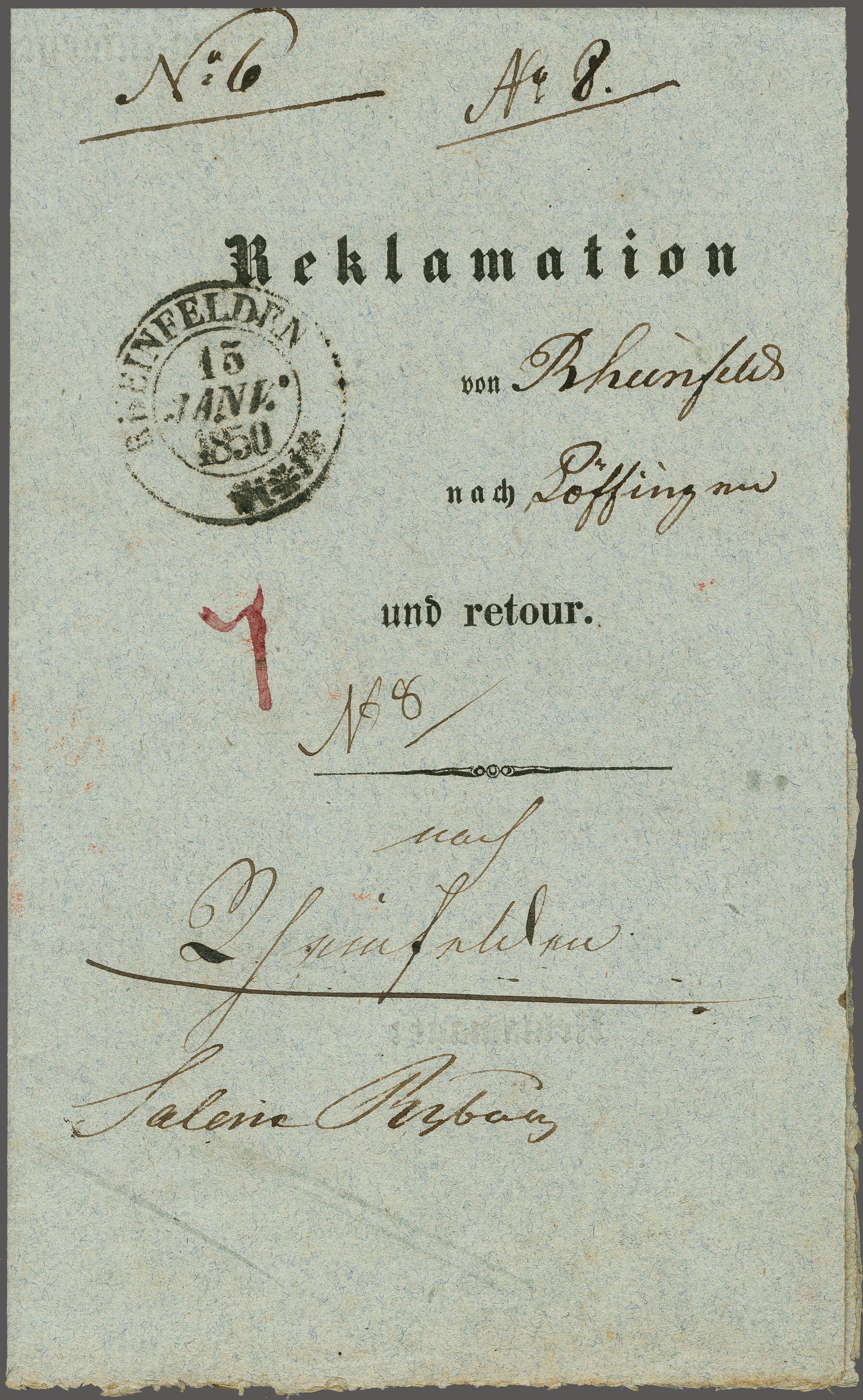 1850 (15. Jan): Reklamation - Laufzettel von Rheinfelden nach Löffingen im Grossherzogtum Baden, betr. einer Wertsendung zu 300 Fr., austaxiert mit 7 Kr. in roter Tinte mit der Bestätigung über den Nichterhalt der Sendung. Der