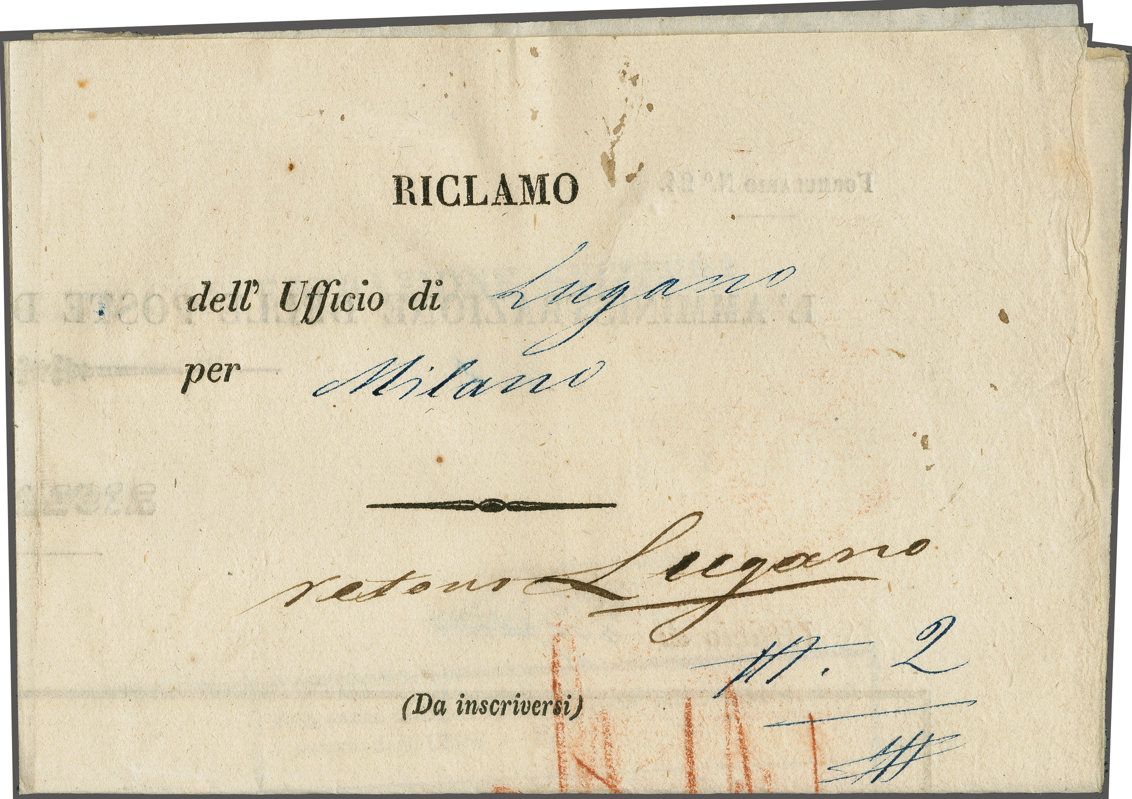 1852 (Jan. 1): 'RICLAMO' - Nachforschungsformular für eine Wertsendung von Lugano nach Mailand, gedrucktes Formular in ital. Sprache, portofrei befördert als Dienstkorrespondenz mit vorders. Rötelvermerk, mit handschriftl.