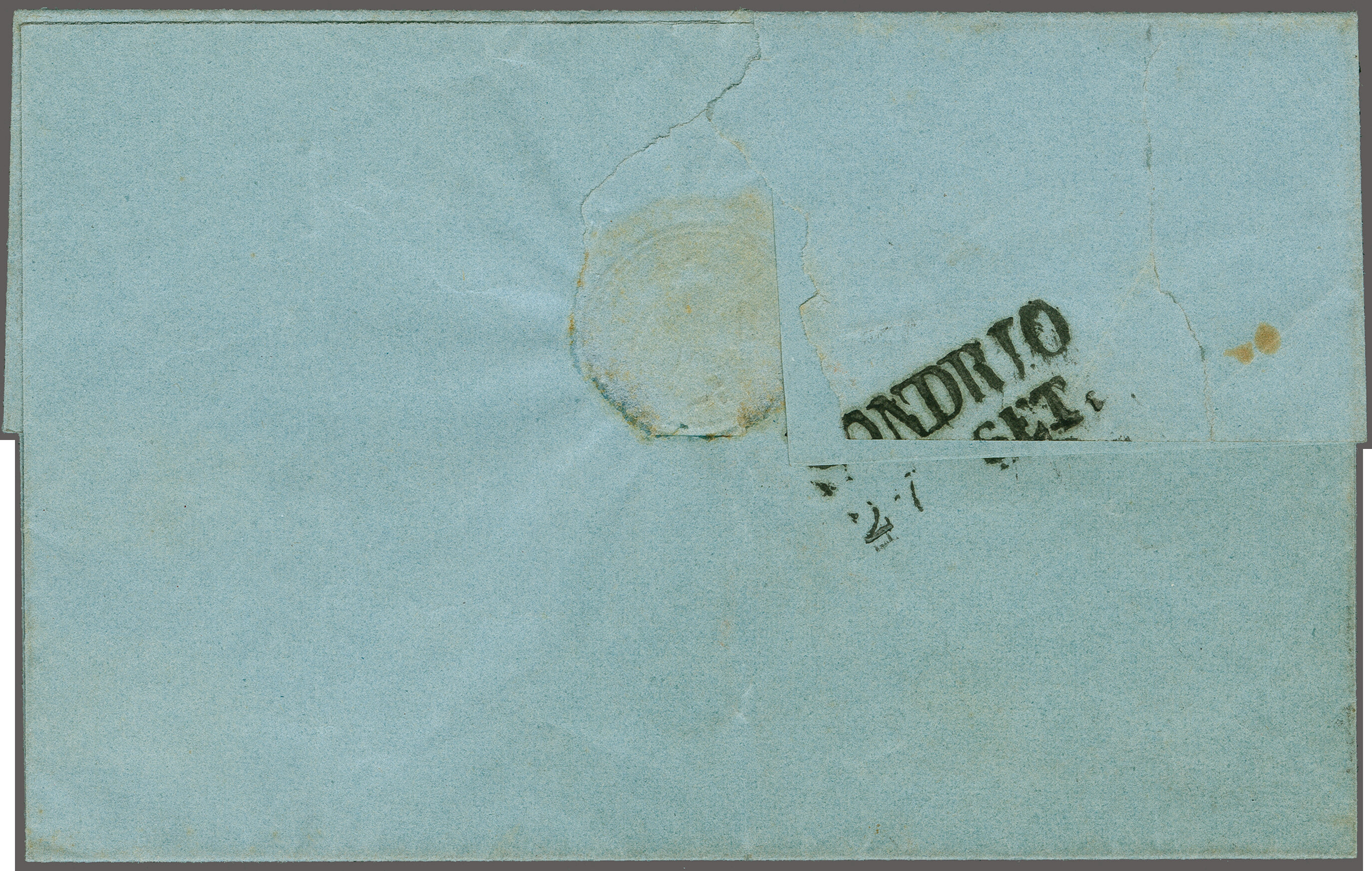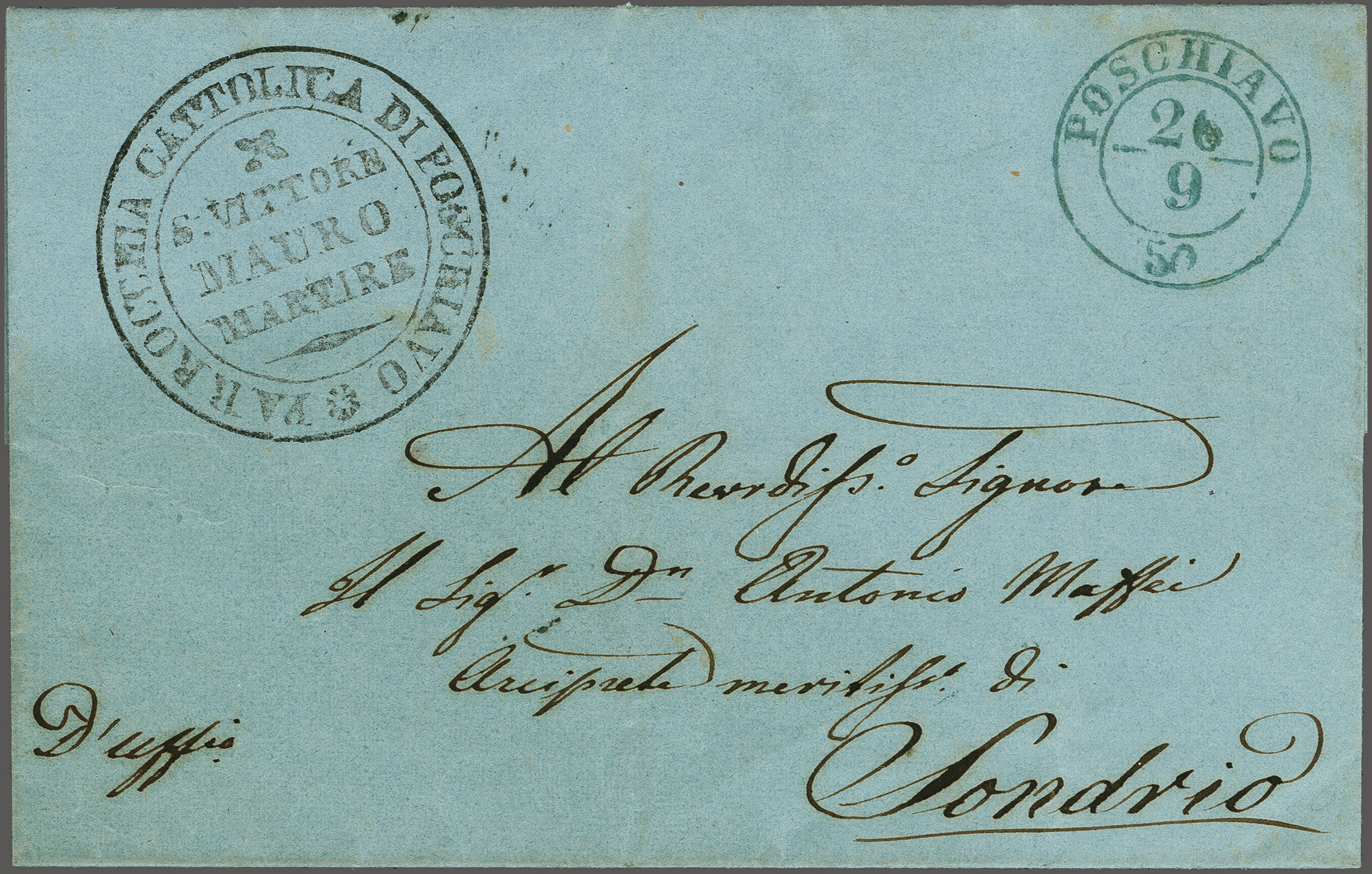1850 (26. Sept.): Unfrankierter Brief der Kirchgemeinde 'S. Vittore Mauro Martire' mit sauberem Aufgabestp. "Poschiavo 26/9" in Blaugrün nach Sondrio im Veltlin, mit rücks. AStp. "SONDRIO / 27 SET" in Schwarz. Als Dienstsache