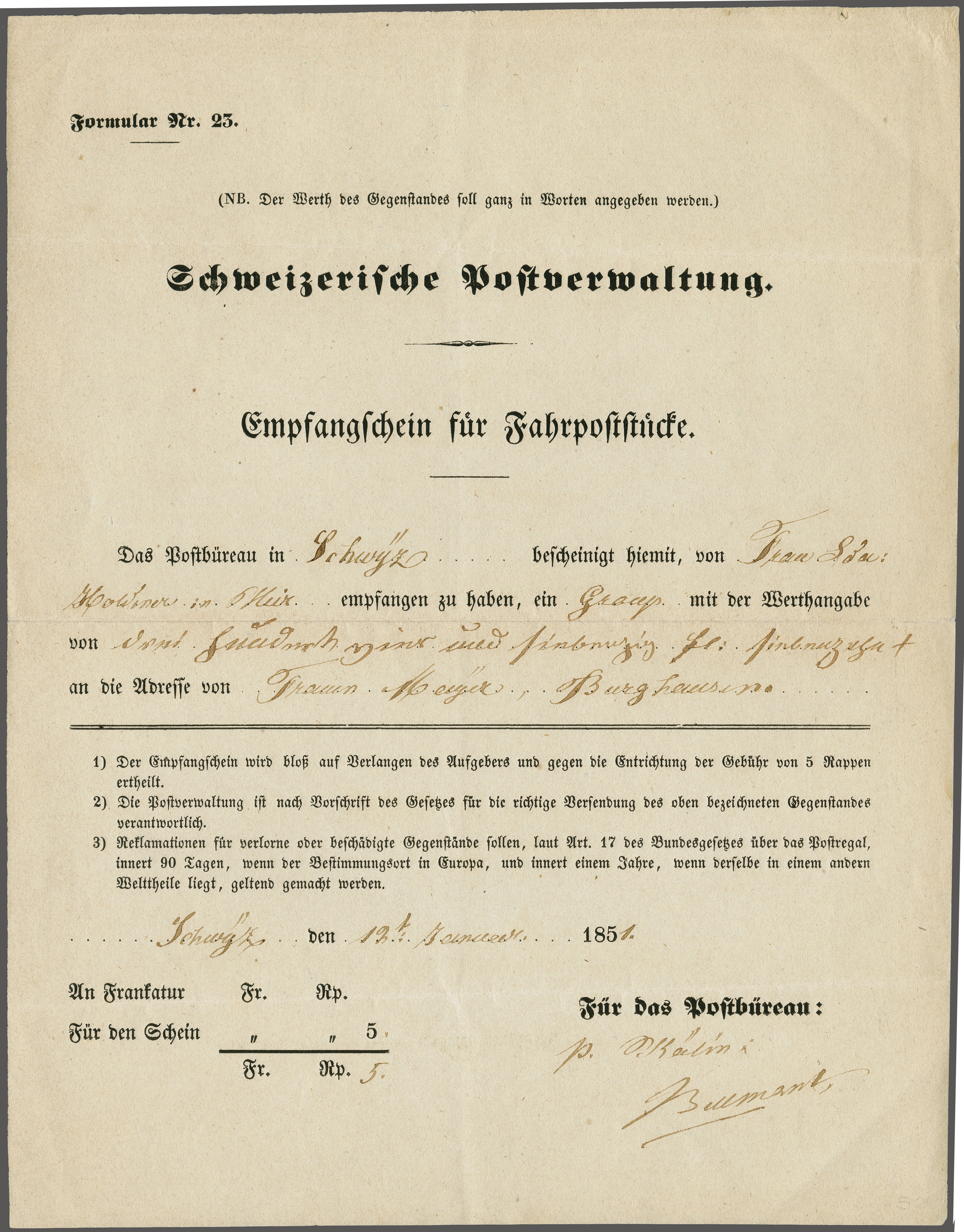 1851 (19. Jan.): Empfangsschein für Fahrpoststücke, gedrucktes Formular No. 23 der Schweizerischen Postverwaltung ausgestellt in 'Schwyz' für eine Wertsendung von 224 Franken, ausgeschrieben in worten (wie vorgeschrieben) nach