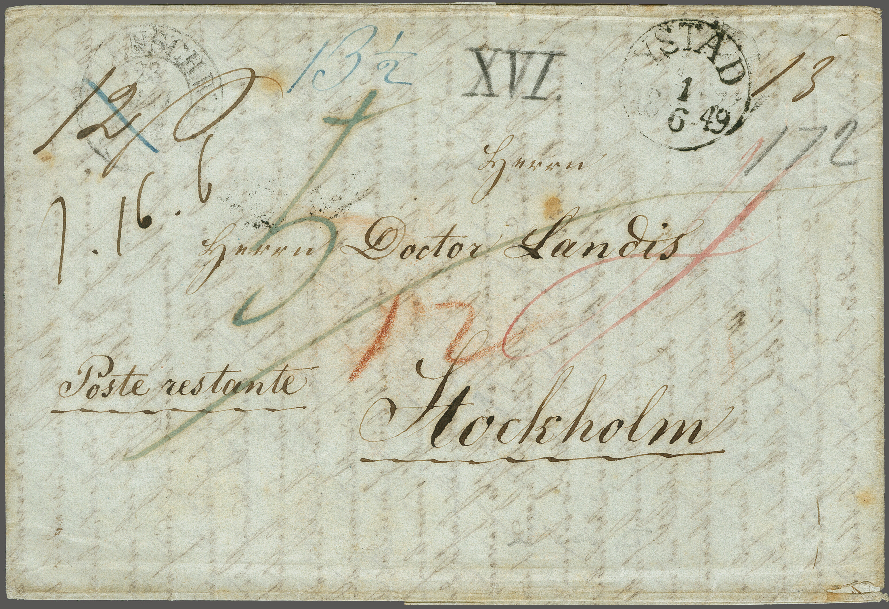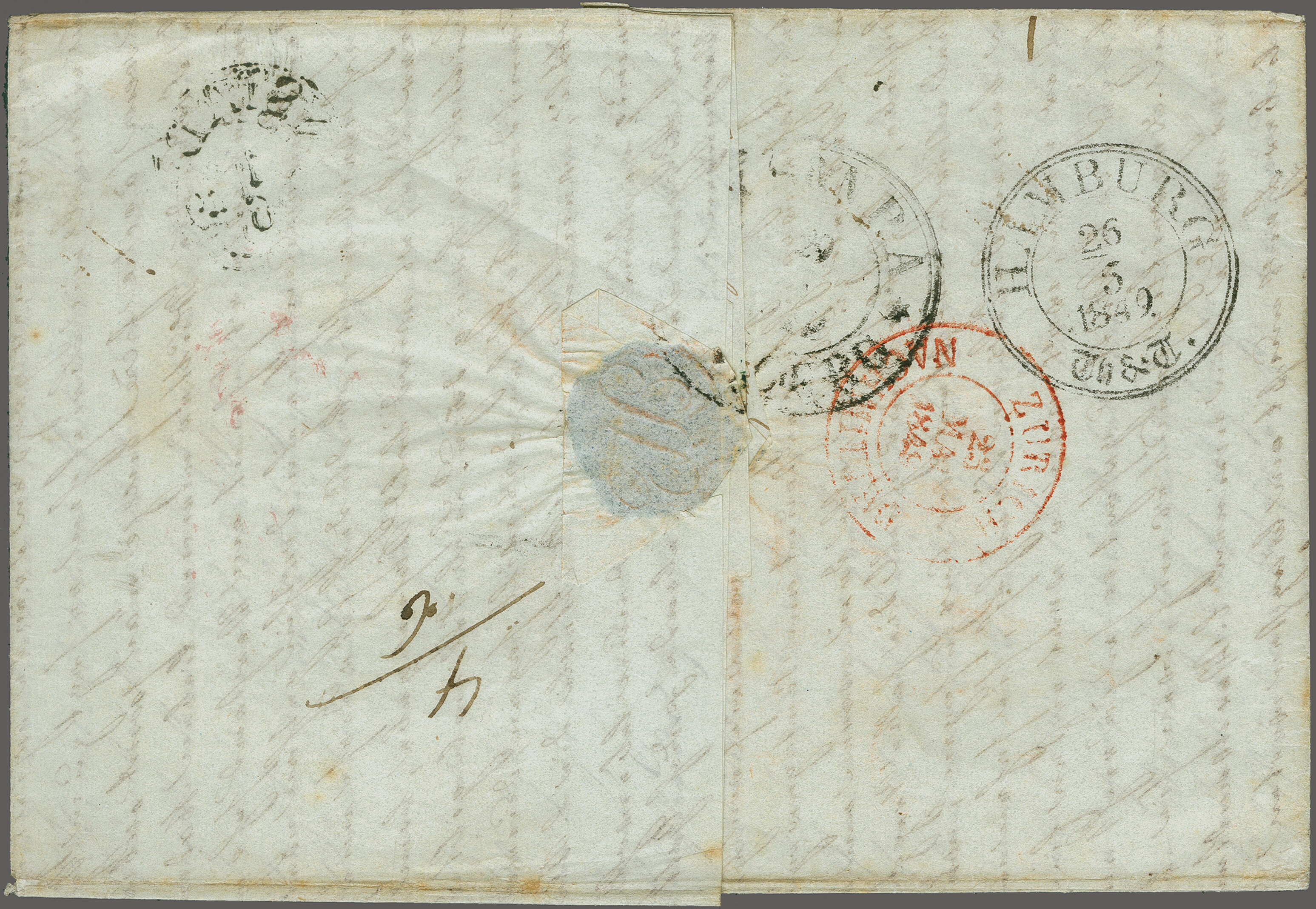 von Zürich und dem Thurn und Taxis Postamt in "Hamburg Th&T 26/5 1849", weiterbefördert über "YSTAD 1/6 1849" in Schweden. Vorderseitig alles schön und sauber austaxiert, in Schweden musste der Empfänger insgesamt 12 Schwedische Skillinge