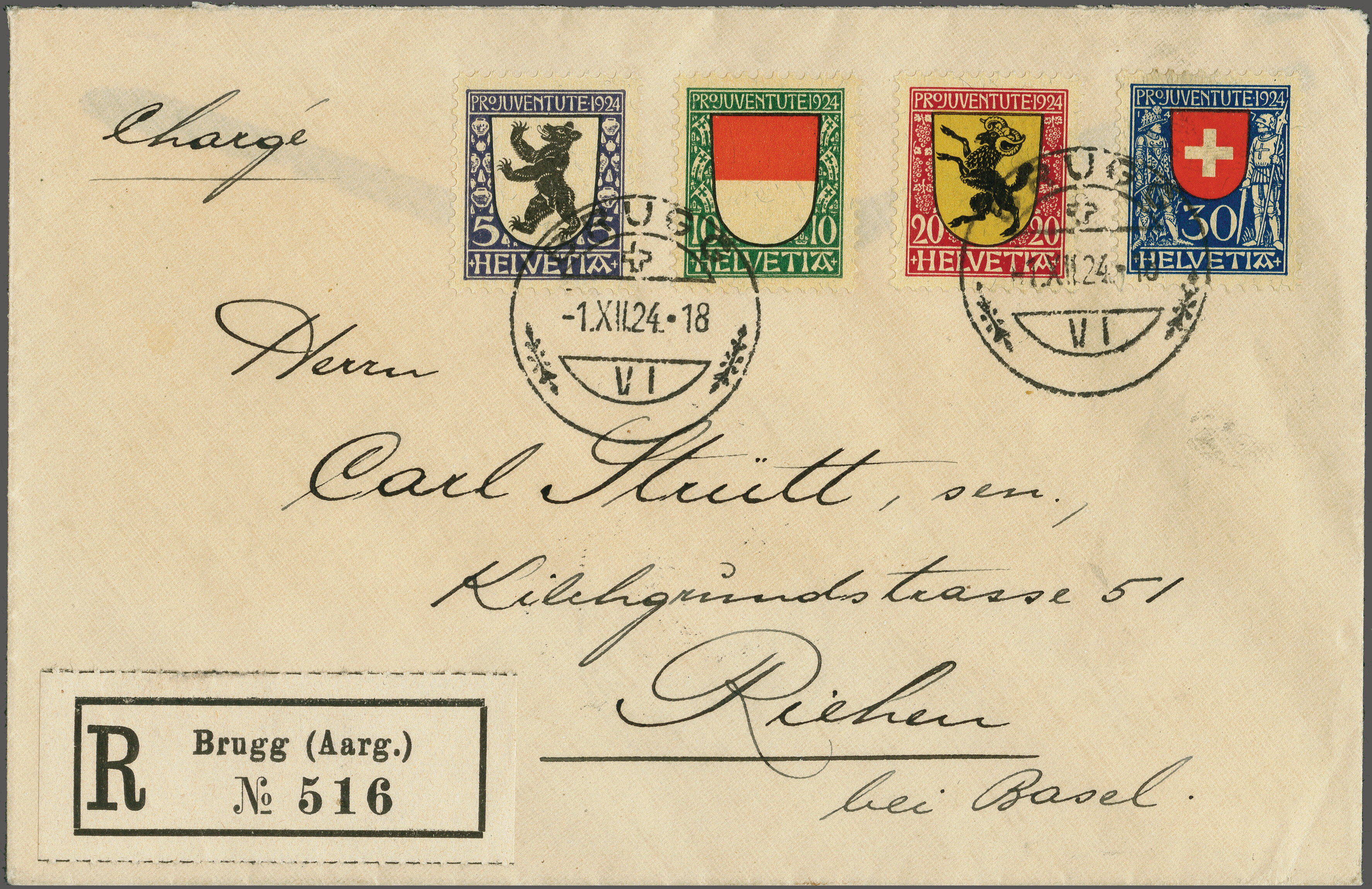 1924: "Kantons- und Schweizerwappen", kpl. Satz 5-30 Rp., einwandfrei gez., klar gest. am Ersttag "BRUGG 1.XII.24-18" auf frischem Einschreibebrief nach Riehen (BS). Rücks. Ankunftsstp. vom Folgetag. Ein dezenter FDC. SBK=CHF