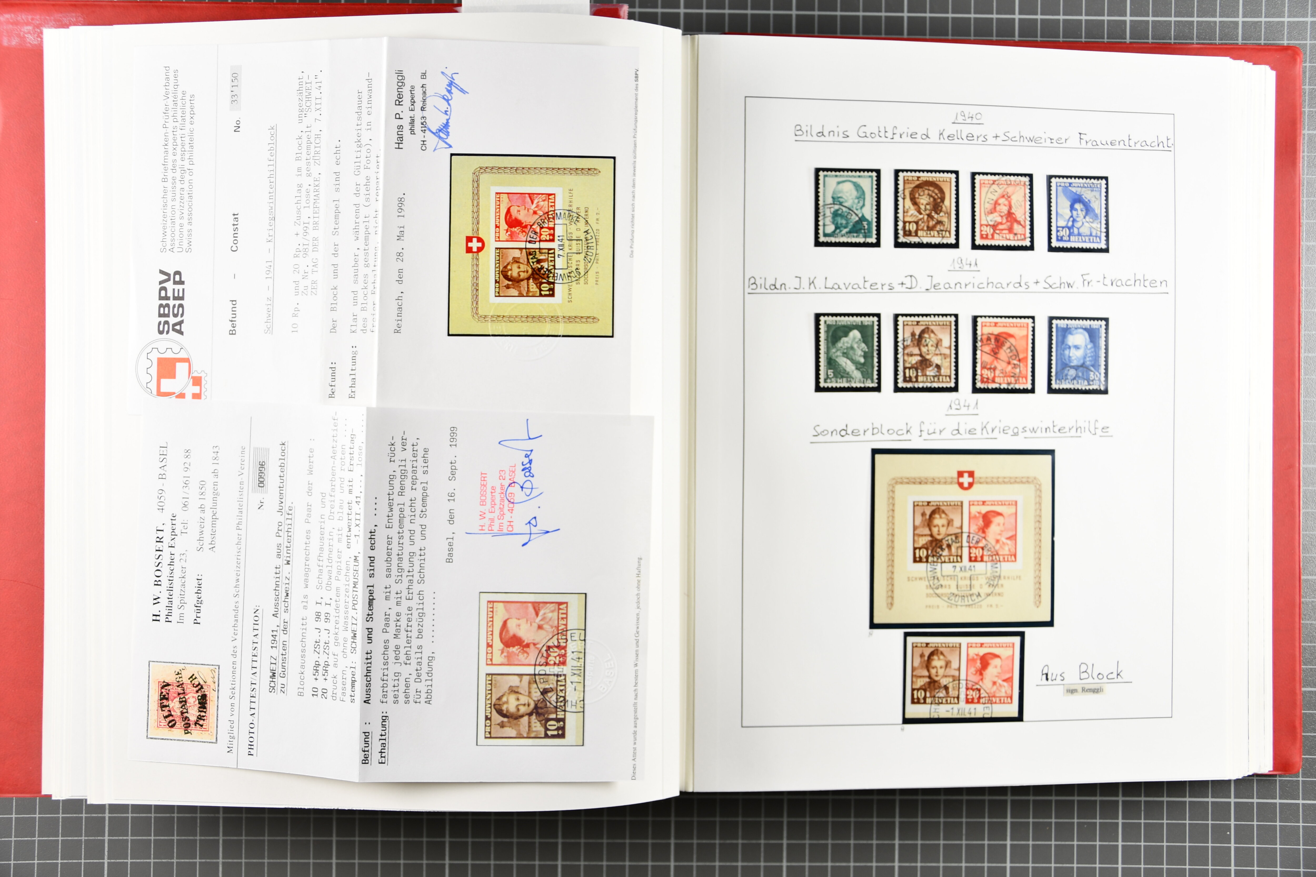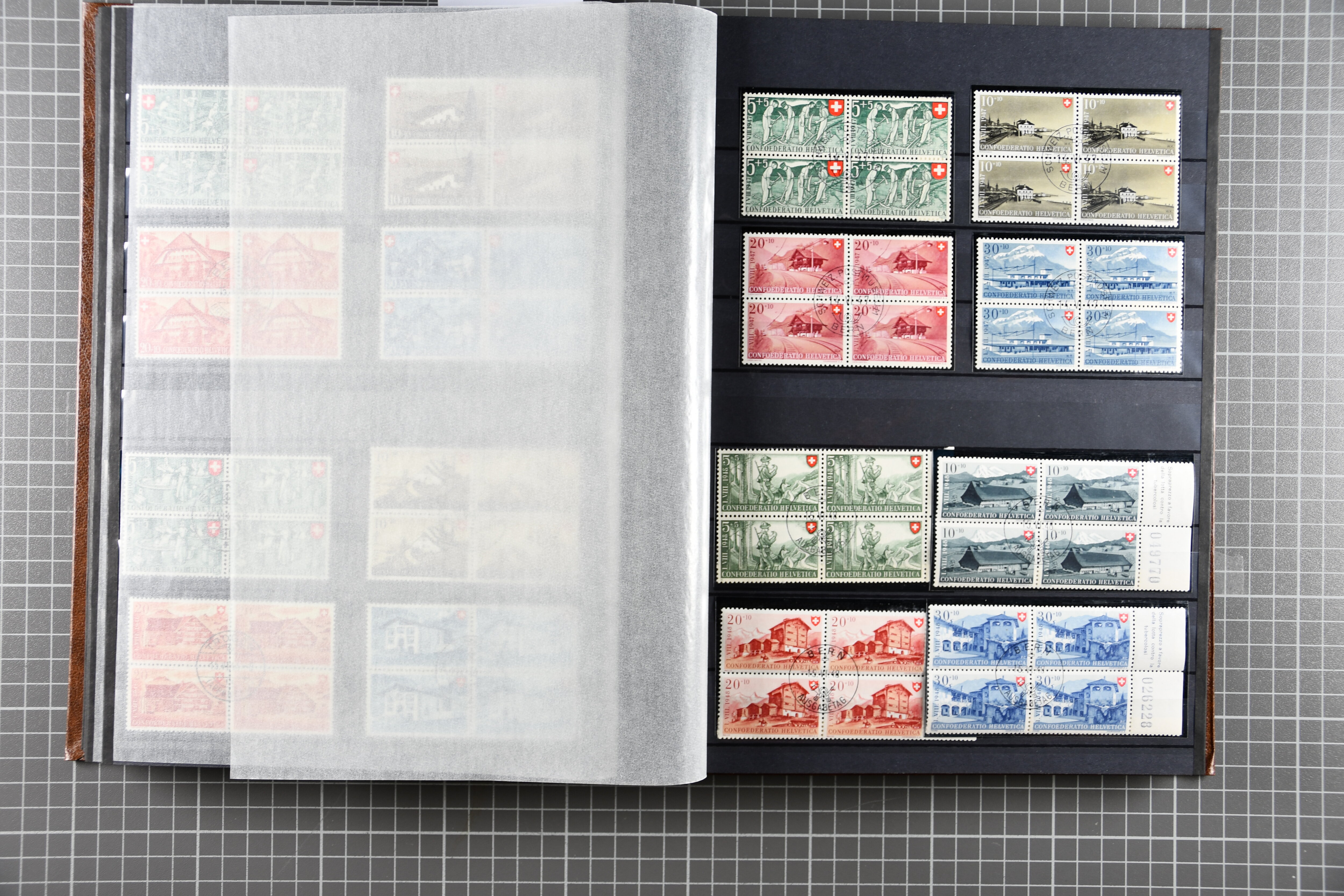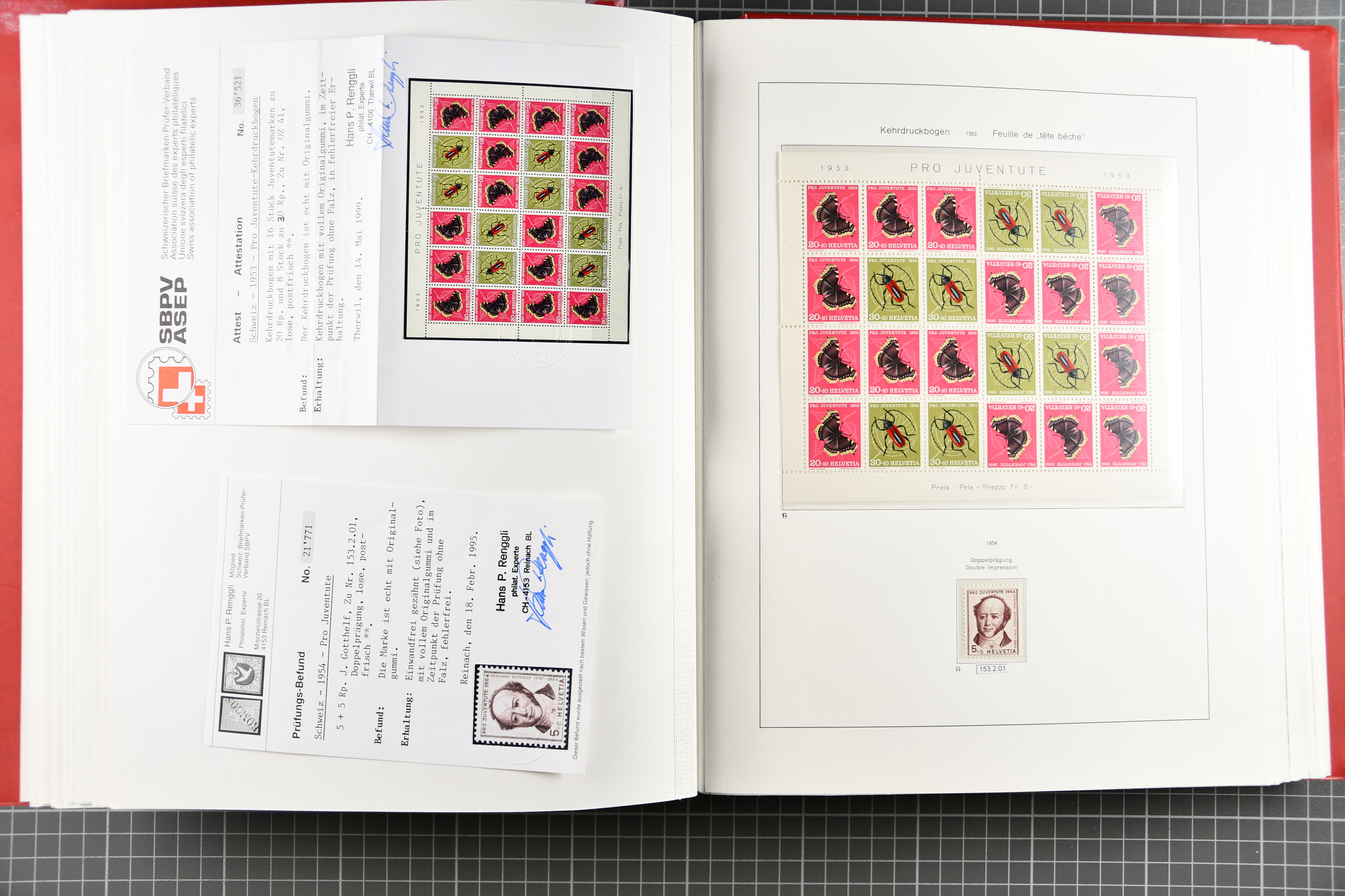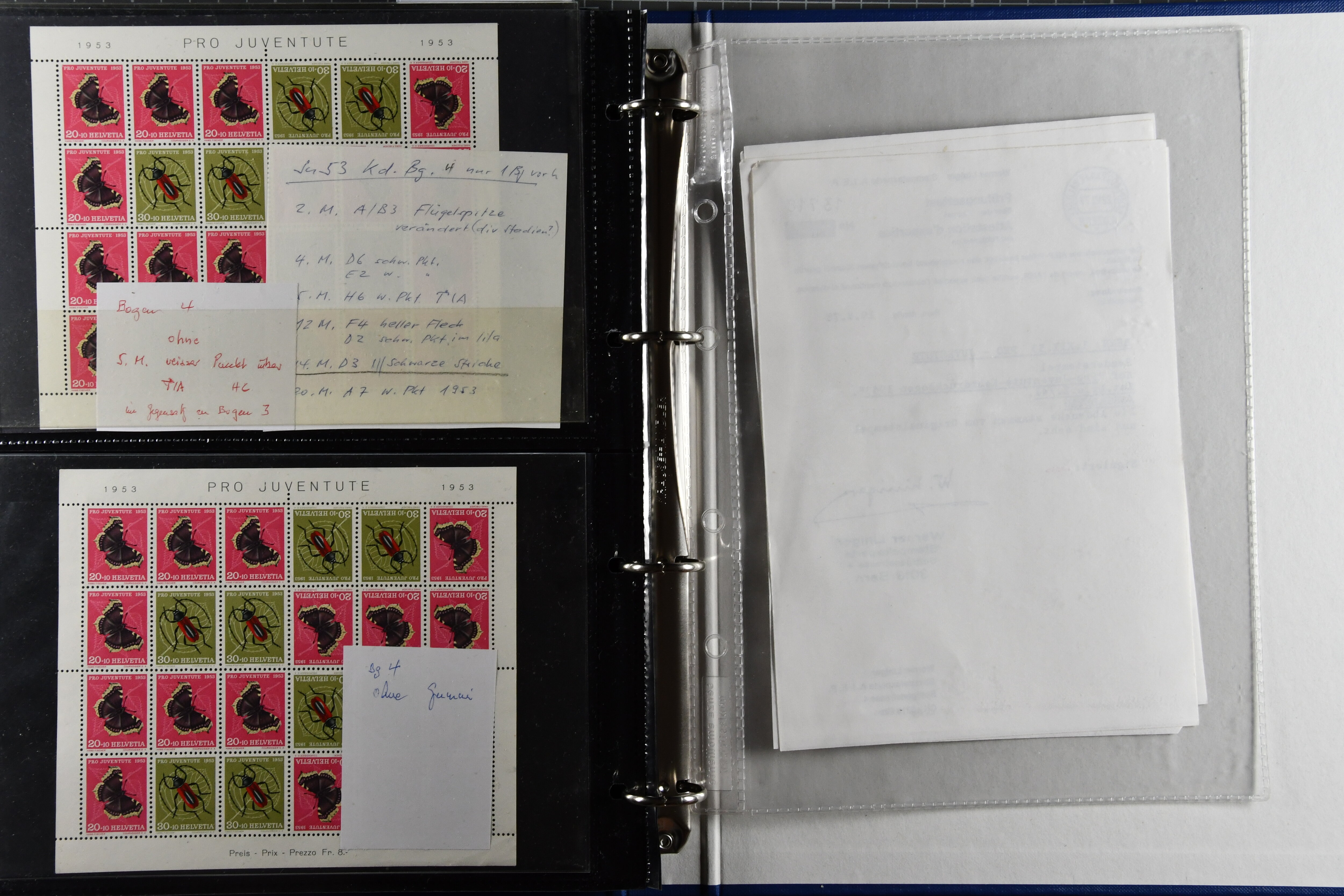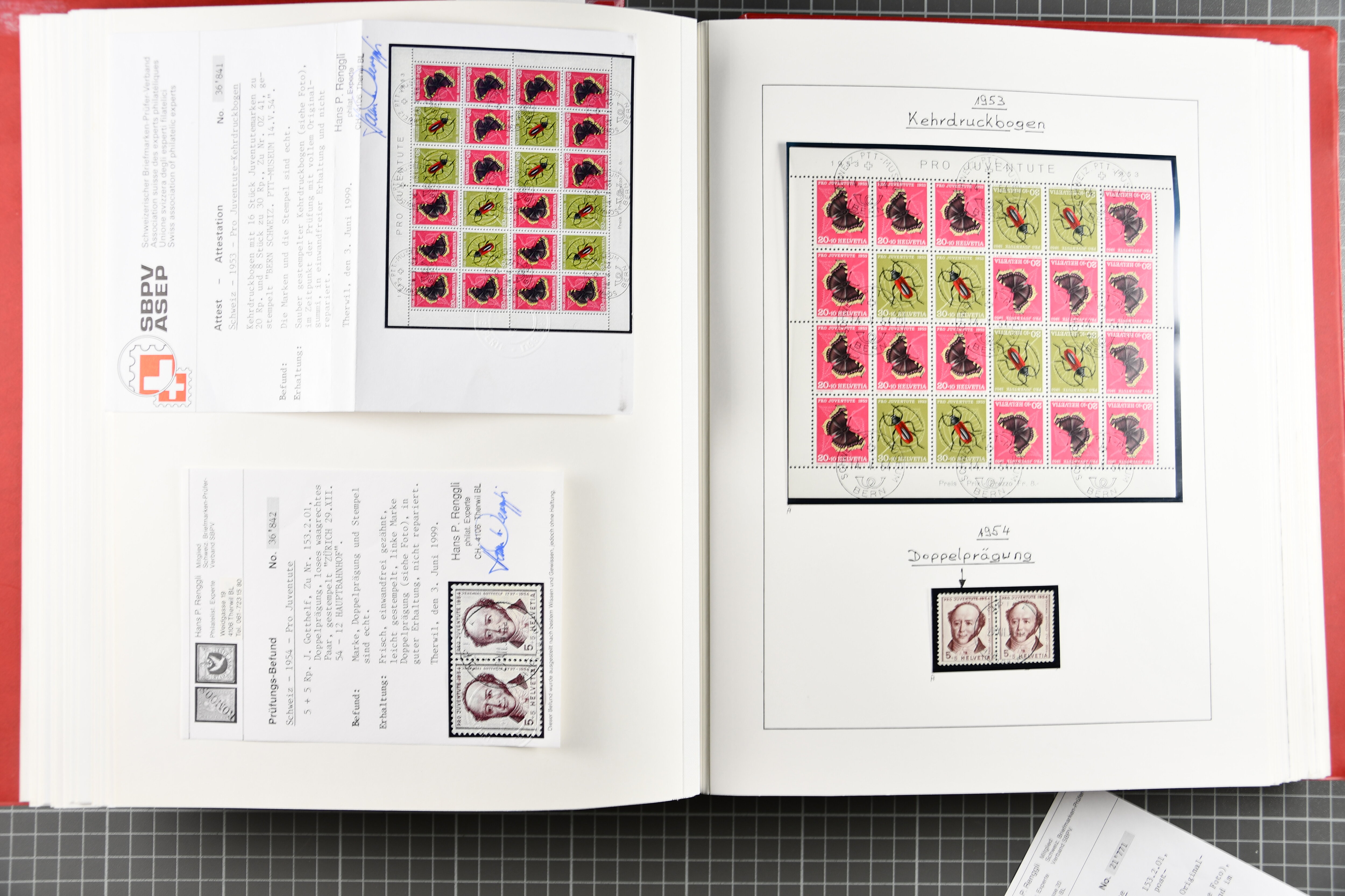 Blockausschnitten 1941 zusammen klar entw. am Ersttag mit Halbmondstempel "SCHWEIZ. POSTMUSEUM 1.XII.41", je einem postfrischen und einem schön gestempelten Kehrdruckbogen 1953 und 1954 5 Rp. "Jeremias Gotthelf" mit Doppelprägung (SBK J153DP) postfr.