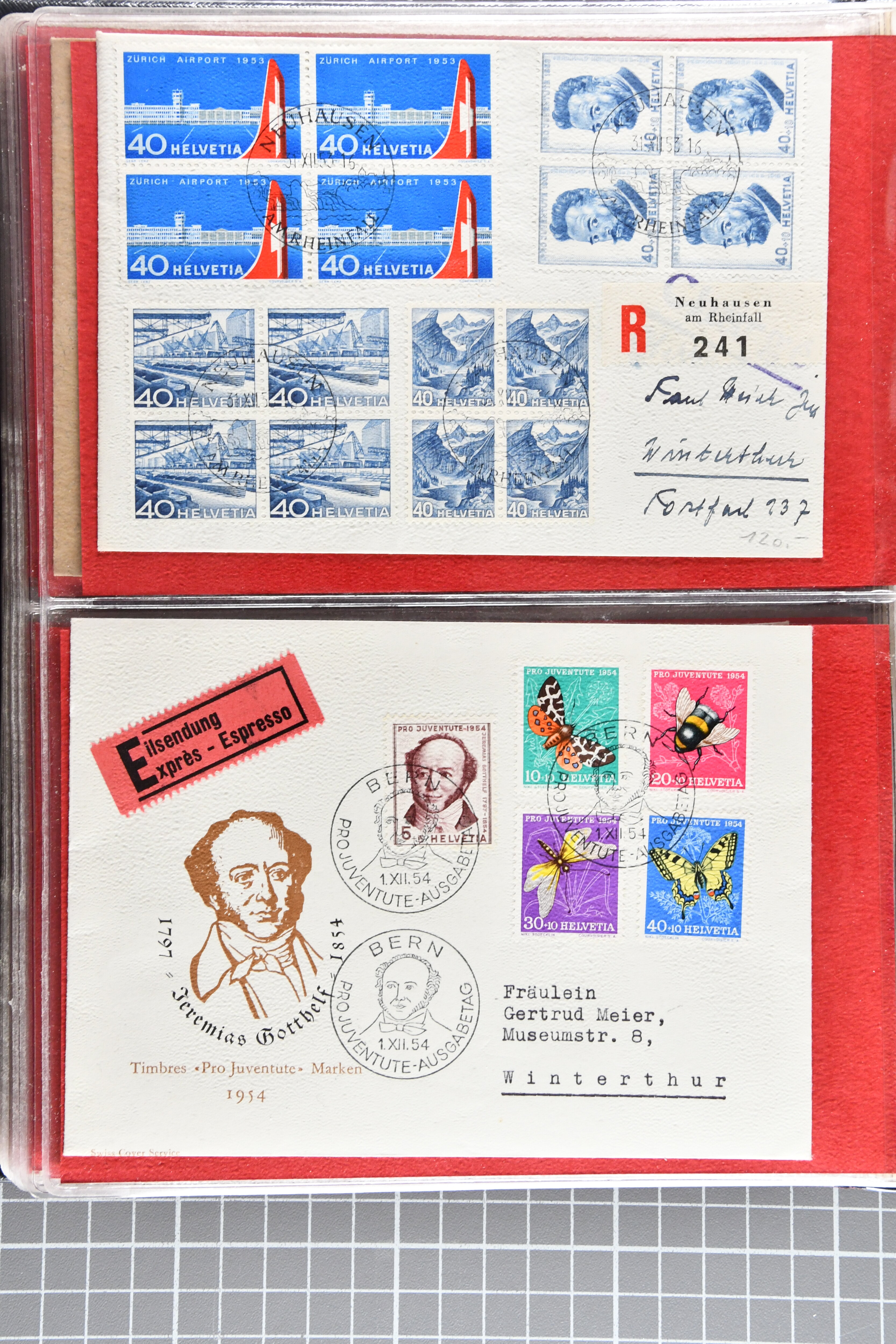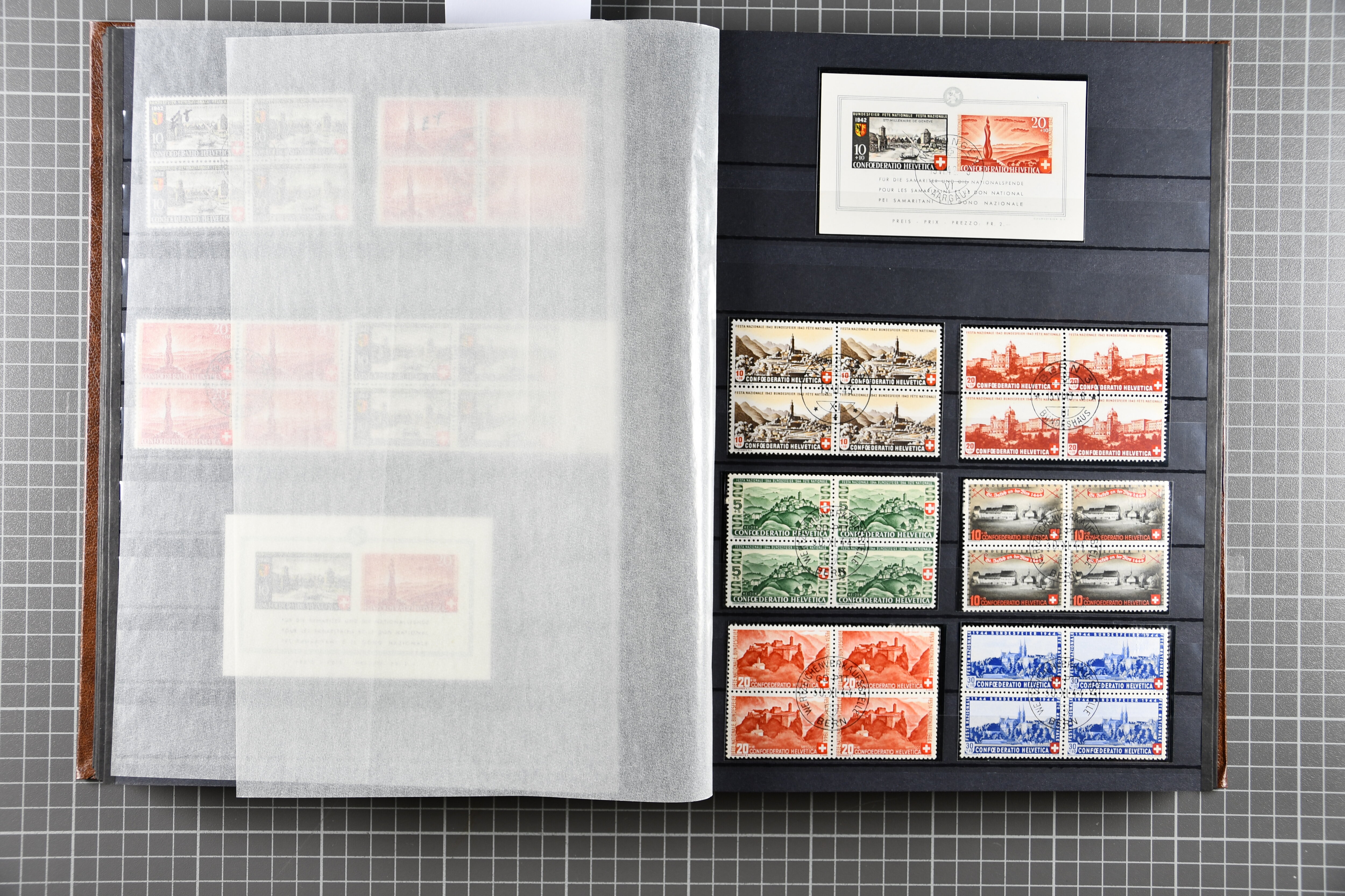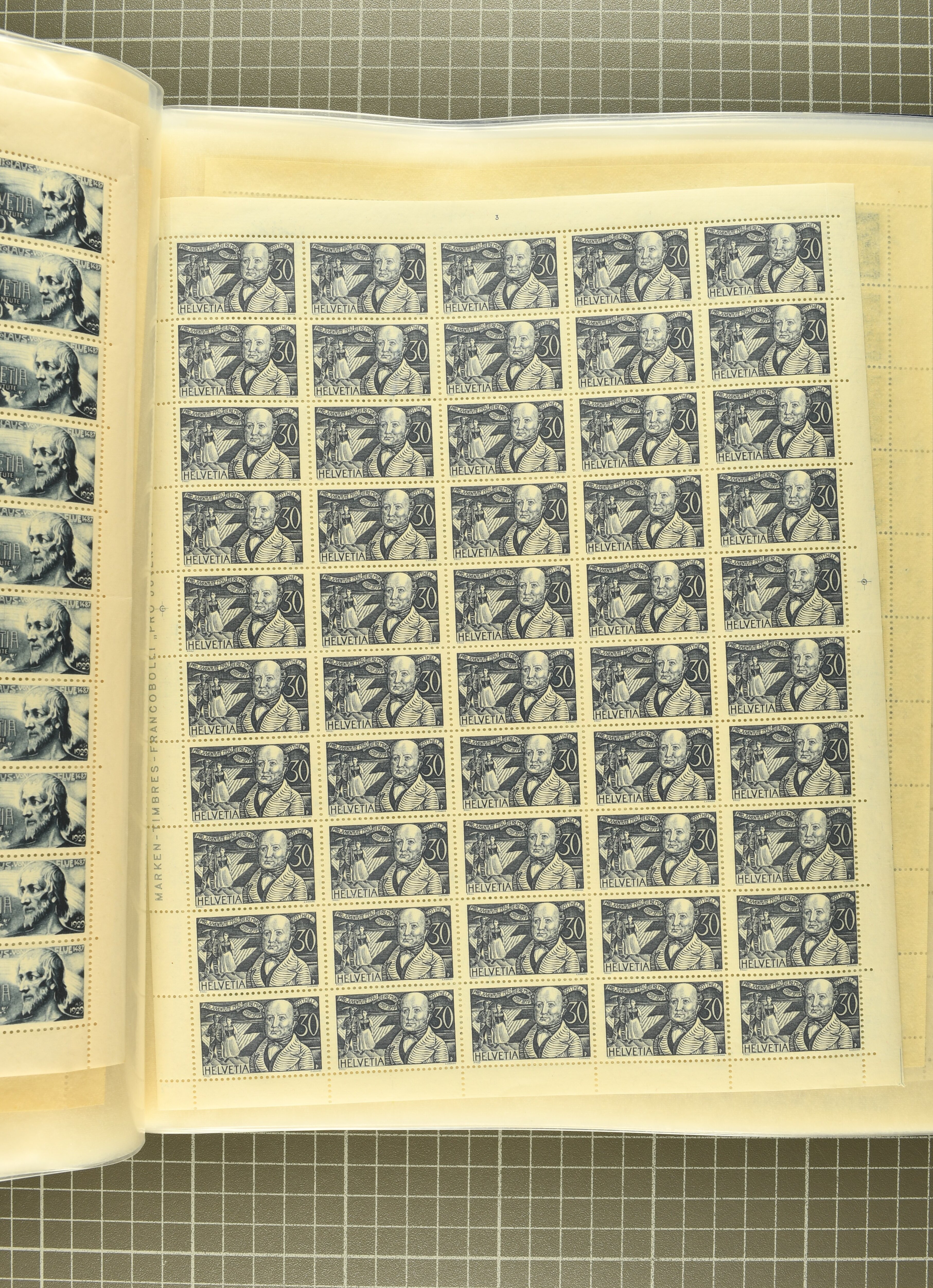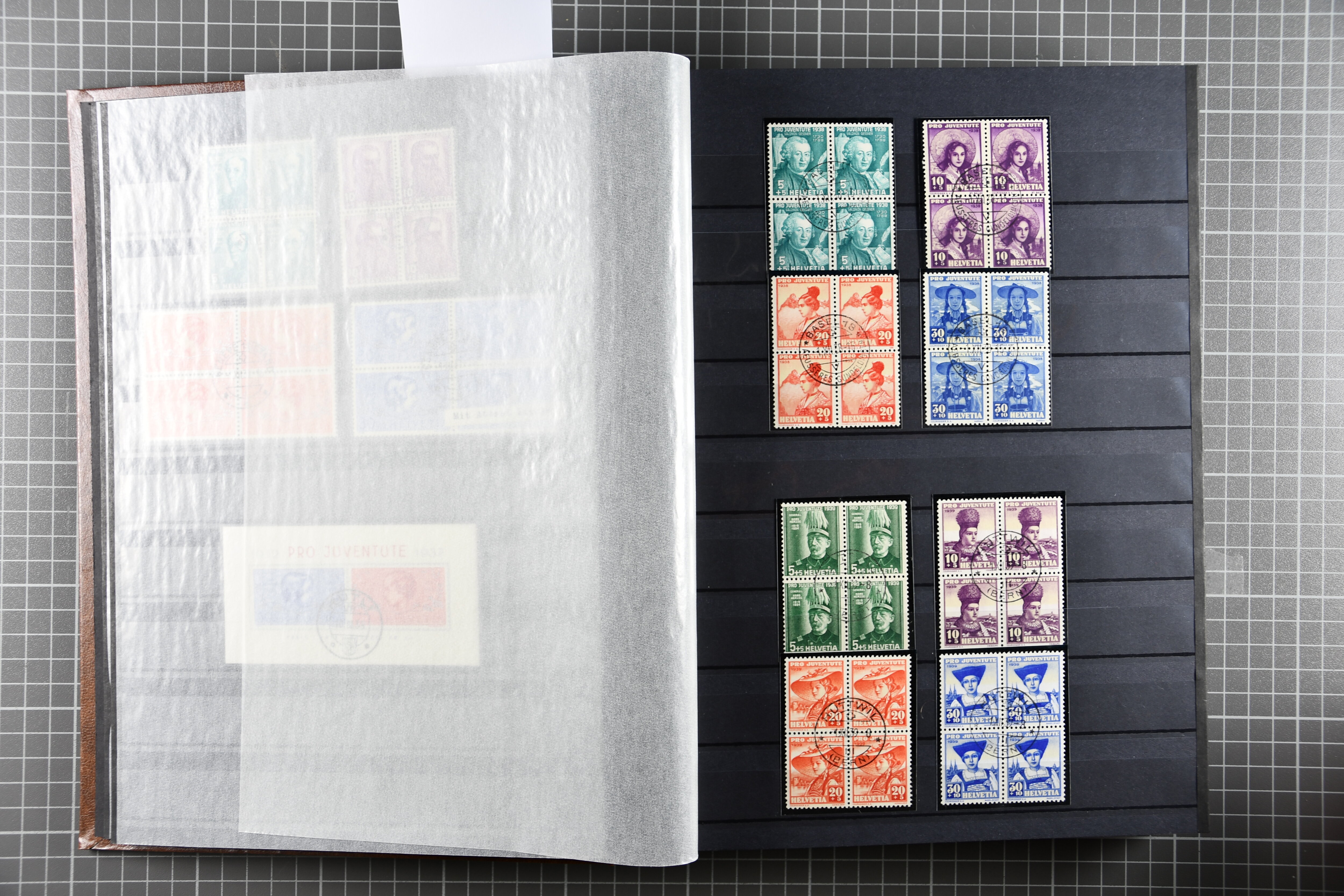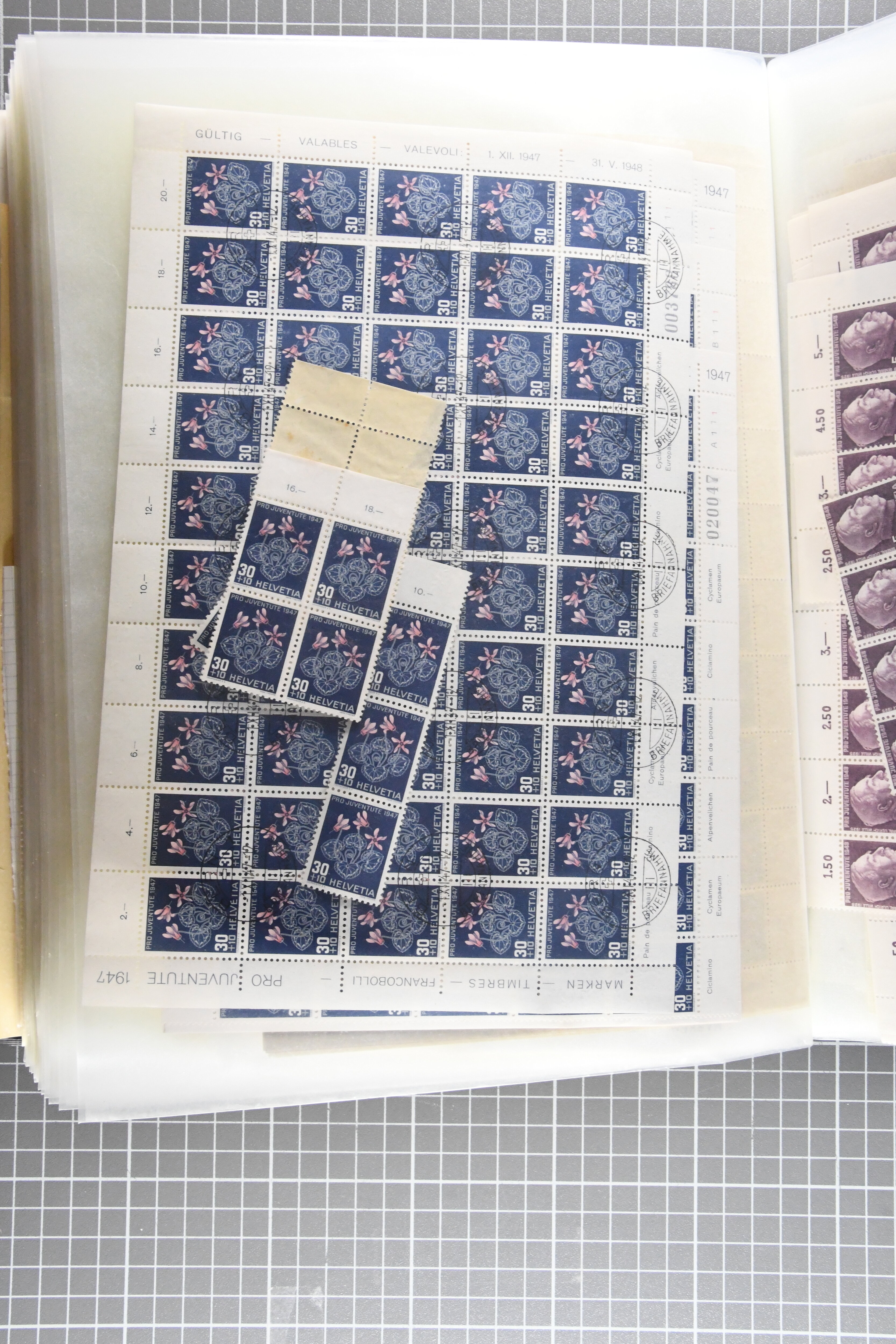 Blockausschnitten 1941 zusammen klar entw. am Ersttag mit Halbmondstempel "SCHWEIZ. POSTMUSEUM 1.XII.41", je einem postfrischen und einem schön gestempelten Kehrdruckbogen 1953 und 1954 5 Rp. "Jeremias Gotthelf" mit Doppelprägung (SBK J153DP) postfr.