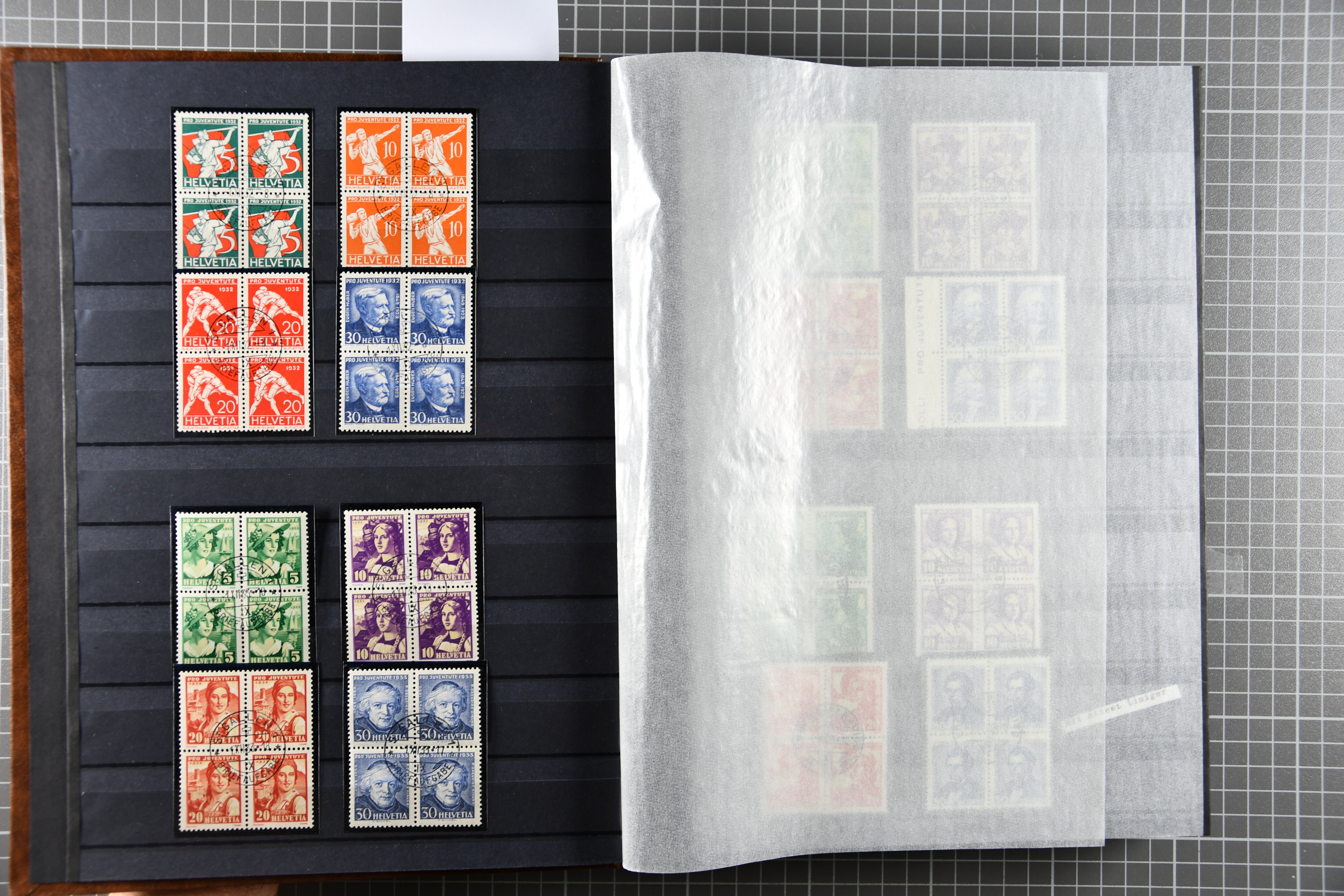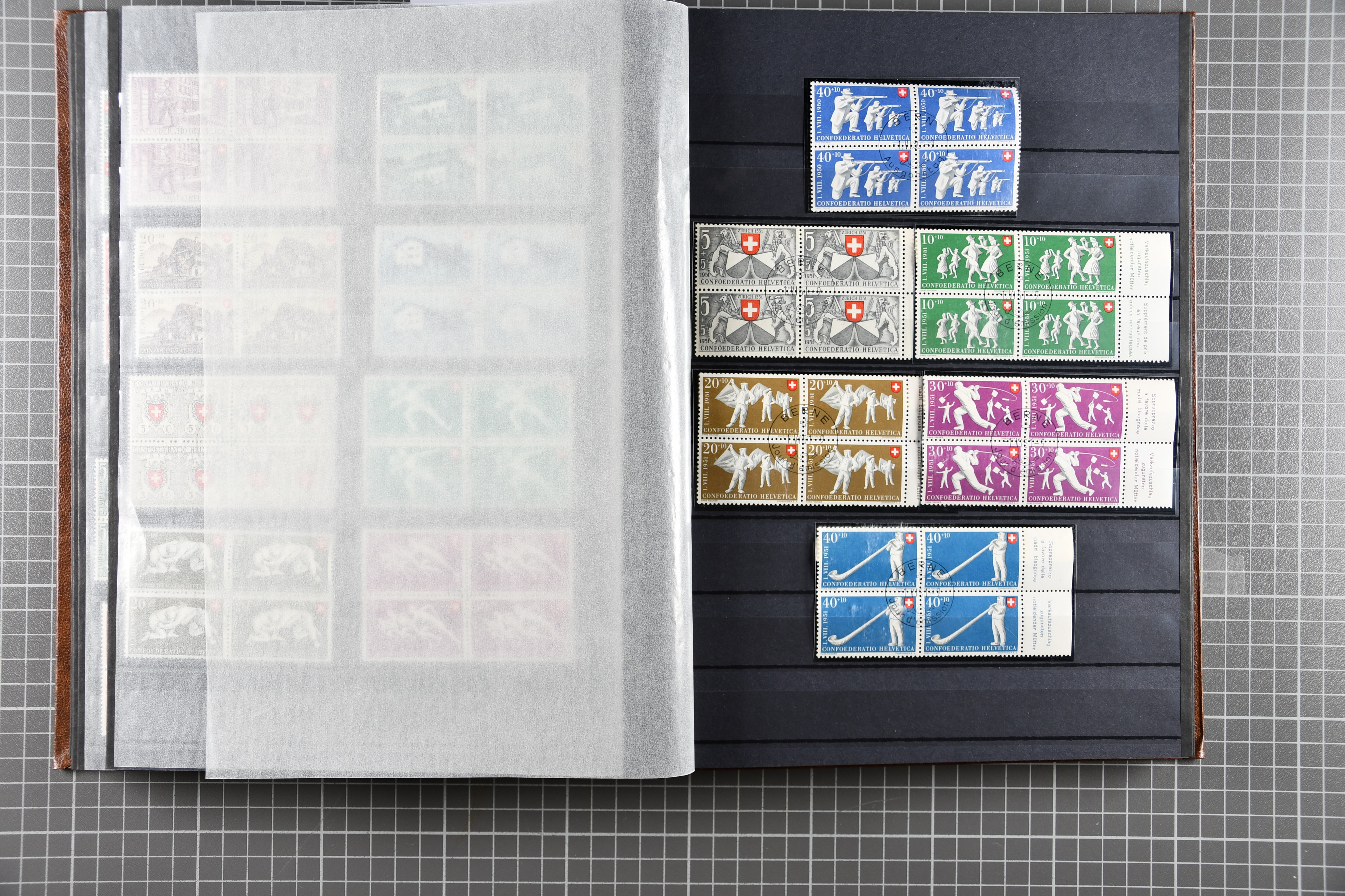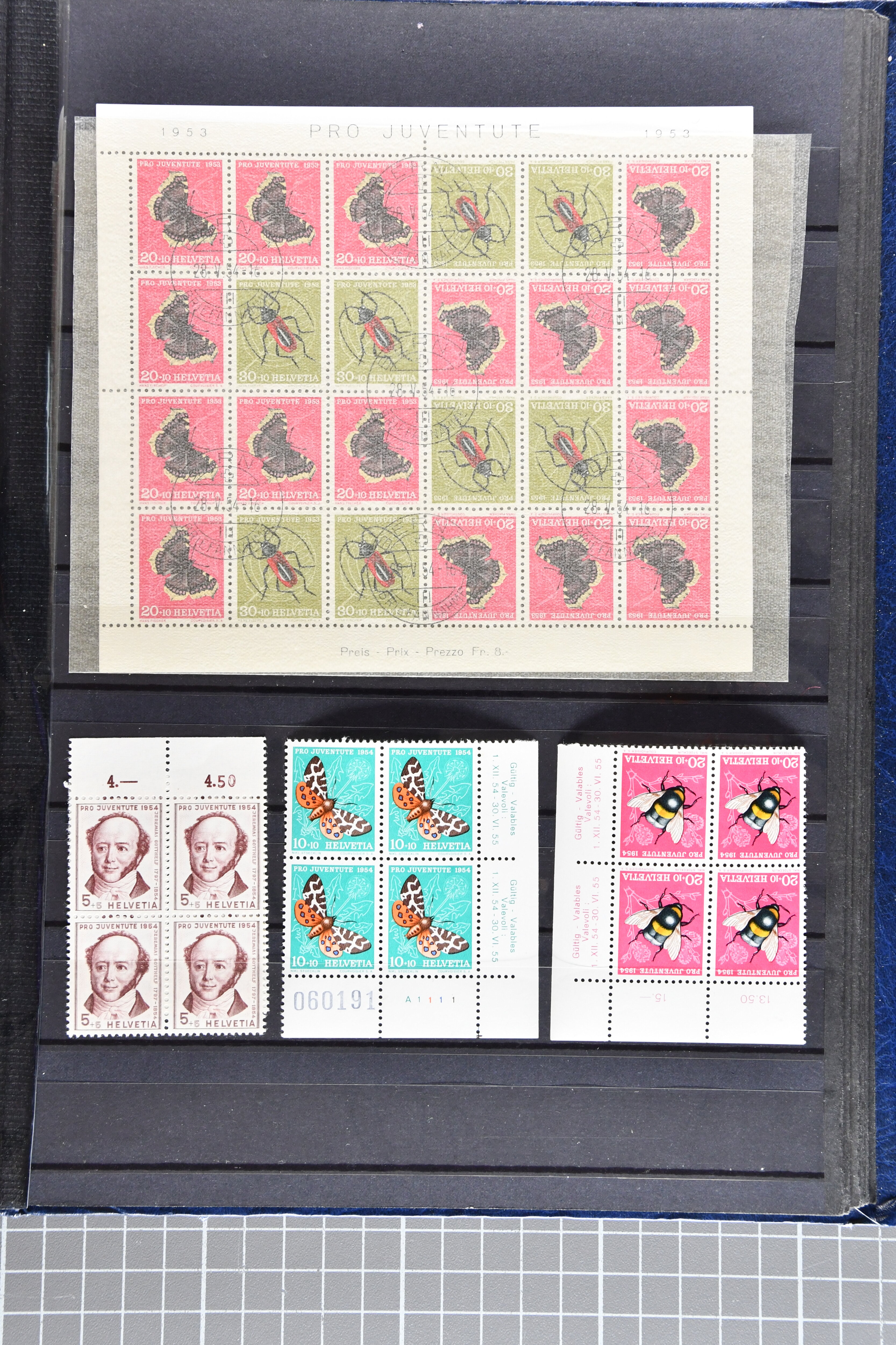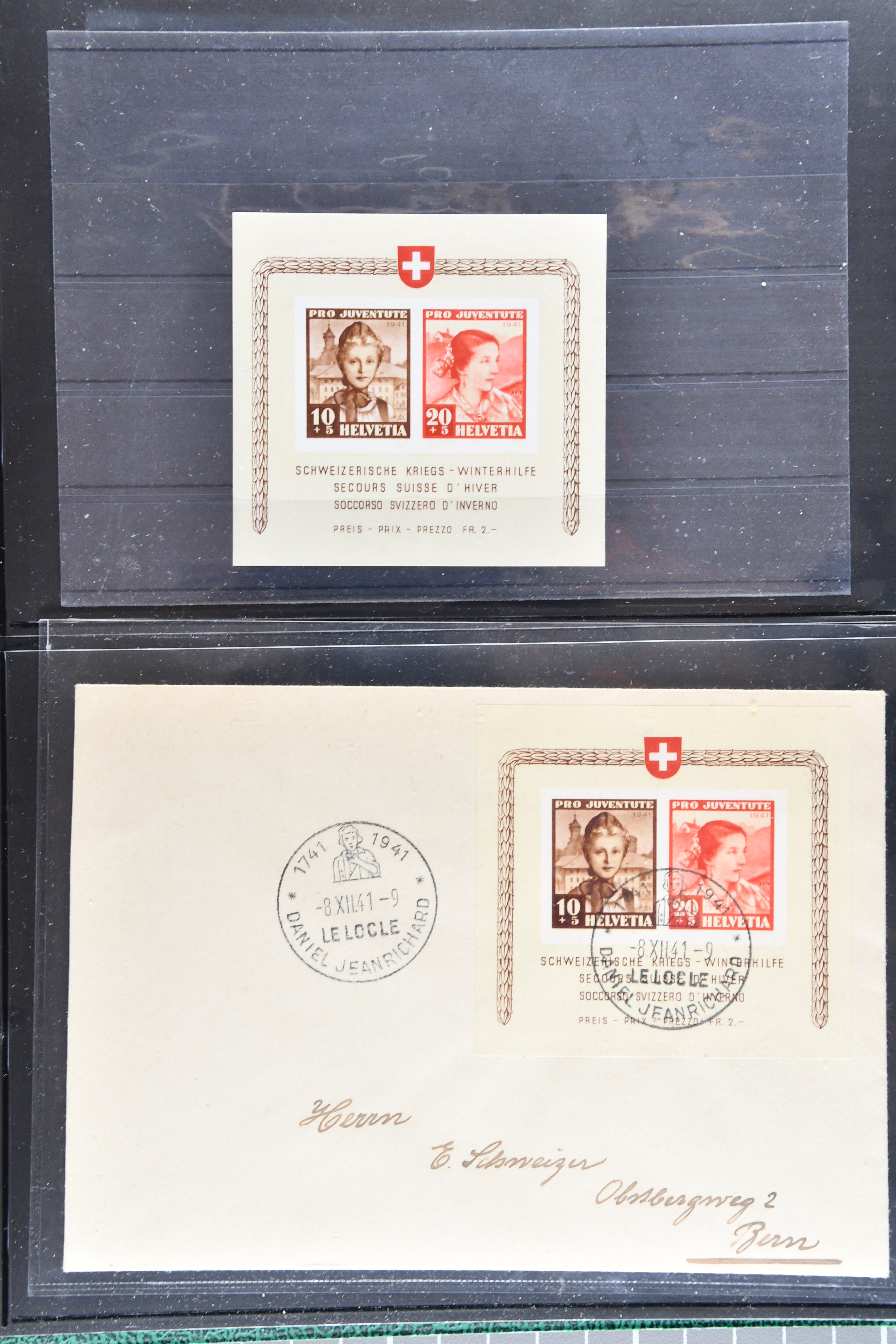 Blockausschnitten 1941 zusammen klar entw. am Ersttag mit Halbmondstempel "SCHWEIZ. POSTMUSEUM 1.XII.41", je einem postfrischen und einem schön gestempelten Kehrdruckbogen 1953 und 1954 5 Rp. "Jeremias Gotthelf" mit Doppelprägung (SBK J153DP) postfr.