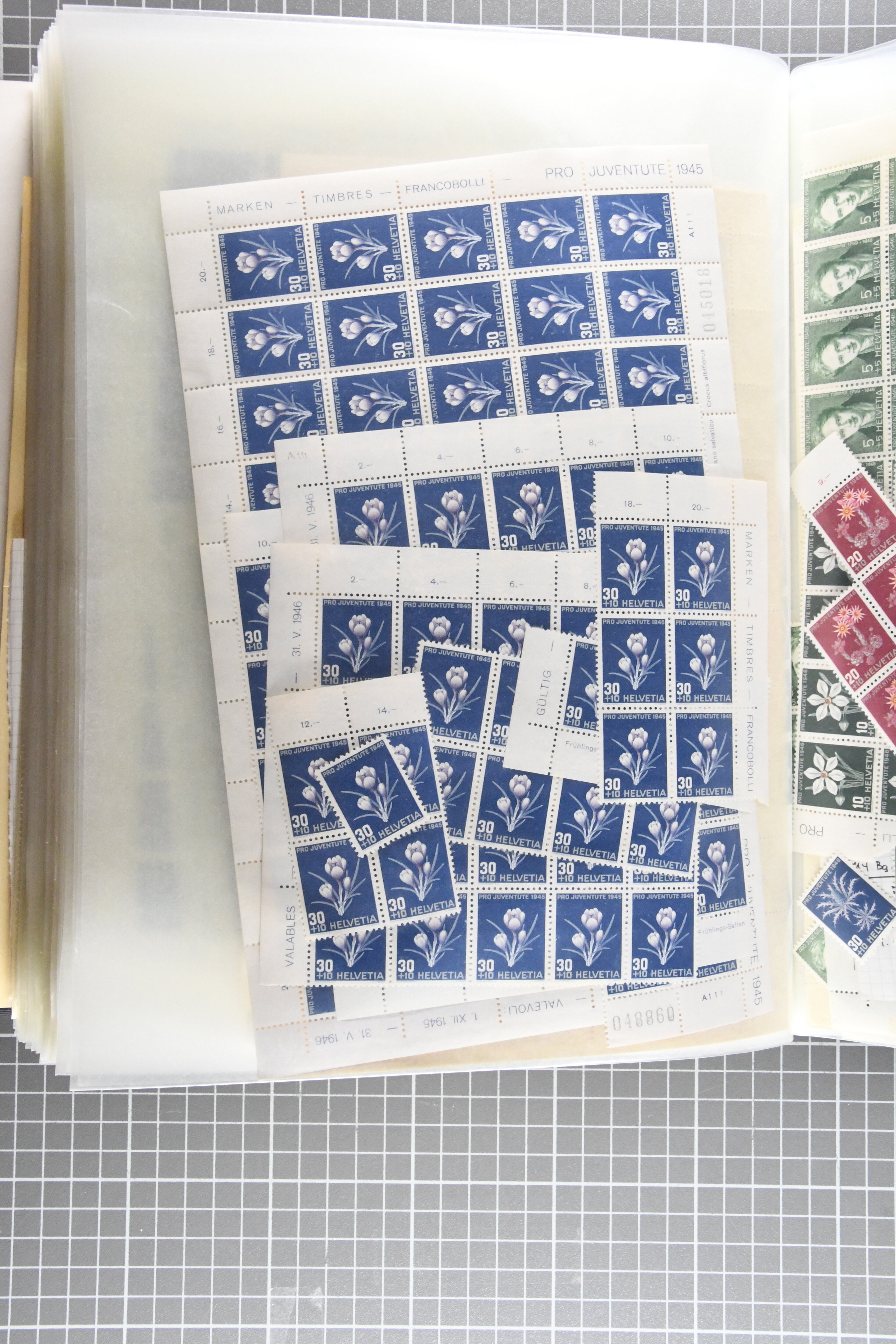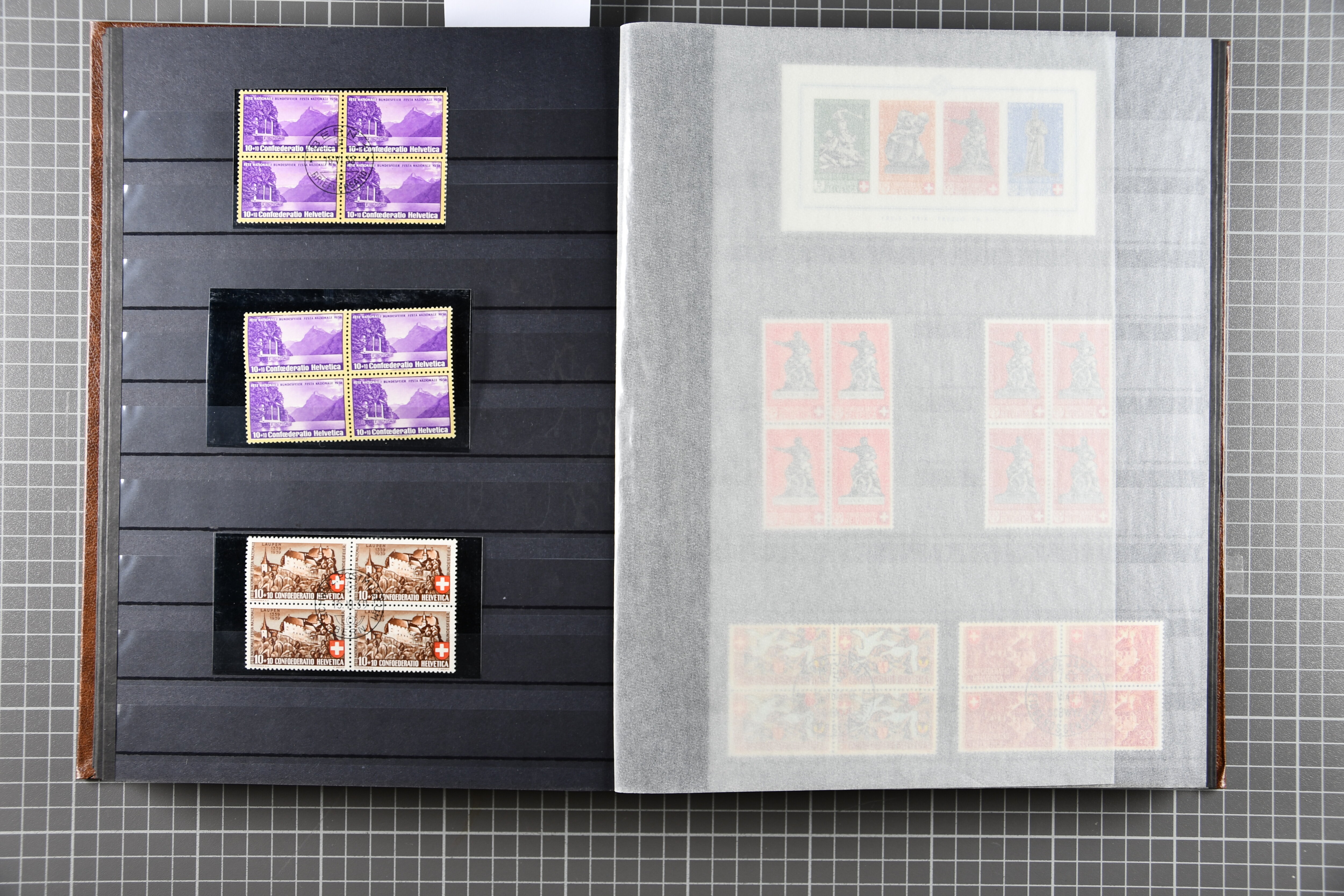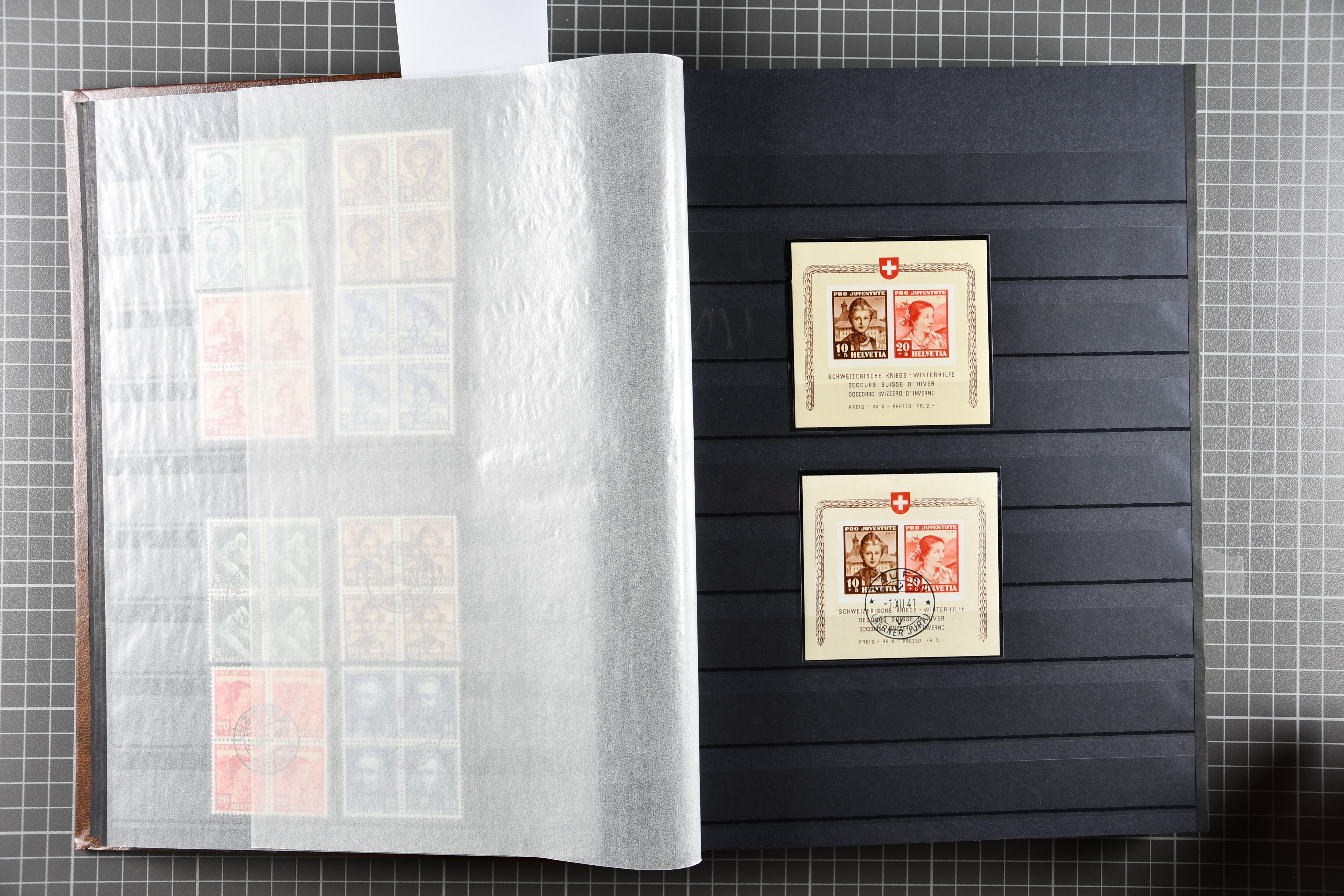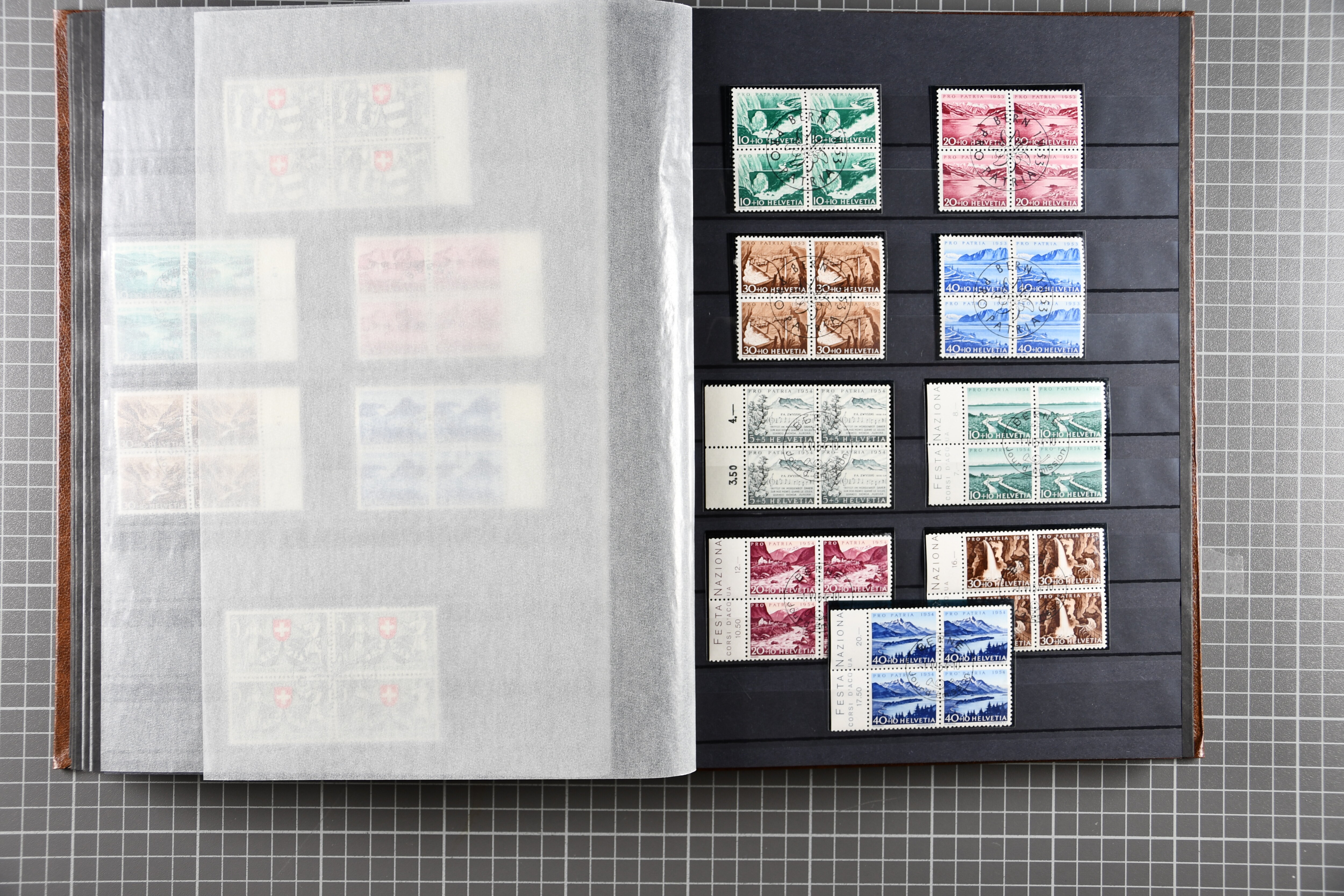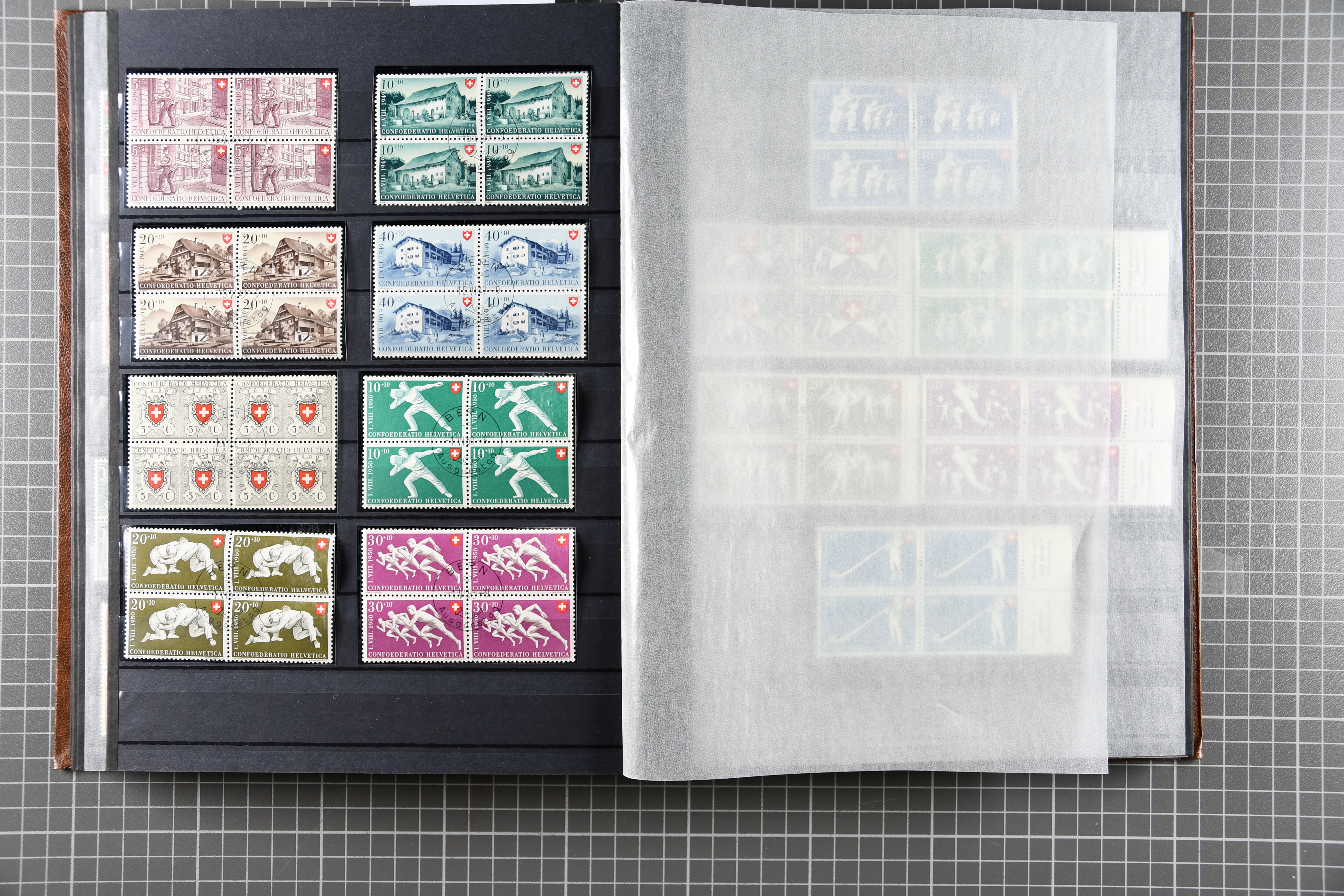 Blockausschnitten 1941 zusammen klar entw. am Ersttag mit Halbmondstempel "SCHWEIZ. POSTMUSEUM 1.XII.41", je einem postfrischen und einem schön gestempelten Kehrdruckbogen 1953 und 1954 5 Rp. "Jeremias Gotthelf" mit Doppelprägung (SBK J153DP) postfr.