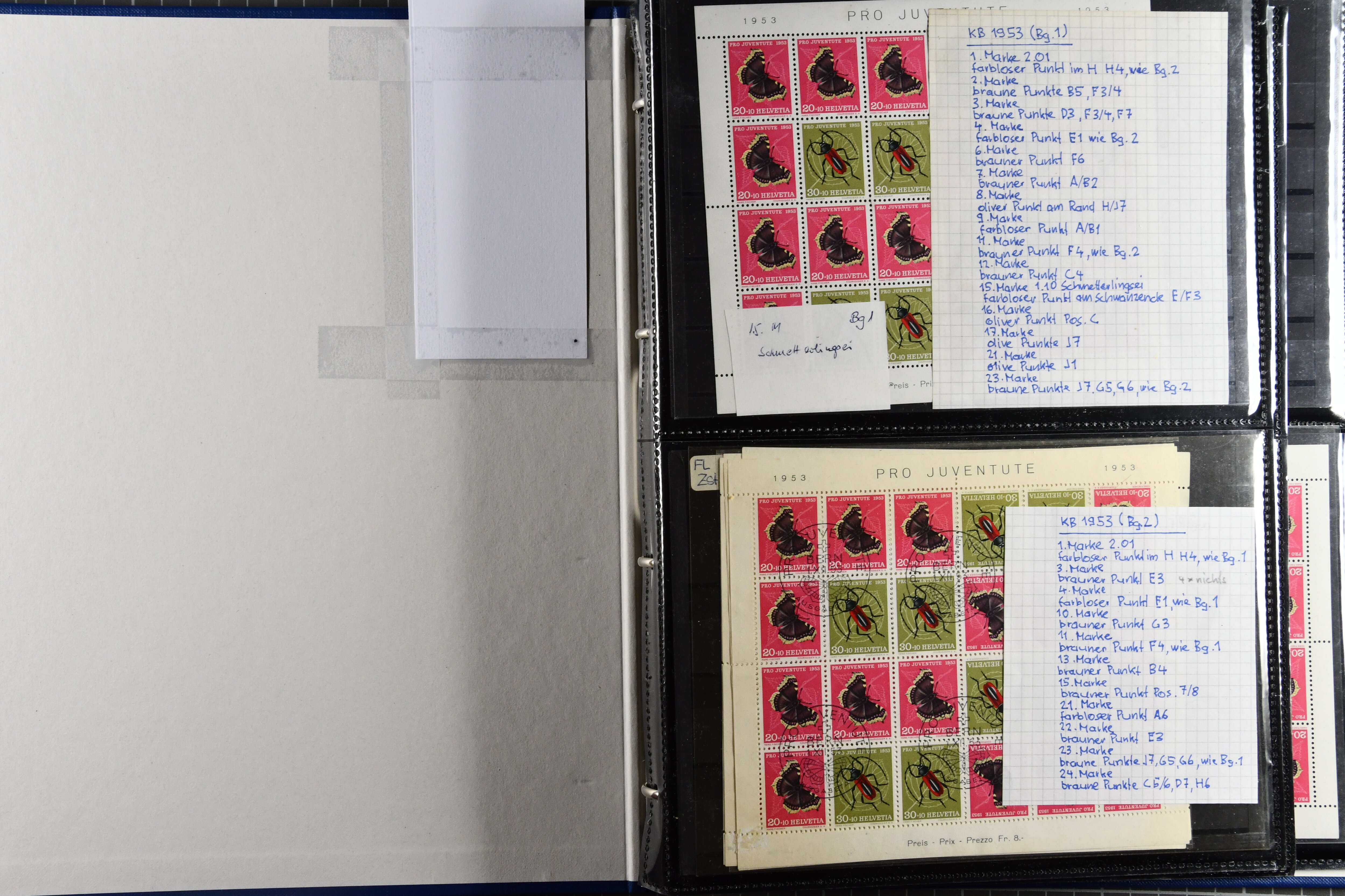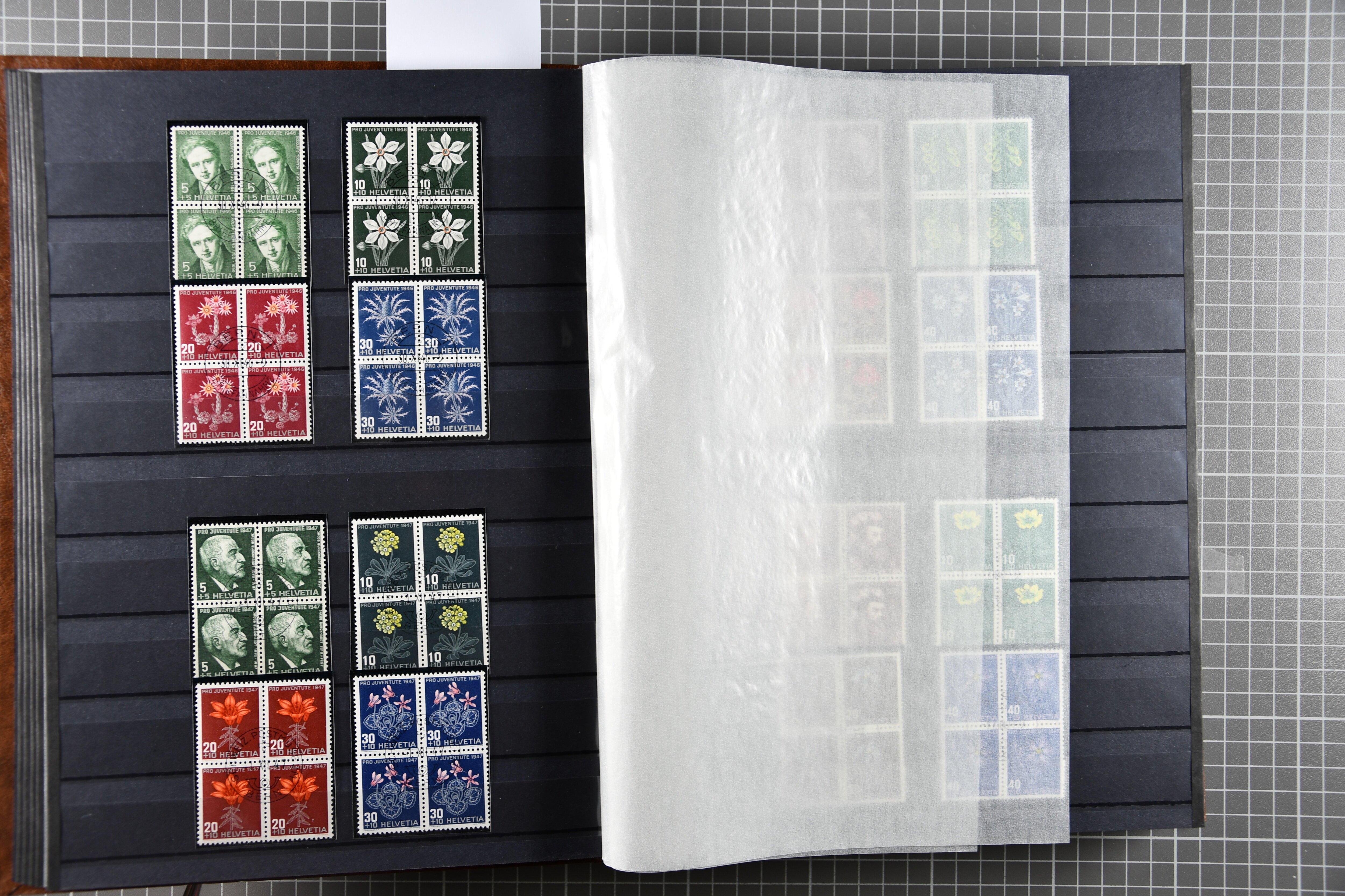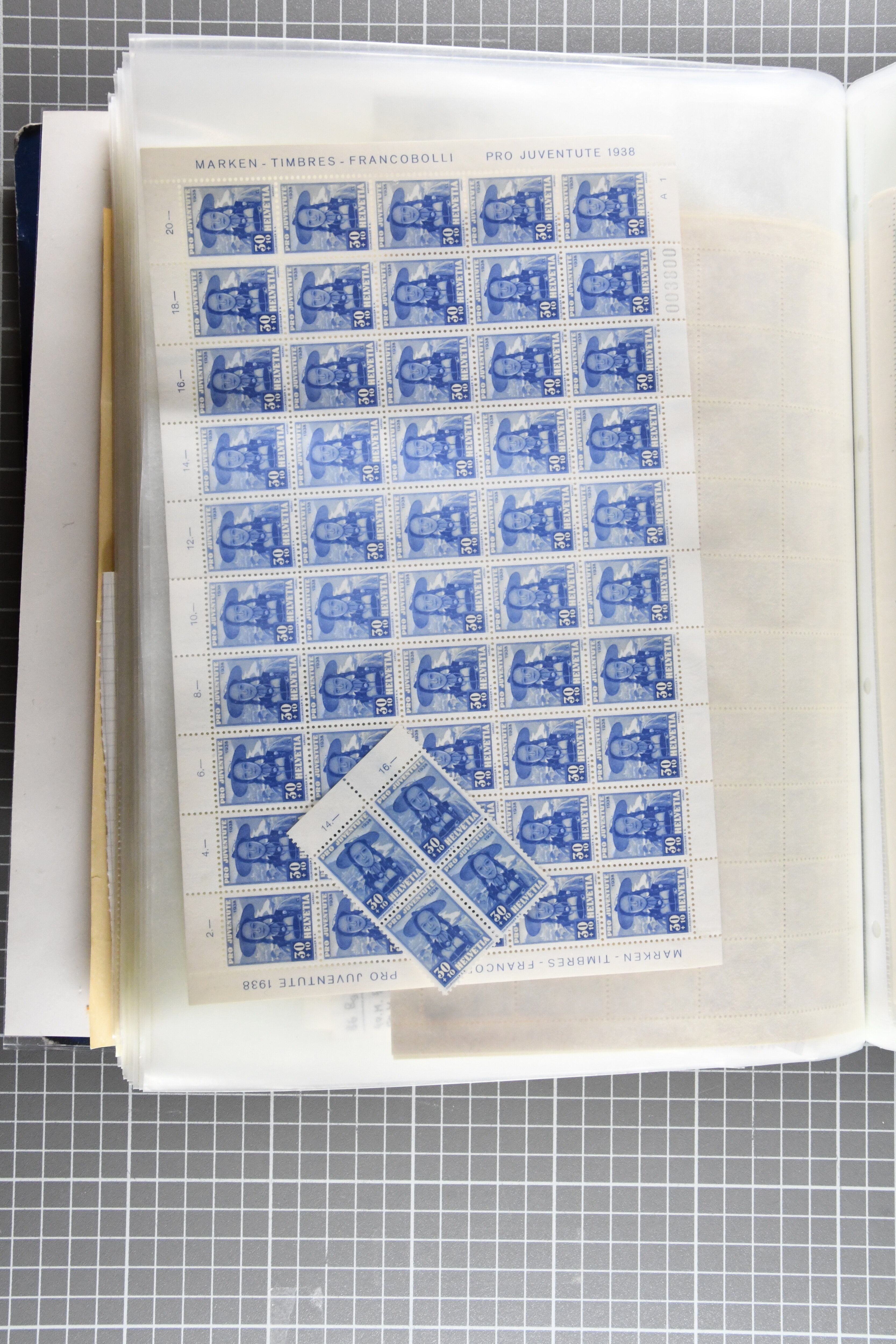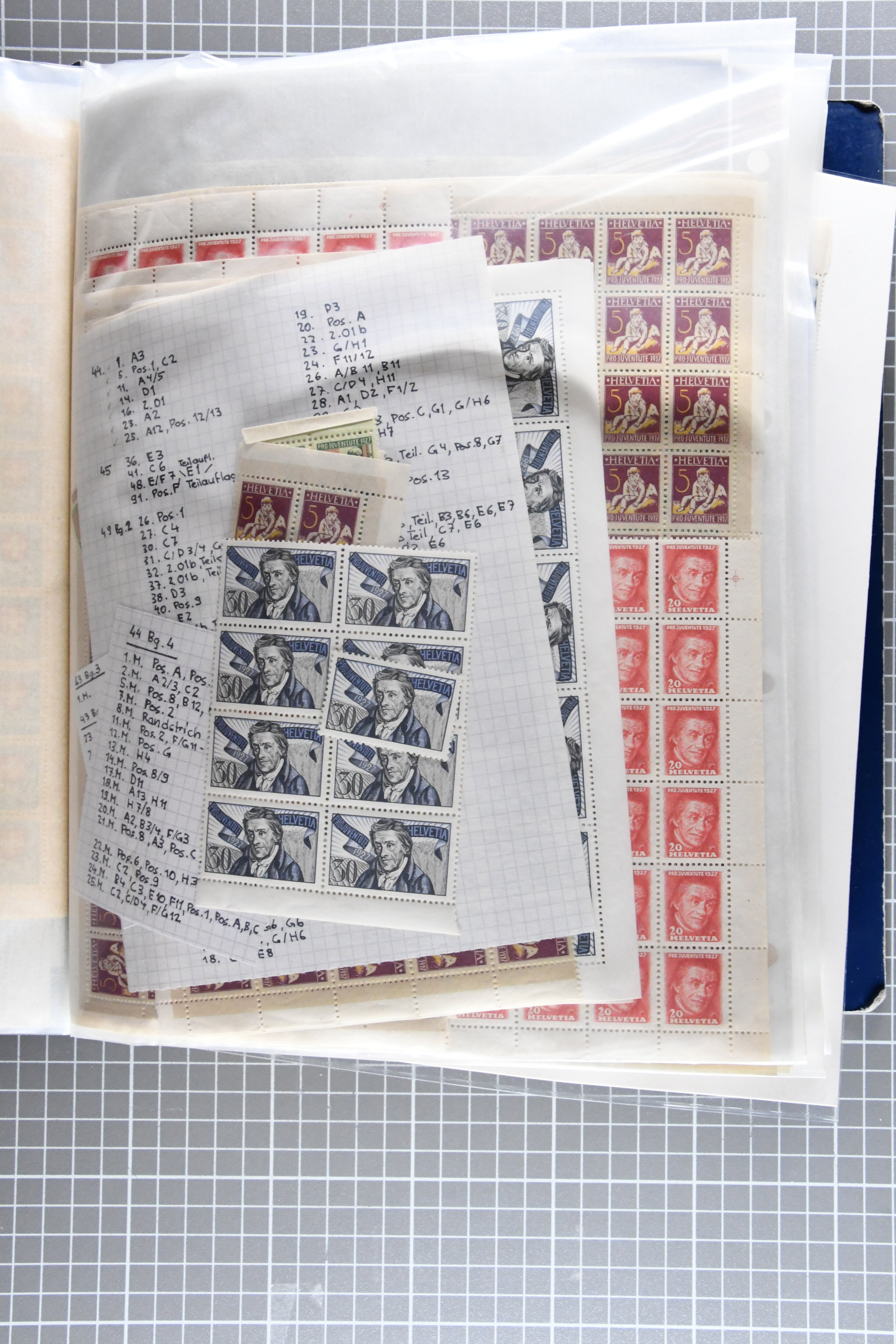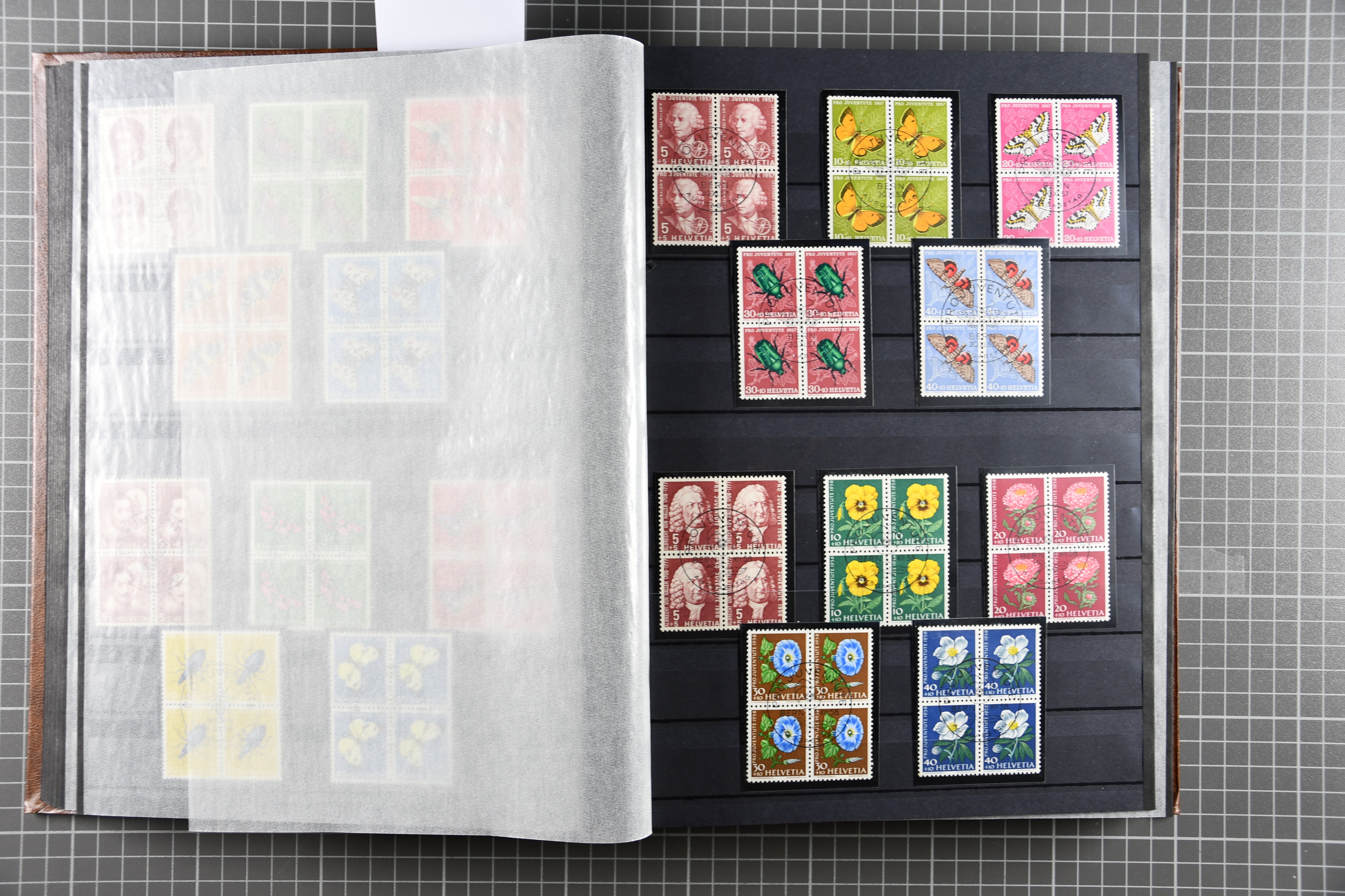 Blockausschnitten 1941 zusammen klar entw. am Ersttag mit Halbmondstempel "SCHWEIZ. POSTMUSEUM 1.XII.41", je einem postfrischen und einem schön gestempelten Kehrdruckbogen 1953 und 1954 5 Rp. "Jeremias Gotthelf" mit Doppelprägung (SBK J153DP) postfr.