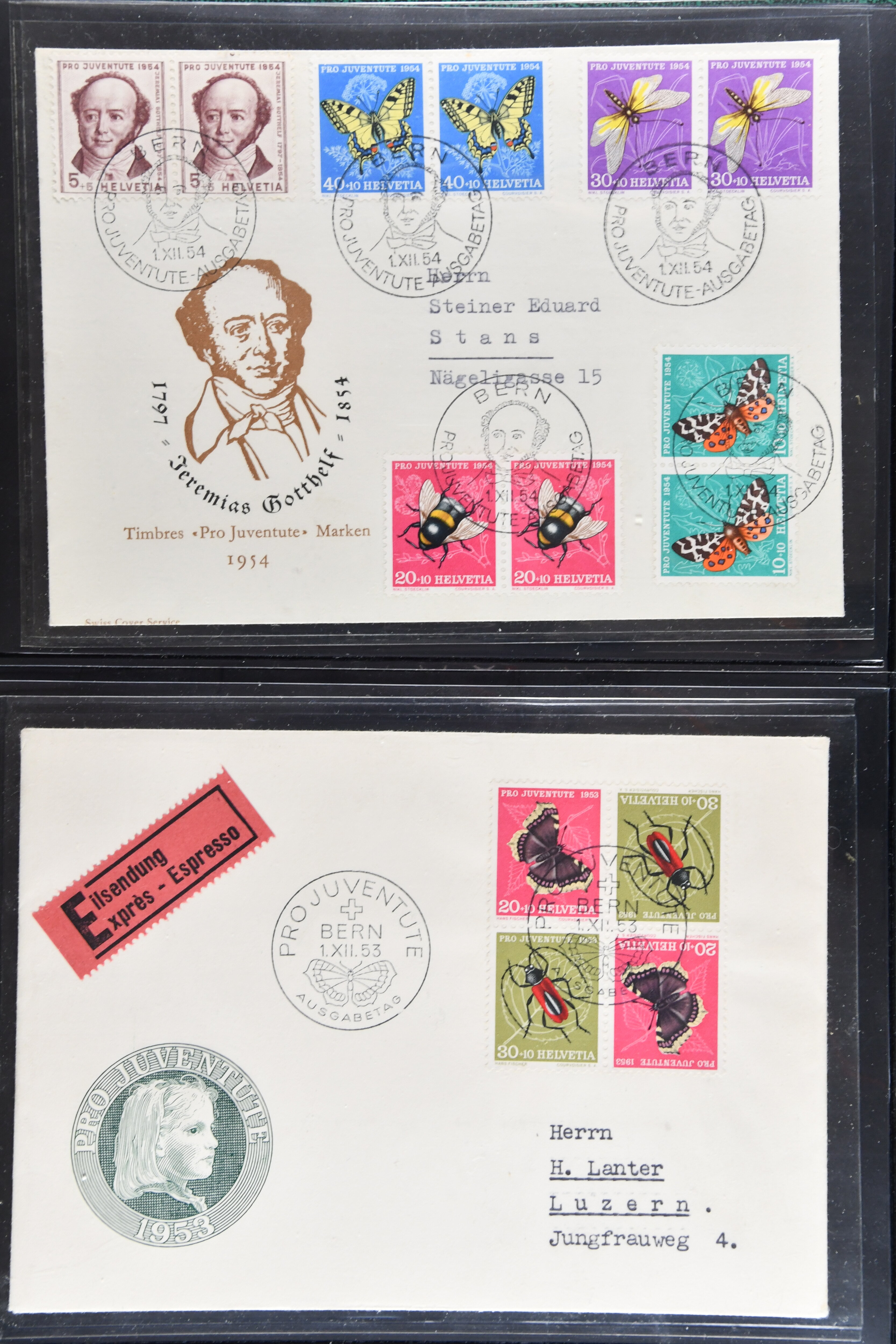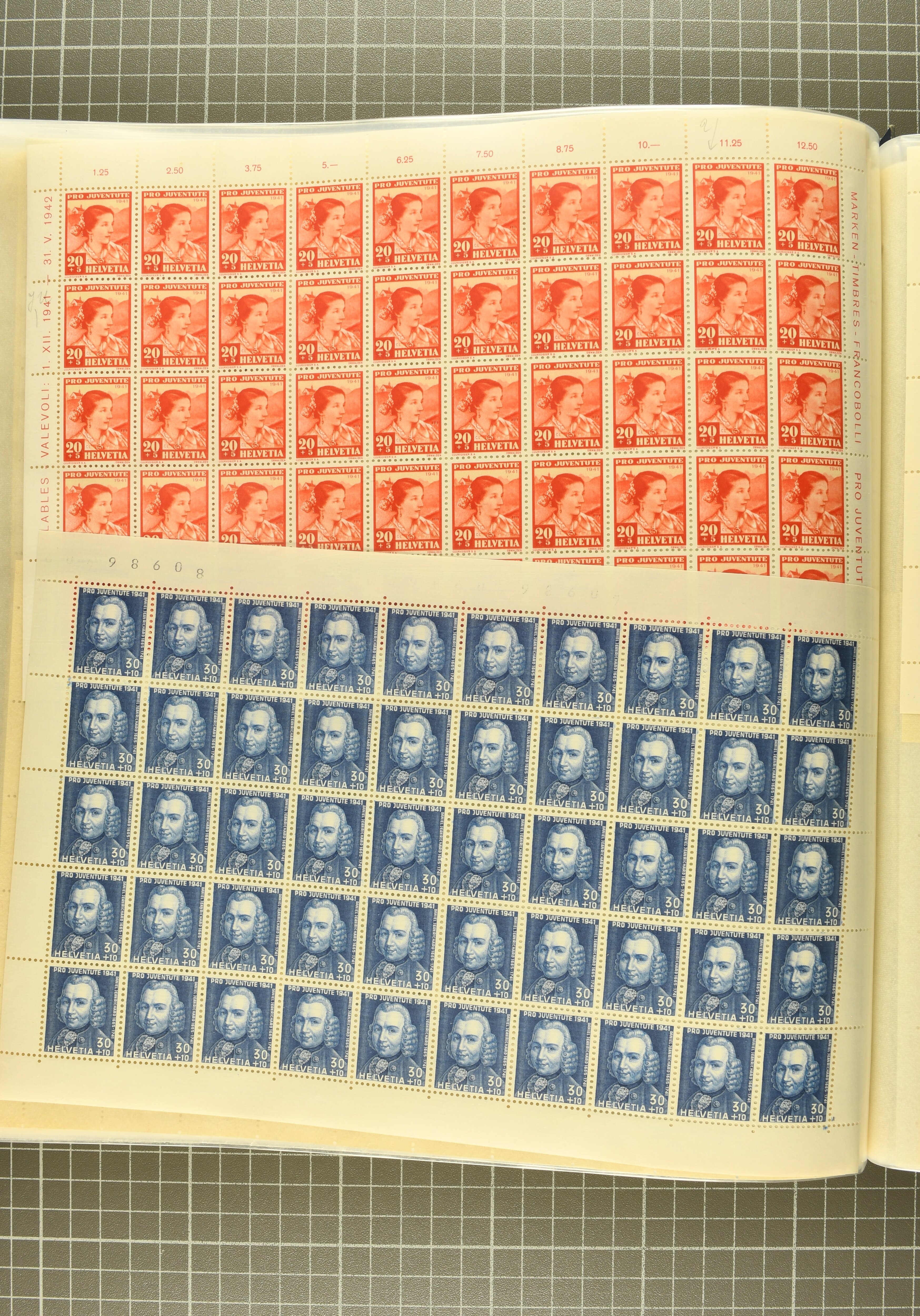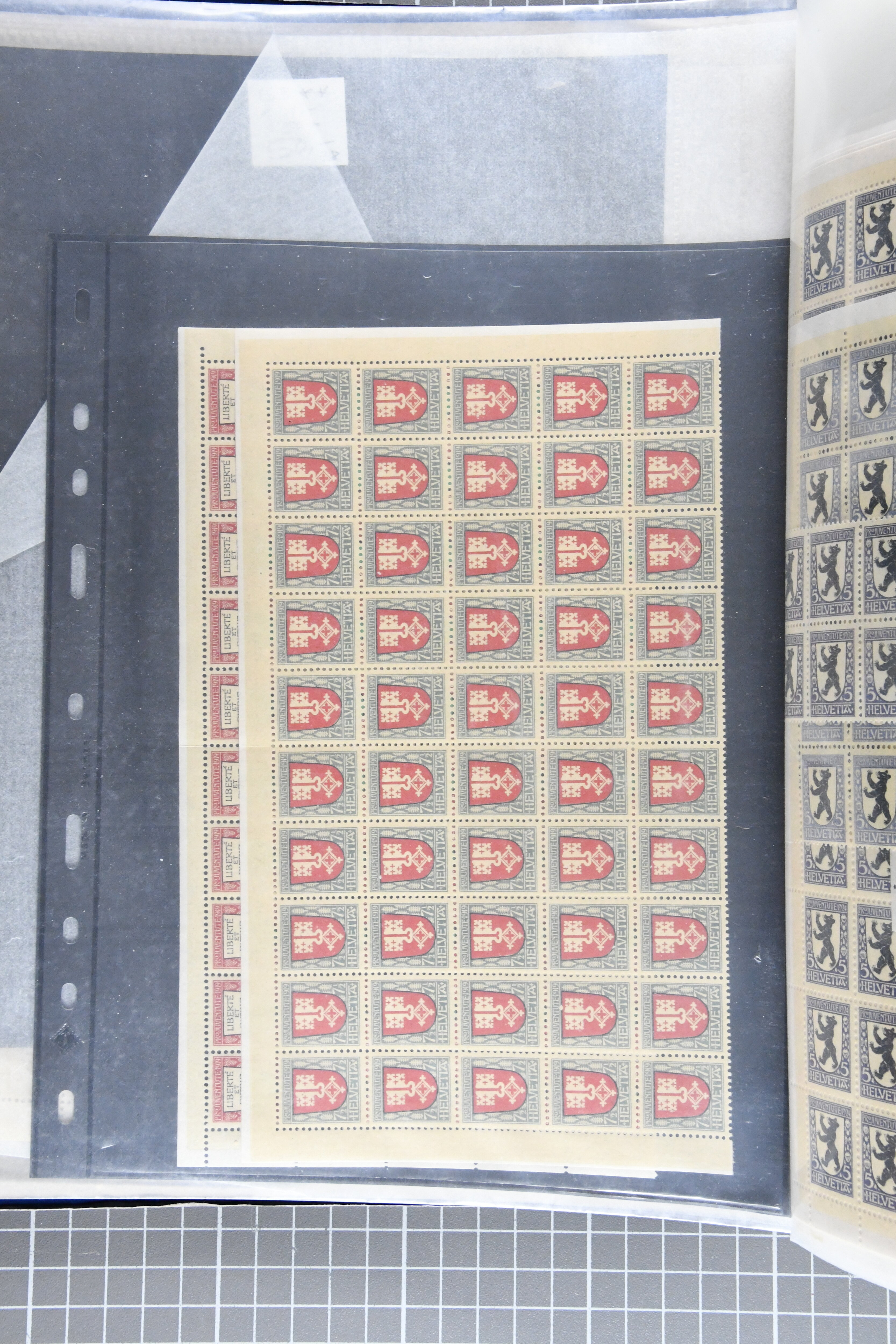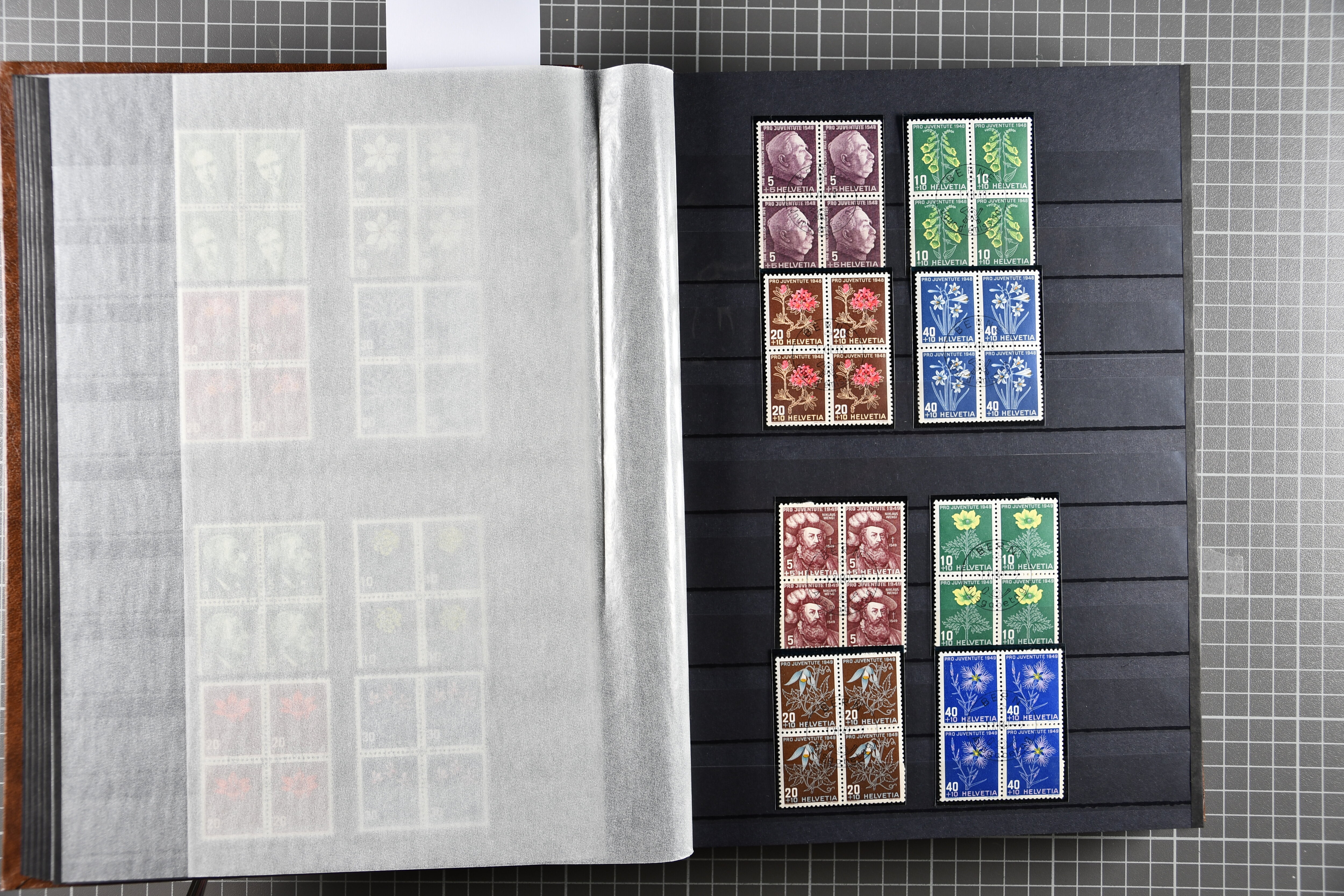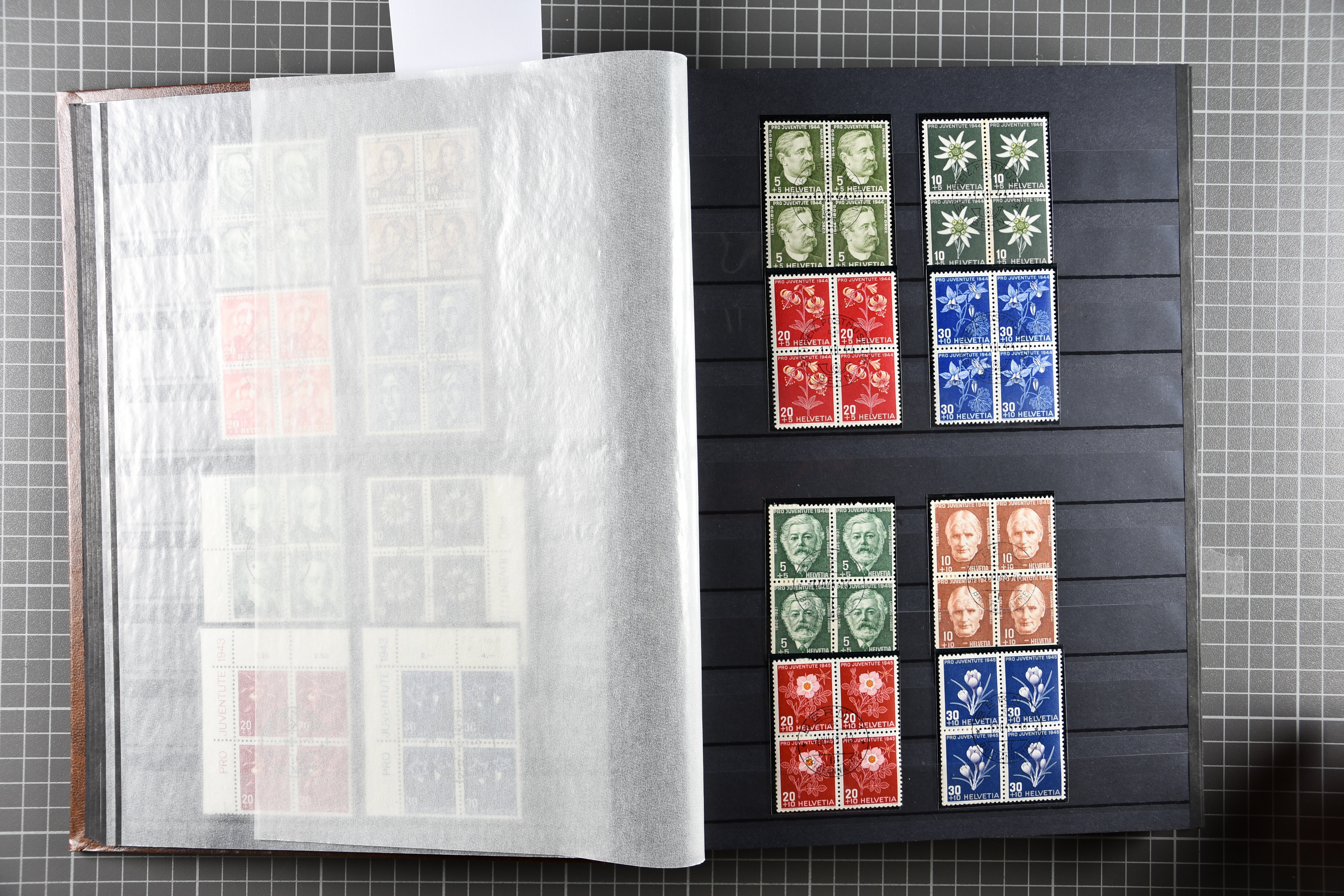 Blockausschnitten 1941 zusammen klar entw. am Ersttag mit Halbmondstempel "SCHWEIZ. POSTMUSEUM 1.XII.41", je einem postfrischen und einem schön gestempelten Kehrdruckbogen 1953 und 1954 5 Rp. "Jeremias Gotthelf" mit Doppelprägung (SBK J153DP) postfr.