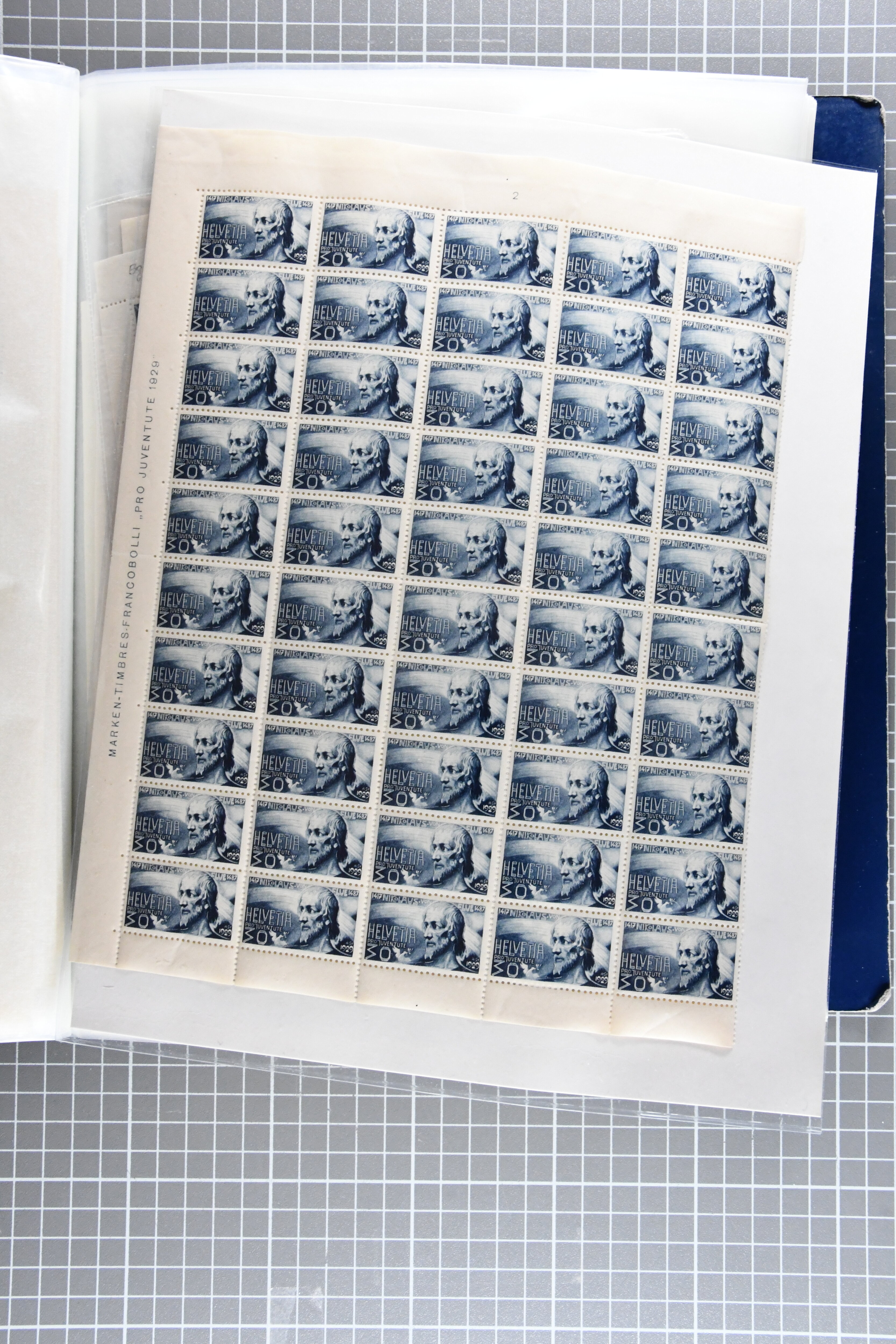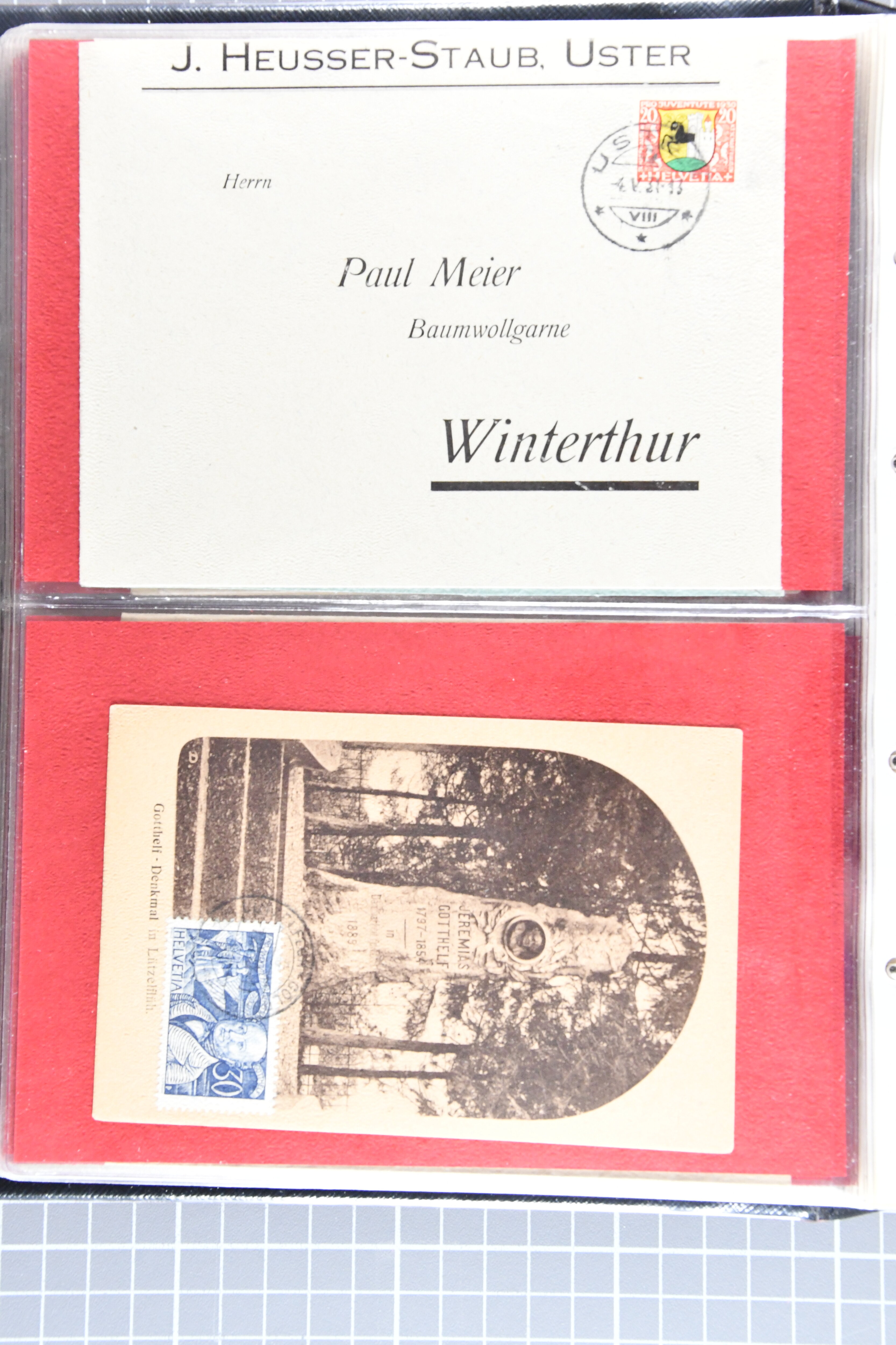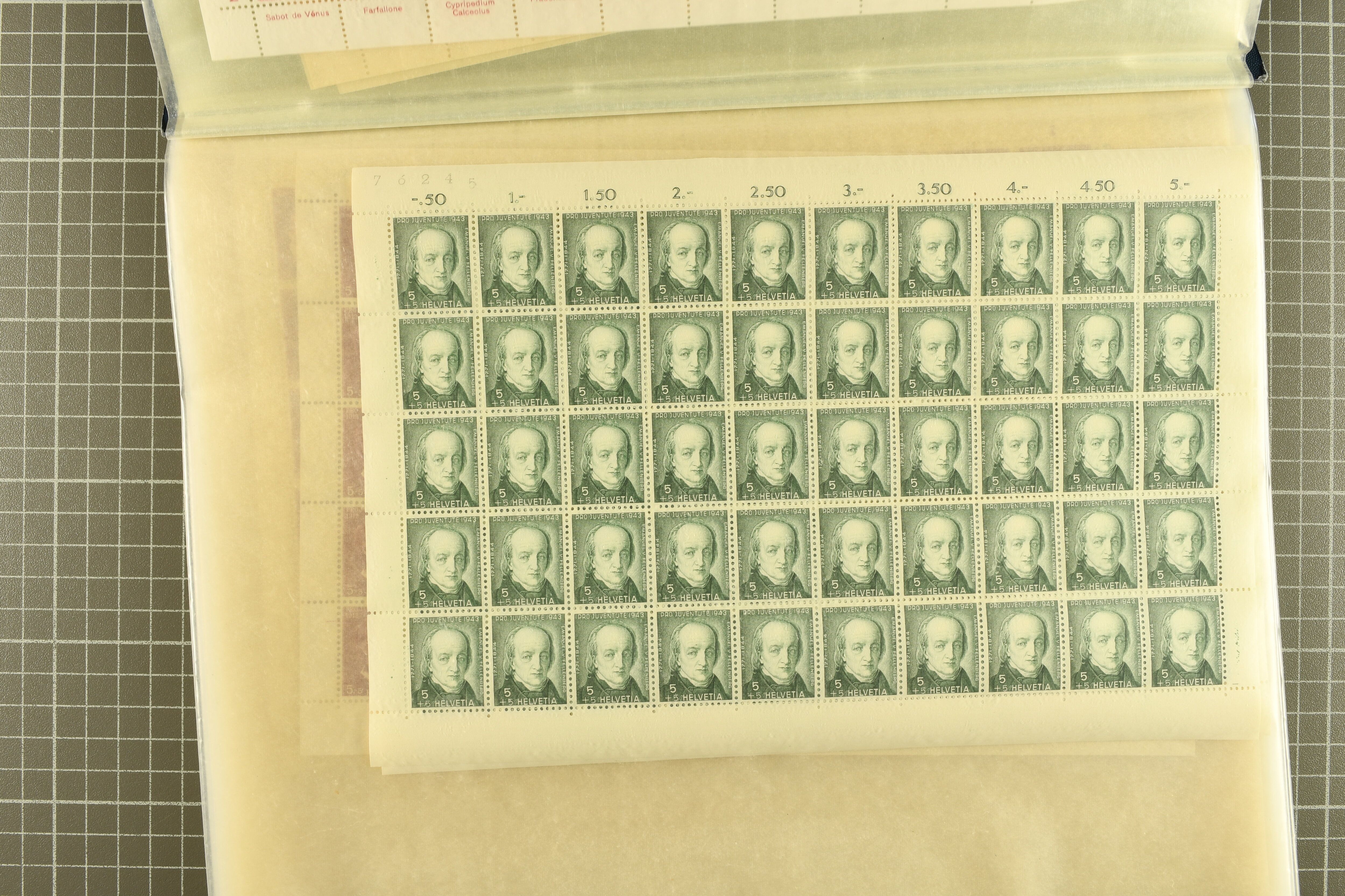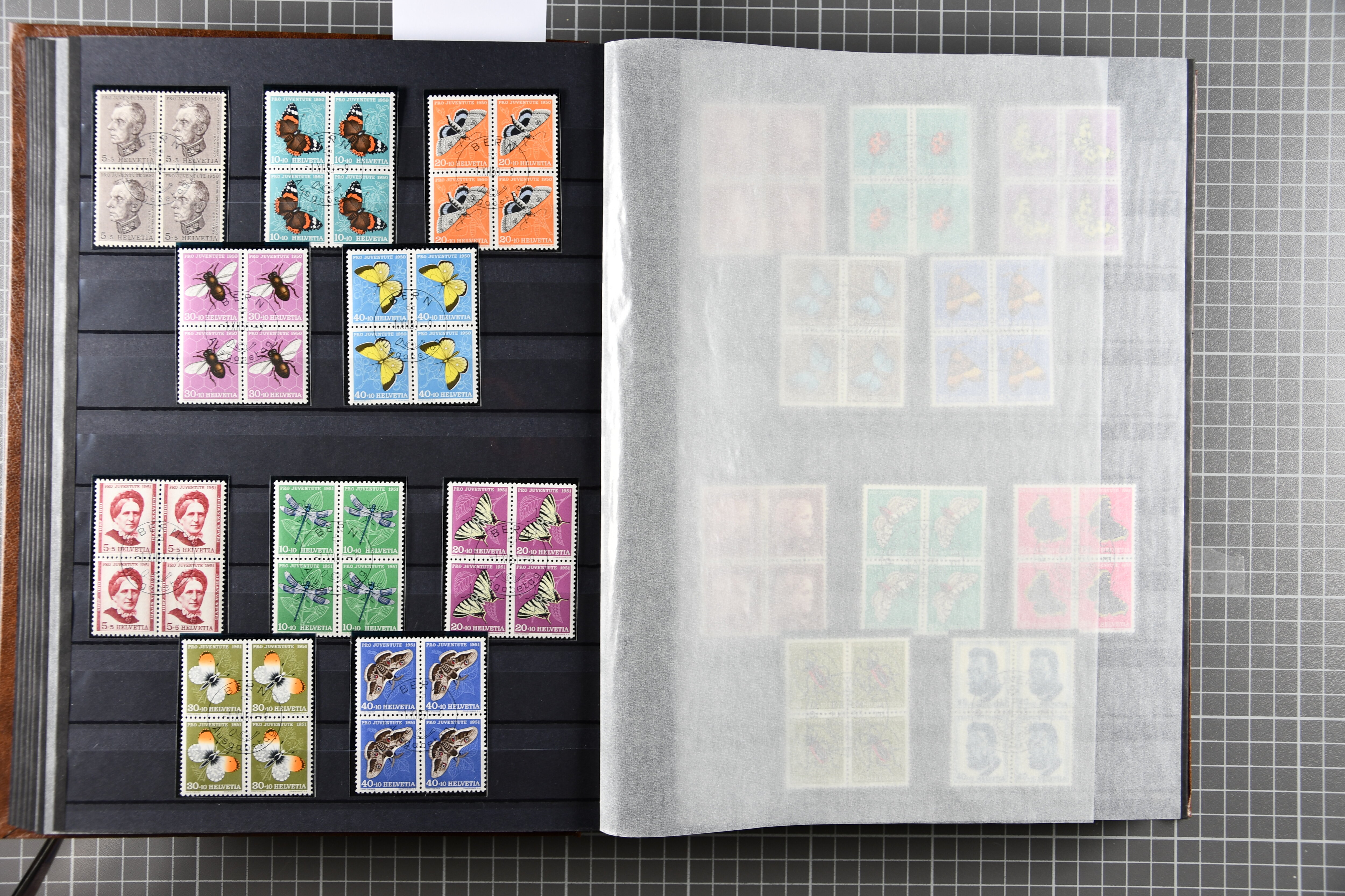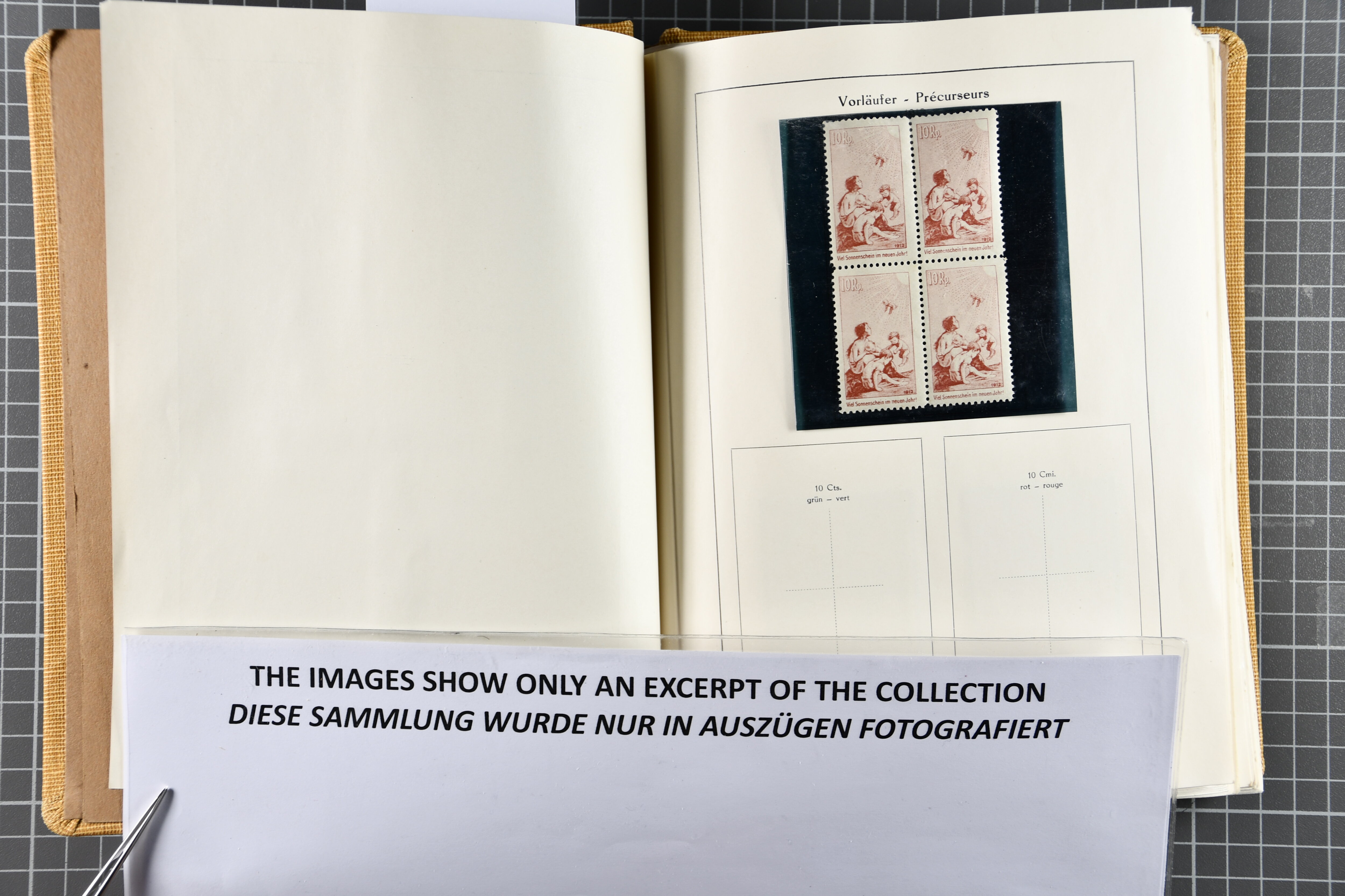 Blockausschnitten 1941 zusammen klar entw. am Ersttag mit Halbmondstempel "SCHWEIZ. POSTMUSEUM 1.XII.41", je einem postfrischen und einem schön gestempelten Kehrdruckbogen 1953 und 1954 5 Rp. "Jeremias Gotthelf" mit Doppelprägung (SBK J153DP) postfr.